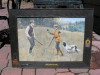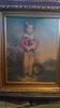 color print or painting.frame has raised carvings or plaster objects on frame,hunting vest,gun,game pouchbronze caption plate,CONCILIATOR,and a.b.frost