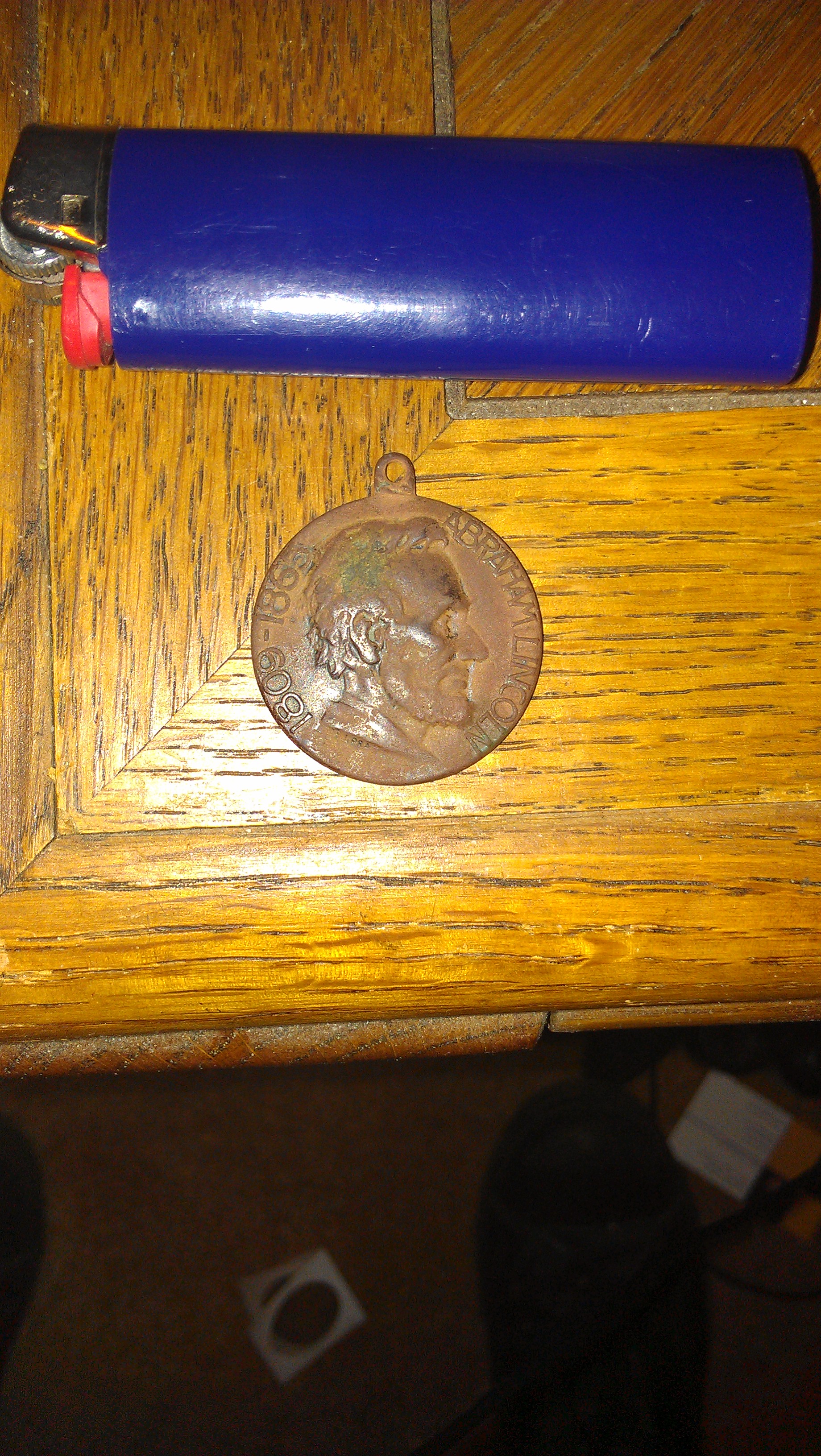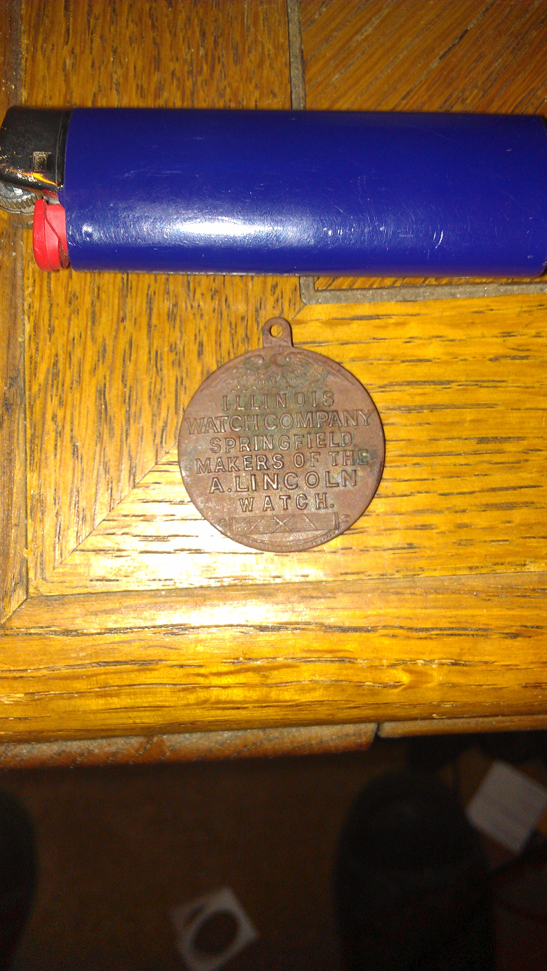 abraham lincoln illinois watch company fob. It is in fairly good shape barely any petina every thing is legiable. Was found at garage sale in box of "junk". Not to knowledgeable with these items so excuse the brief description