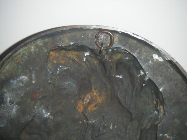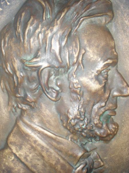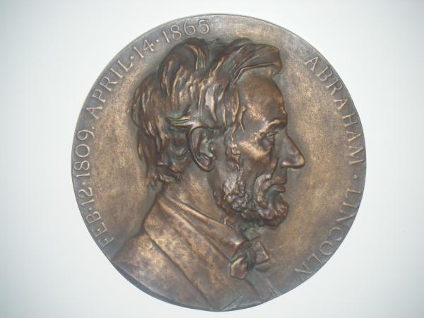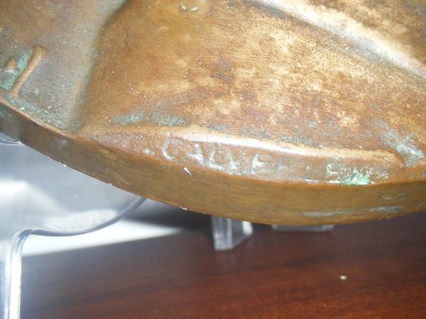 It's a Sculpture Abraham Linclon copper penny with the signature "Calverley" (not very clear). It has Abe Linclon D.O.B. Feb 12, 1809 and date of assination April 14, 1865. Can be hung on wall as art.
