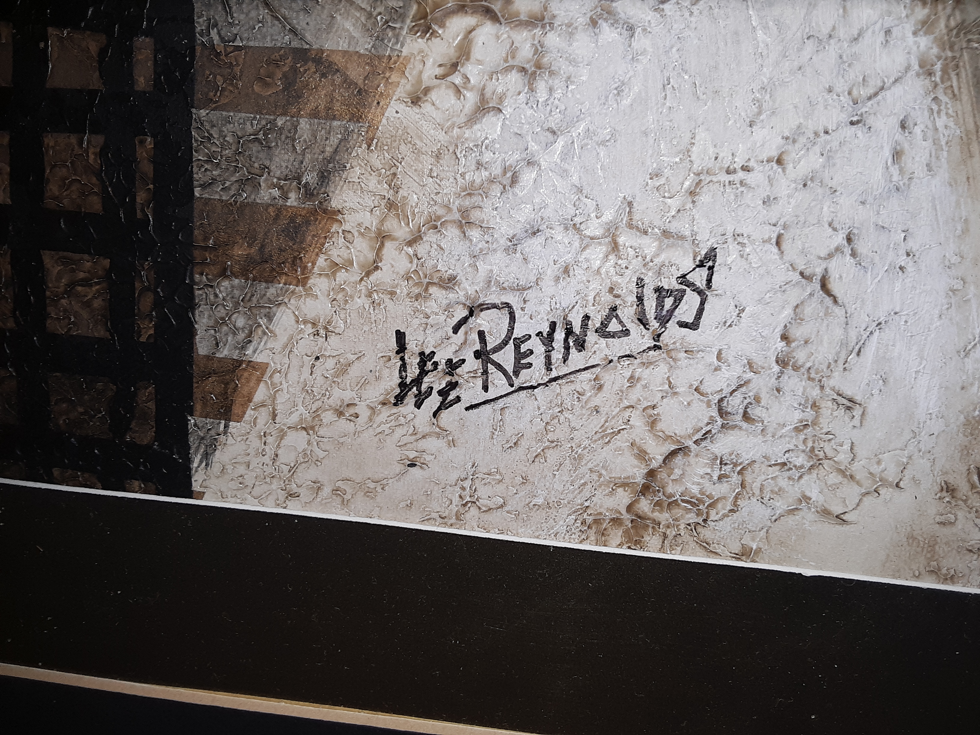 Vintage oil on canvas abstract painting by Lee Reynolds. 36" x 30" Framed in a gold frame by art studio. Painting number on back of painting