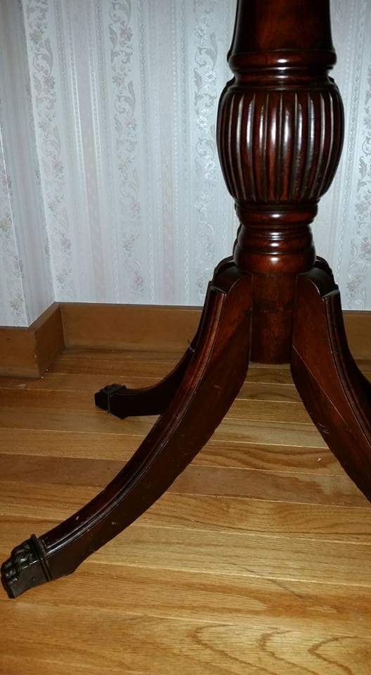 Unsure of a manufacturer, can't find anything on the table. On the bottom is written "2170 moms nov" I think. Top folds out to larger square table. Metal caps on claw feet. Very detailed, very gorgeous.
