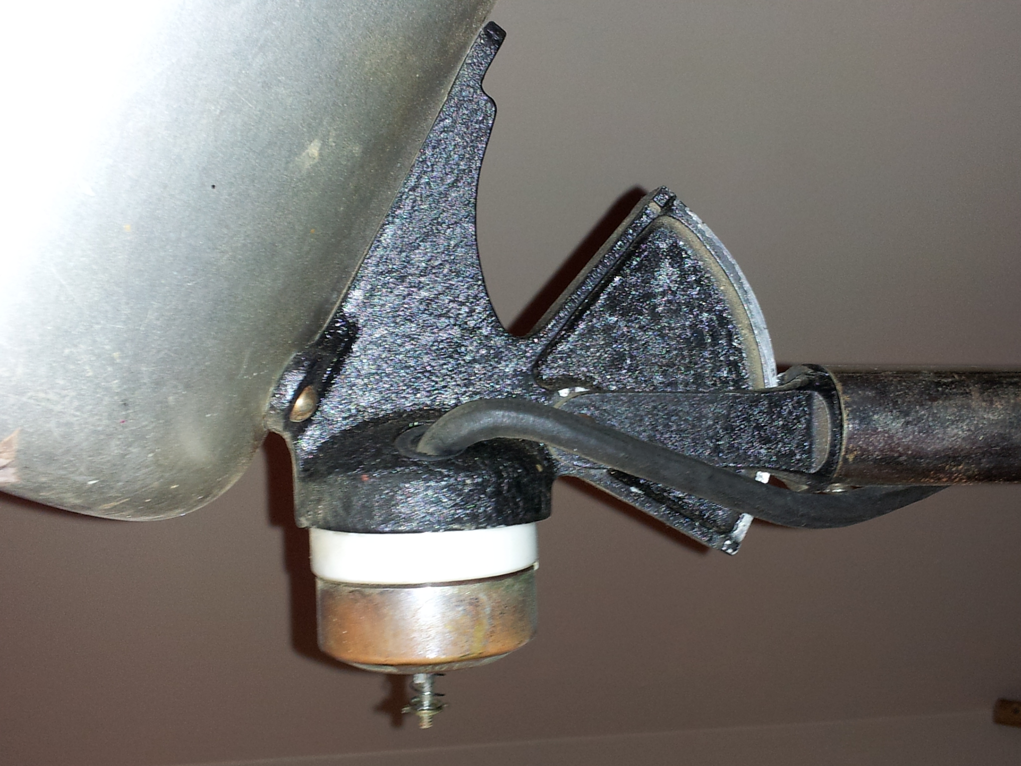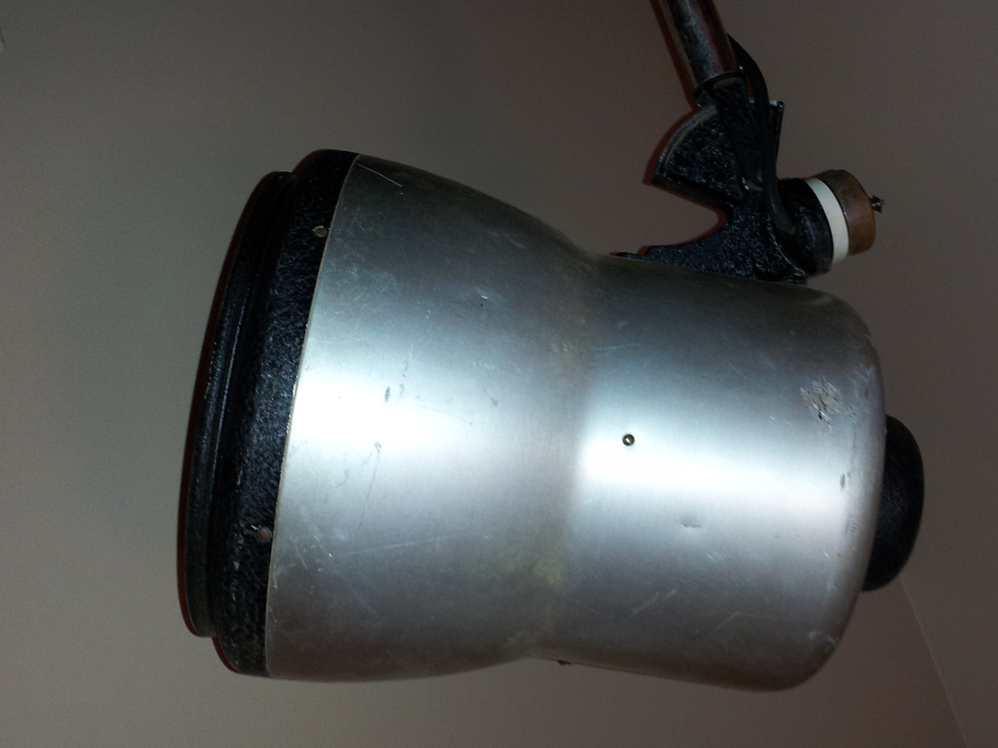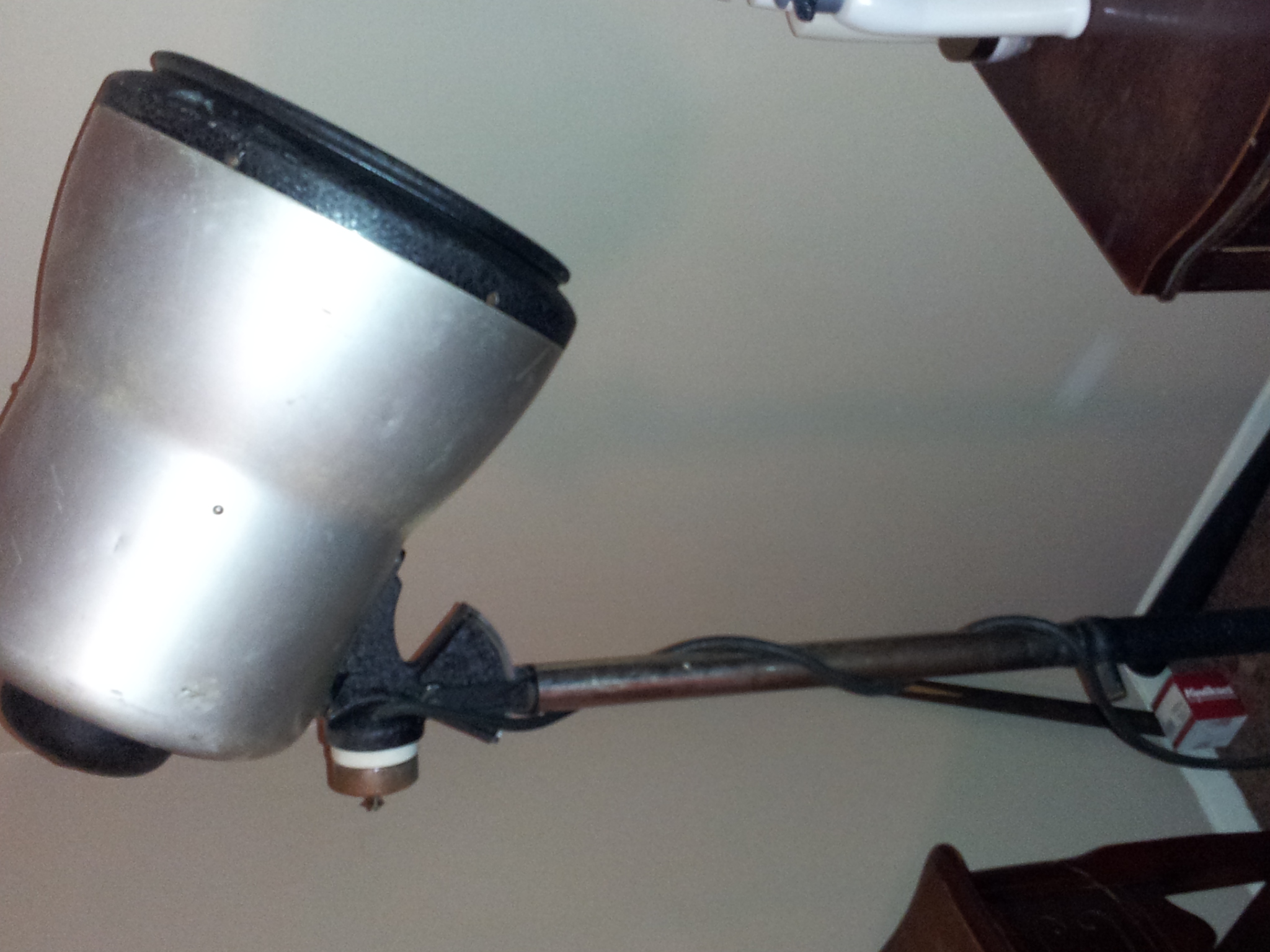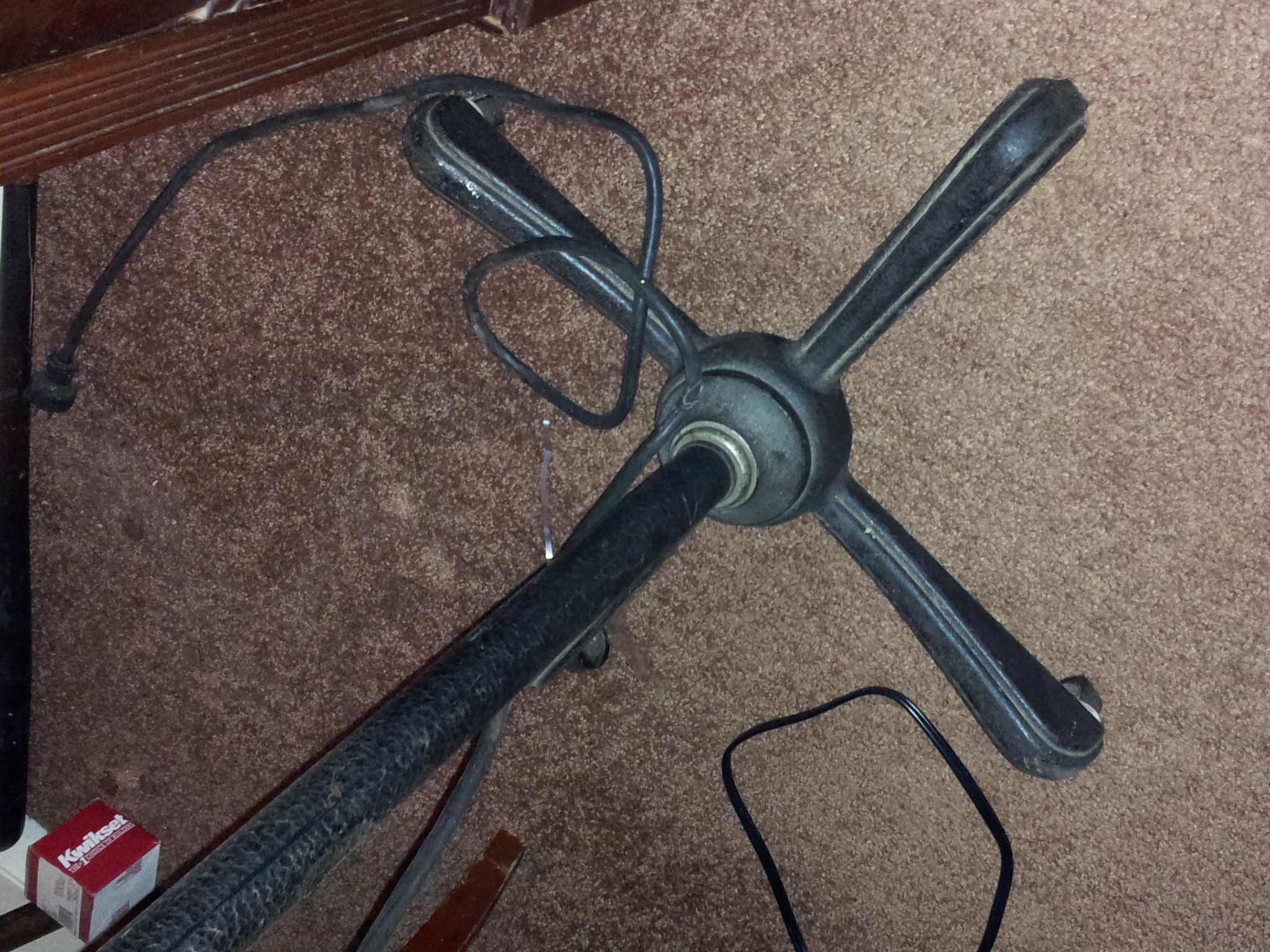 Has cast iron base with adjustable steel and iron stand, has domed aluminum cap with steel tilt adjuster. And steel and porcelain knob for setting of off, hot, warm,& cold. Long cord, has blower and heating element in dome cap. Is missing knob