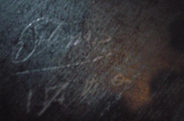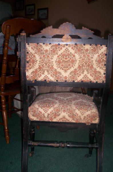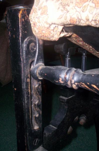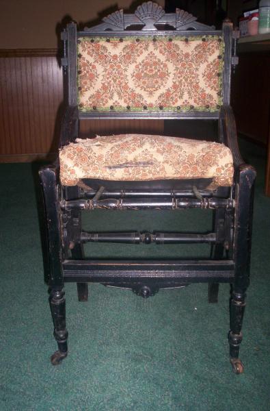 I just got this chair yesterday. It is wood, not sure what type, with cushion seat that has seen some wear. The seat lifts up and down. Not sure on age or where it was made. There is what appears to be a signature on the bottom of the seat, but not sure what it says.