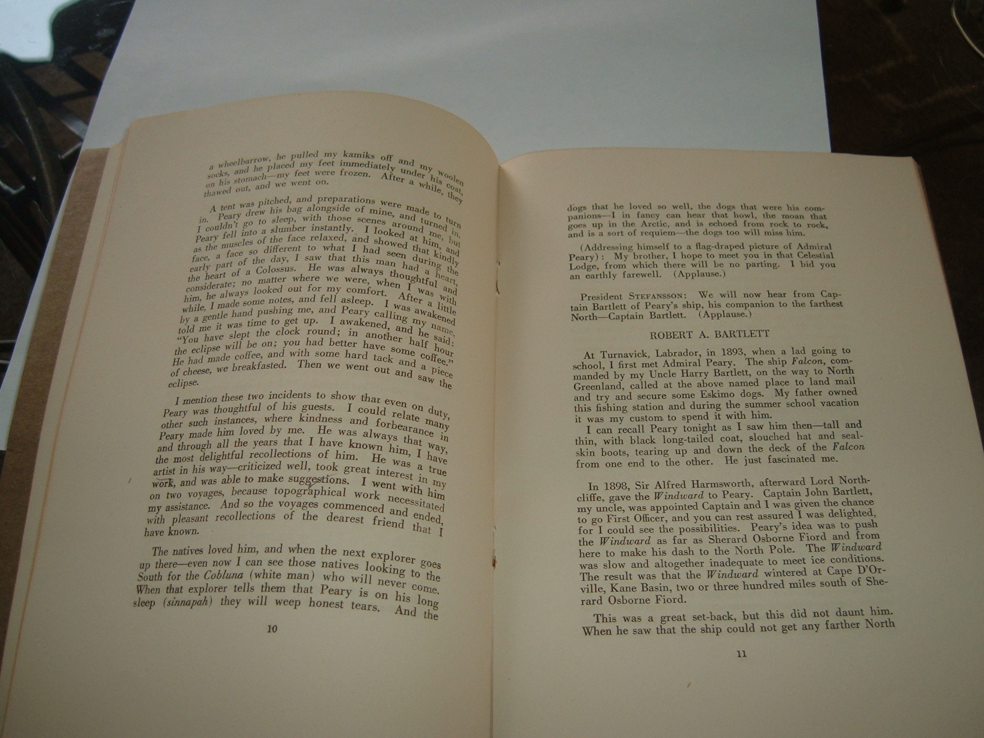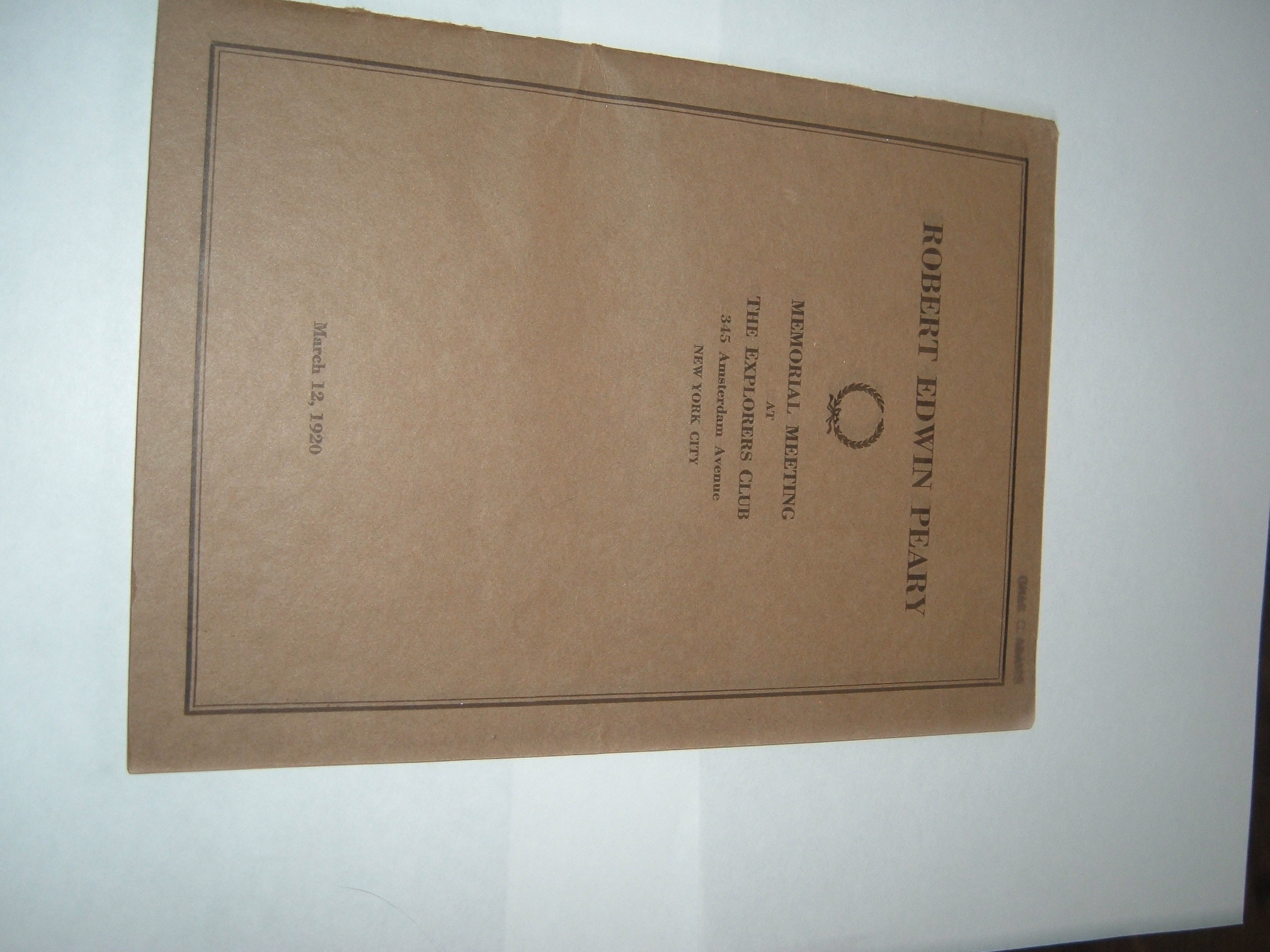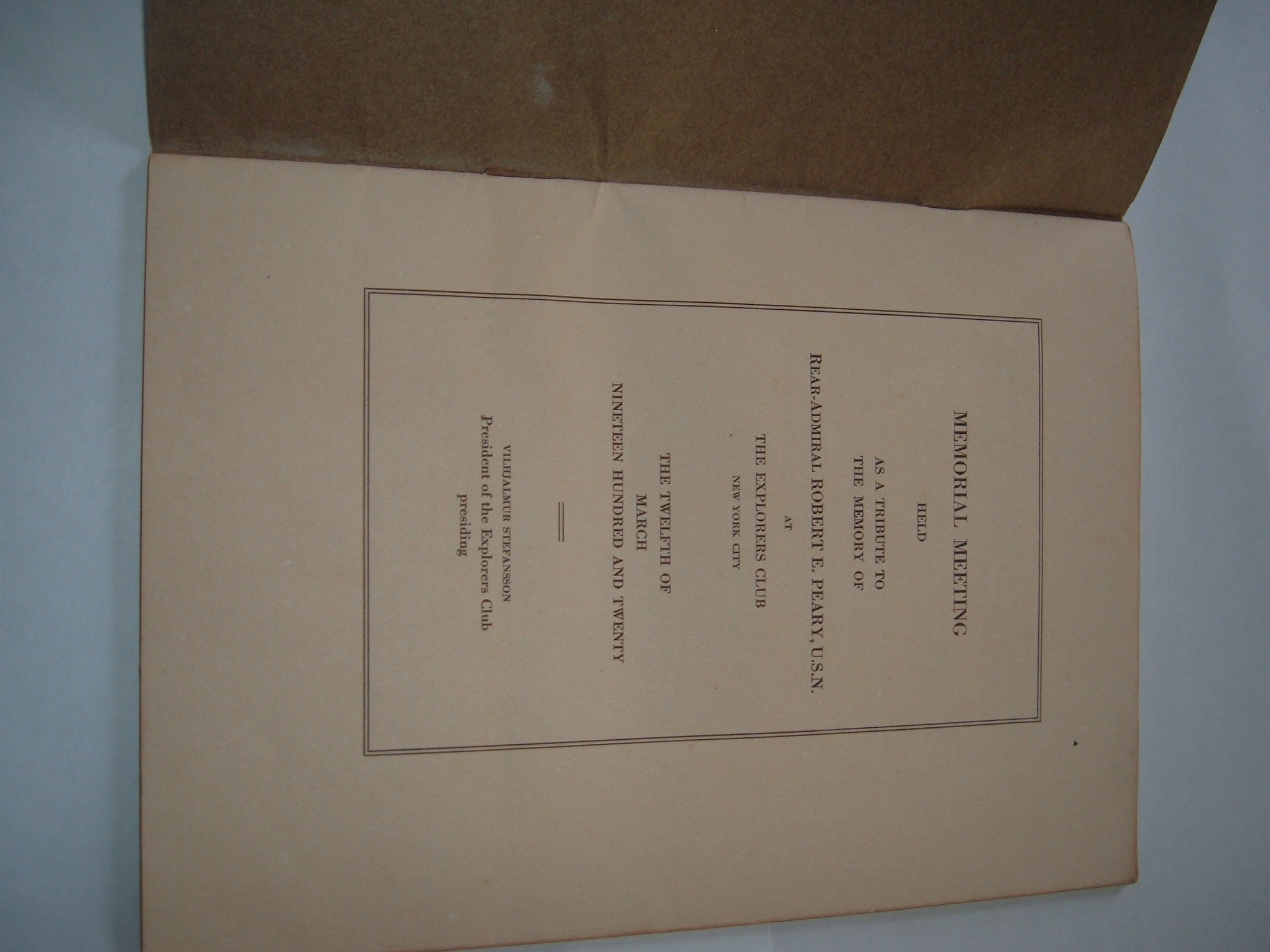 This is a printed, stapled transcription of a resolution and memorial meeting held in honor of Admiral Robert Edwin Peary on March 12, 1920 at the Explorers Club in New York City. It contains transcribed remarks by Vilhjalmur Stefansson, the club's presiding president on that date, as well as those of Albert Operti, Robert A. Bartlett, and Herbert L. Bridgman, which detailed Peary's accomplishments and and their personal reflections on his career. The booklet is 22 pages, with a separate cover. The text contains some light check marks and underlining, which appear to be contemporary to the print date.