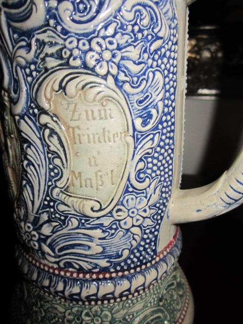 History Features a Relief Tavern Scene and German Phrases on the Sides! Behind the Handle and on the base is the Form Number "38"! The Base is Deeply Recessed and Marked "D.R.G.M. 154927", "Germany", and "Gesetzlich - Geschutzt"! This Stien was Manufactured by the Famous High Quality Stein Maker Adolf Diesinger and is Approx. 11" High to the Tip of the lid. There are a couple of small chips on the base, not that noticeable and the pewter top ring around the handle that secures the lid is not snug but a little loose. Otherwise it's in perfect condition. It is also marked 1/2 L on the top of the mug by the handle.