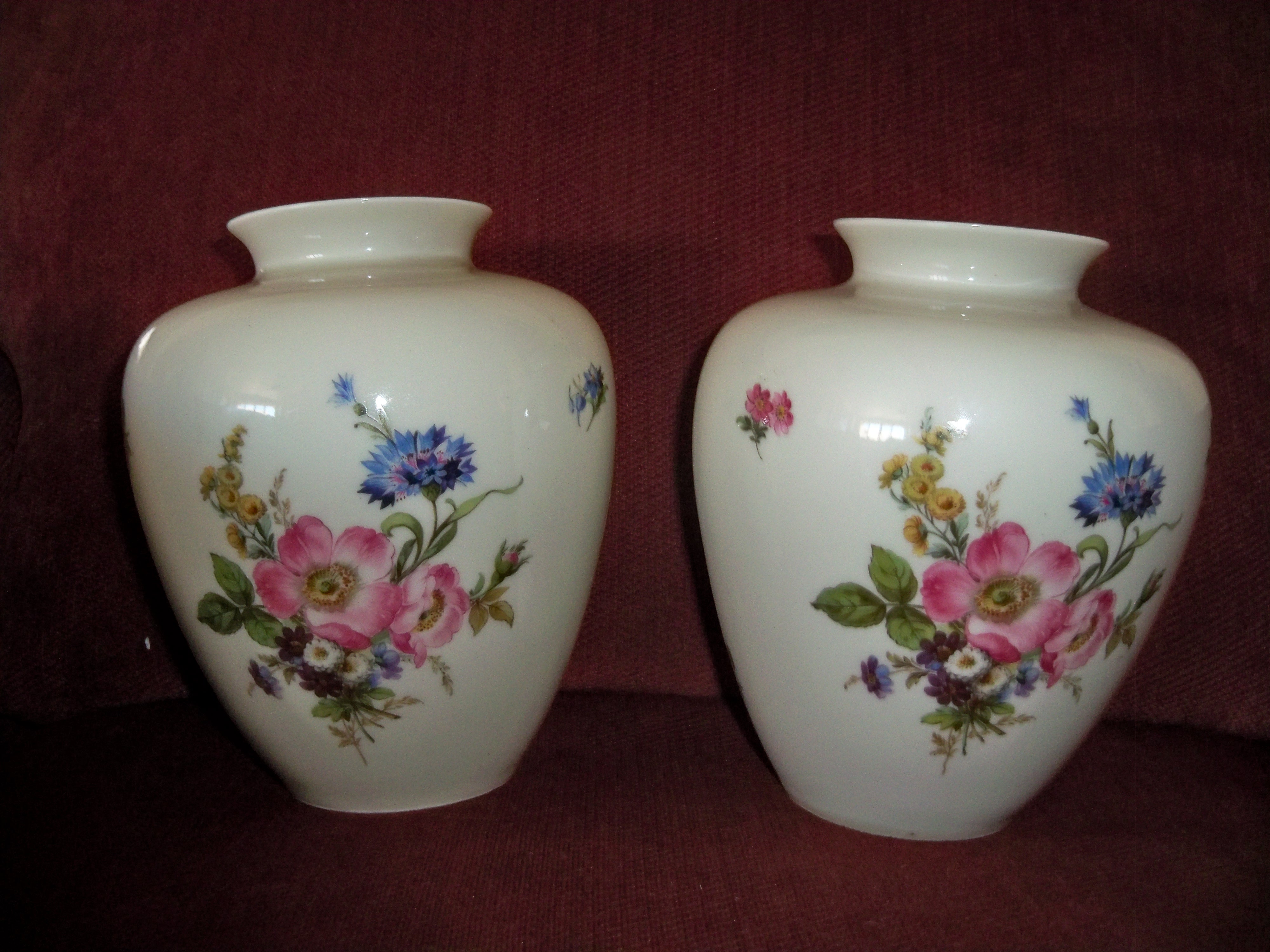 Set of China Vases, flower pattern on both sides, gold trim on rim of vase.