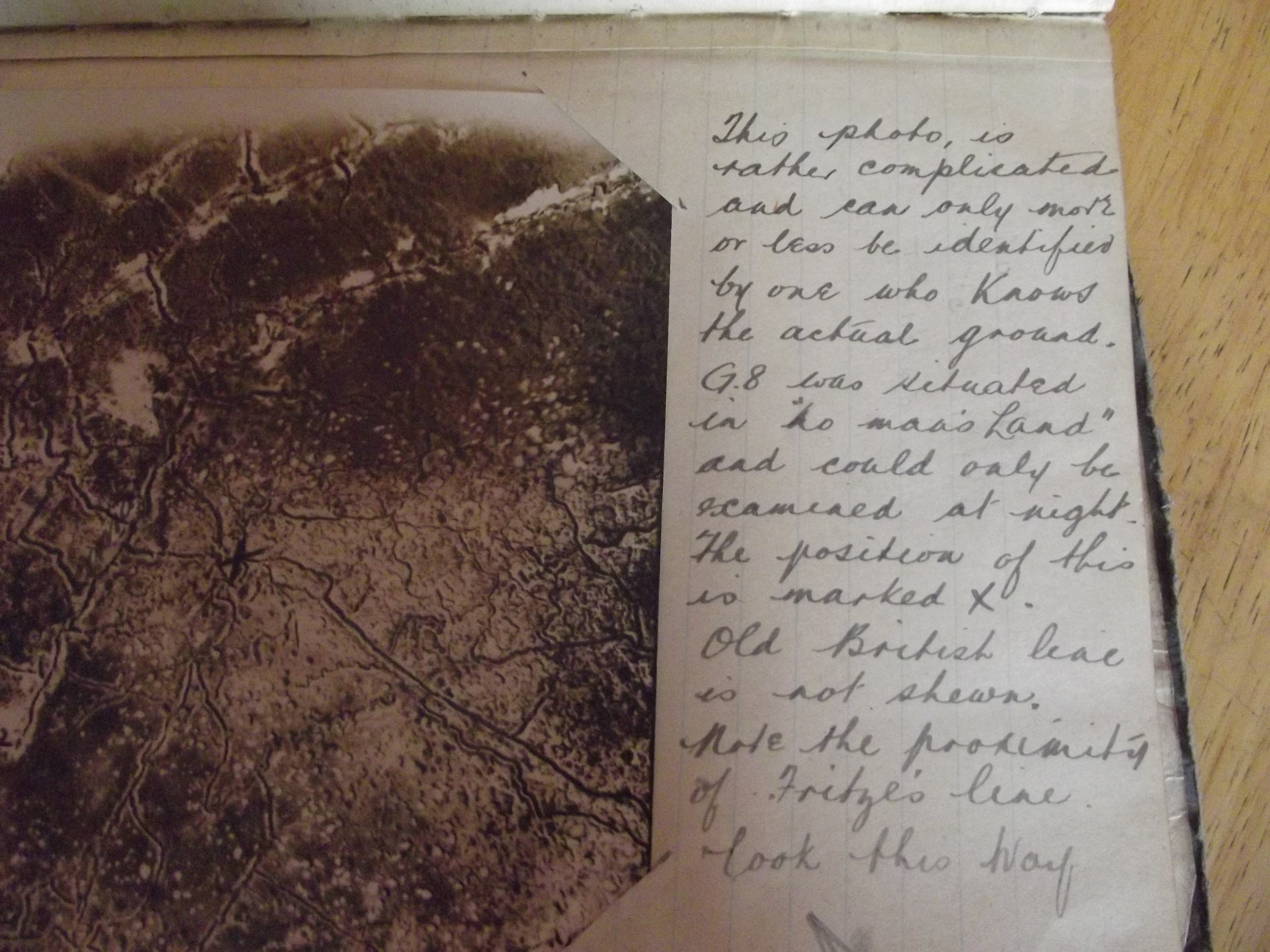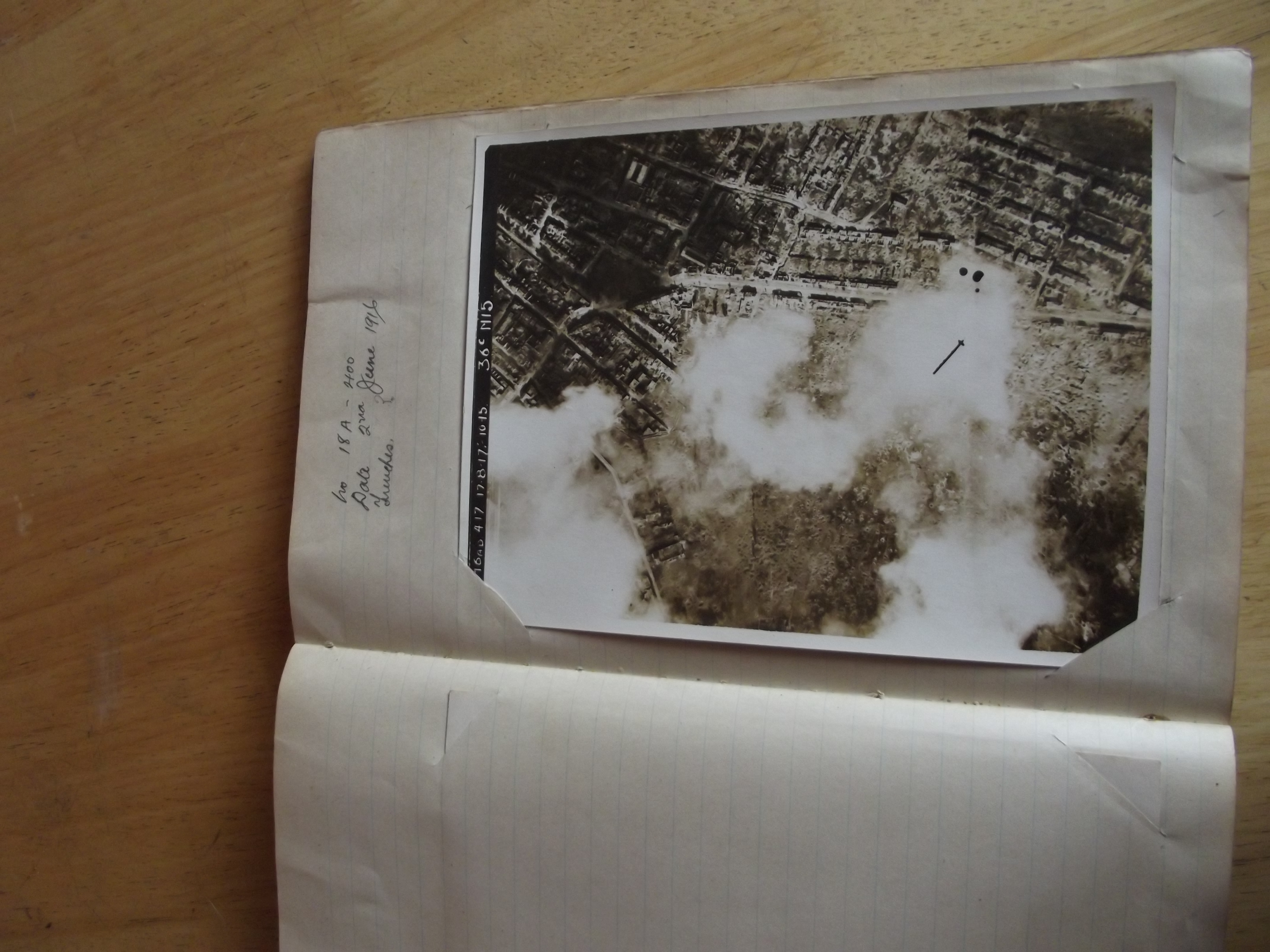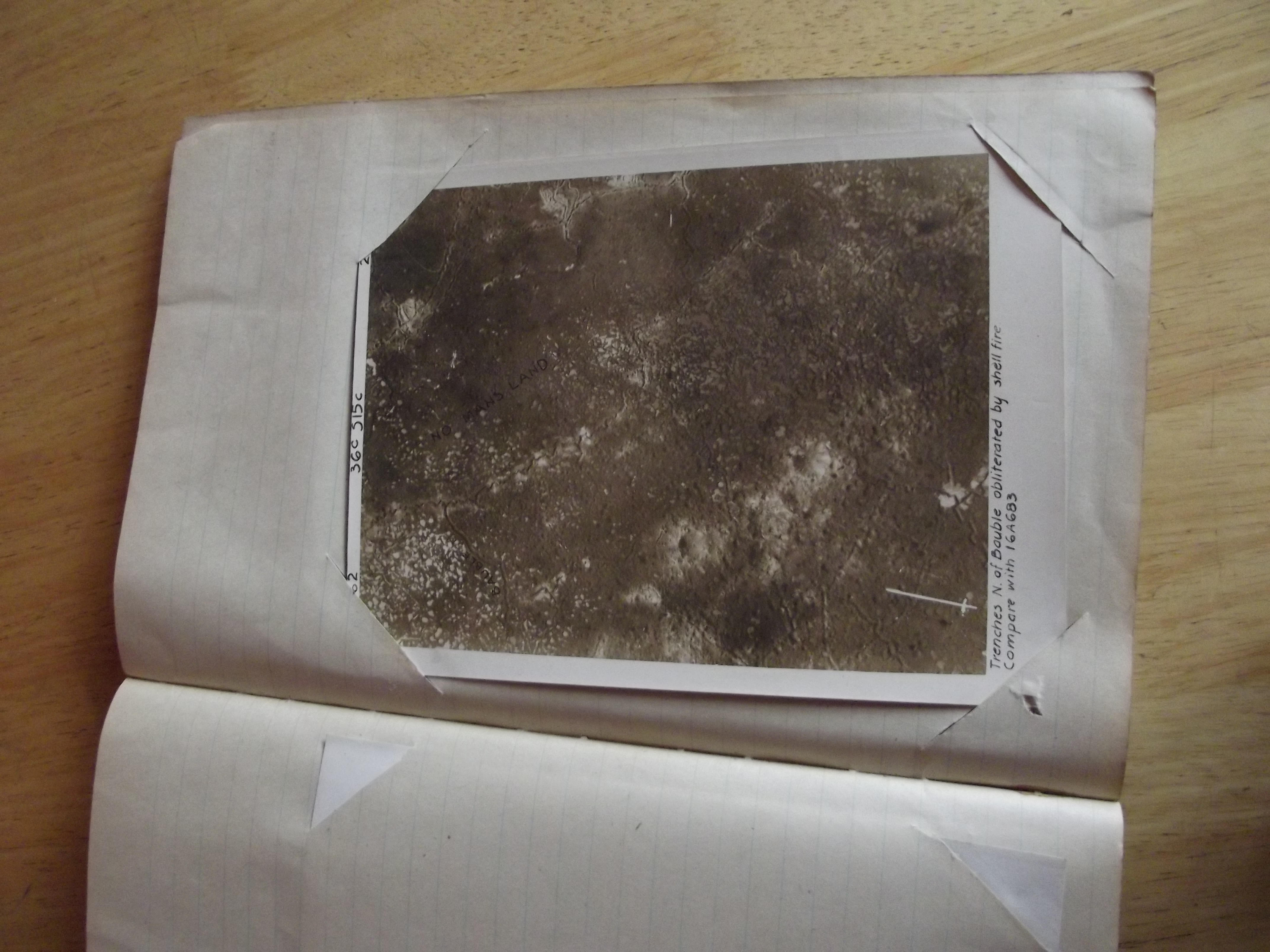 1916 areal reconnaissance photograph album. Original album, contains 55 photographs (6 & 1/2 inch by 8 & 1/2 inch. The photos cover the zouave valley & surrounding area from february to july & show trenches, bomb craters & german lines. Many of the photos have hand written notes along side. On the back the photos have official stamps. The outer cover is quite dog eared but inside the album is in good condition.
