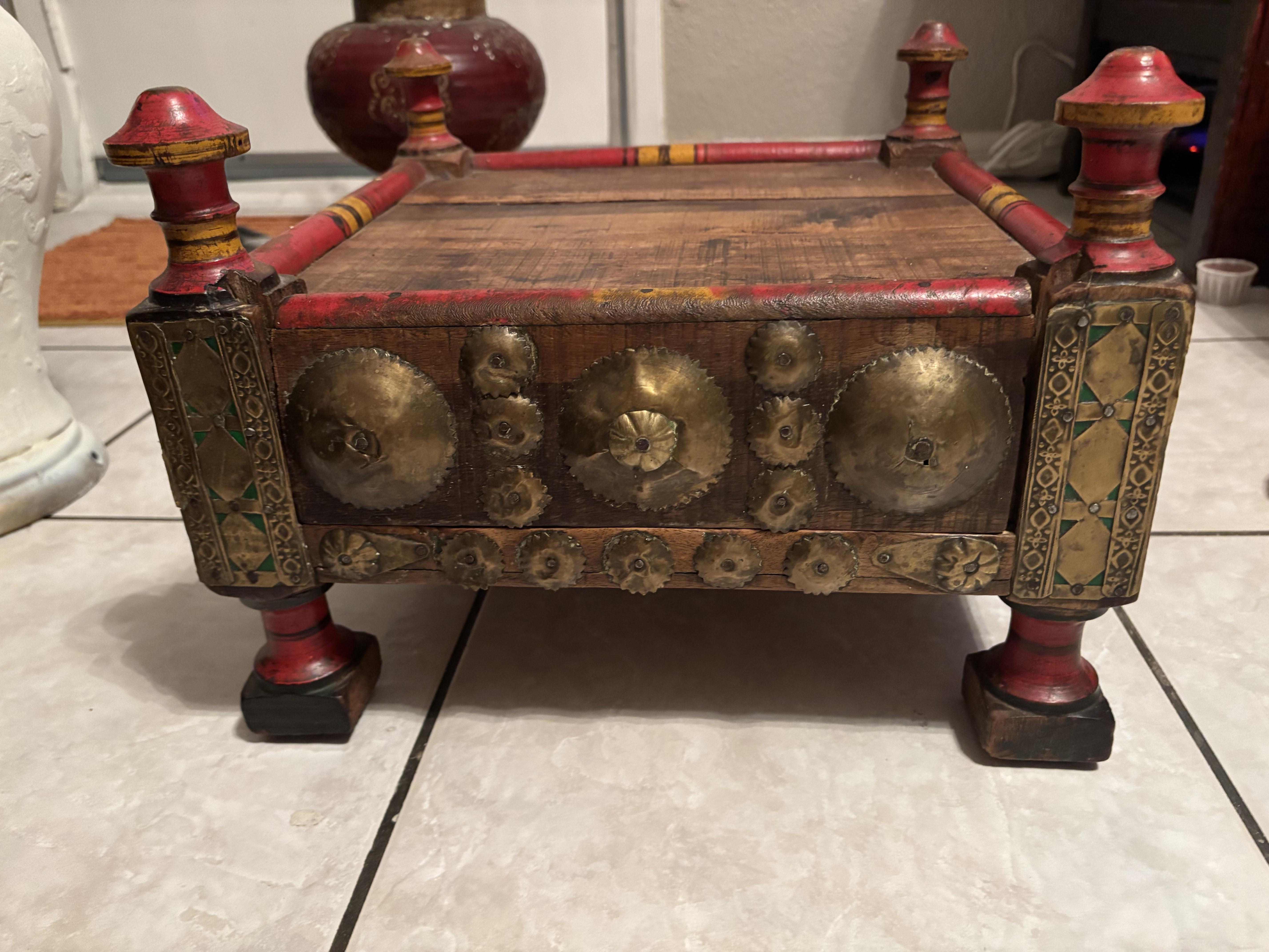 This low table is believed to originate from Afghanistan, a region known for its rich cultural heritage and craftsmanship. Such tables were traditionally used in homes for various purposes, including serving food or as decorative pieces. The combination of wood and brass is typical of Afghan furniture, showcasing the artisanship of the region.