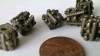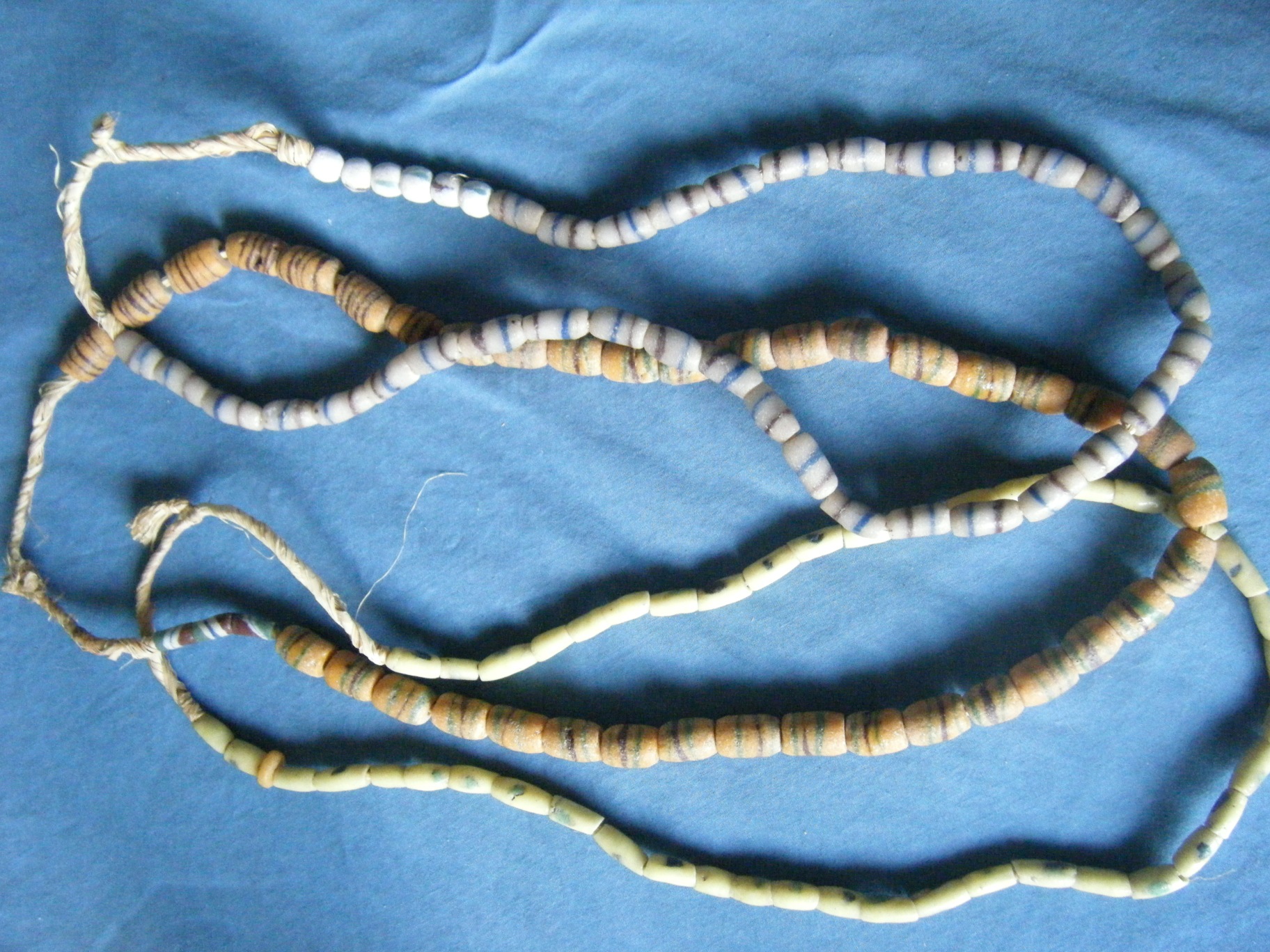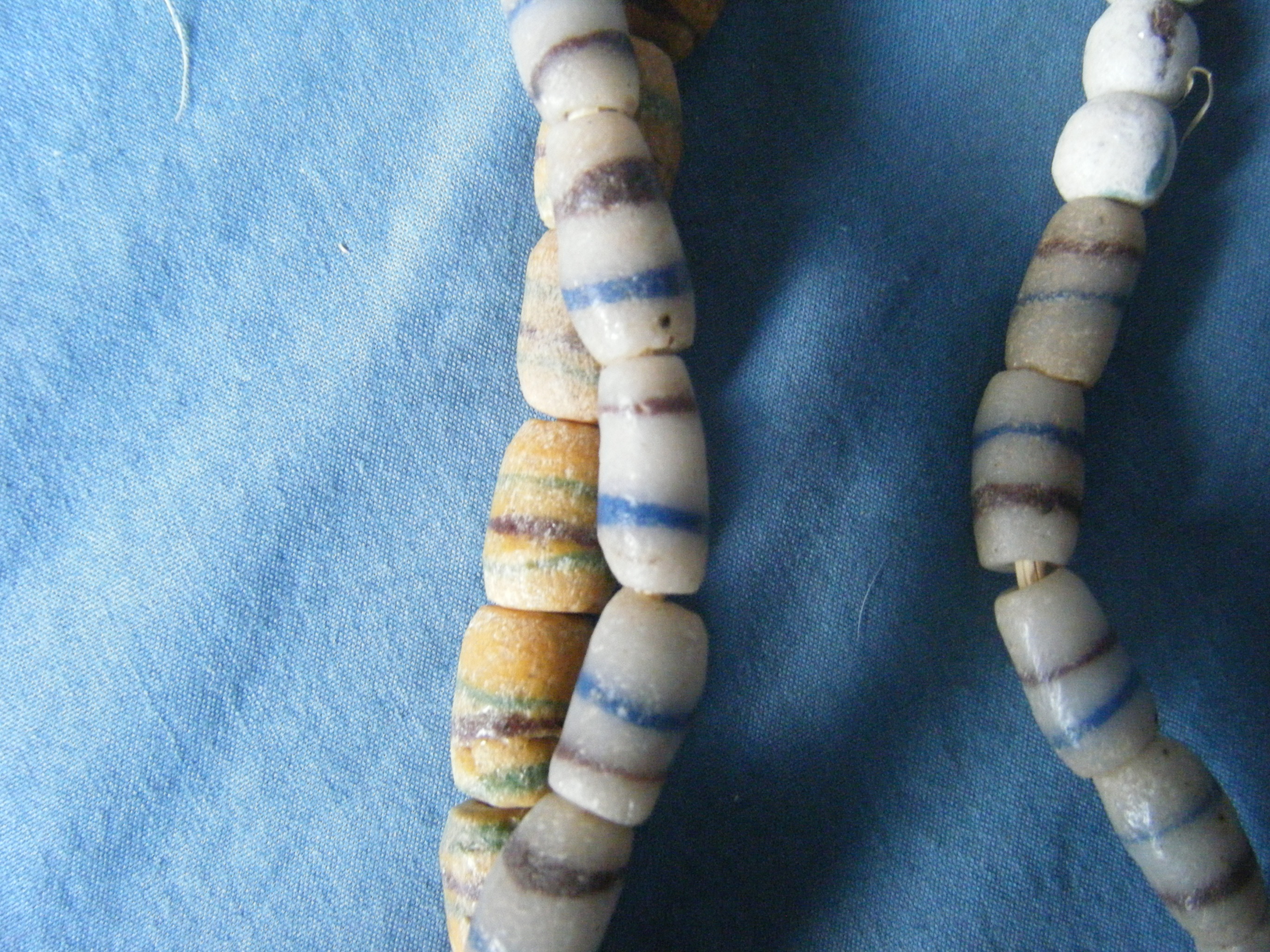 The light greyish tinted beads have dark and blue stripes (1 each) and are slightly grainy to the touch.