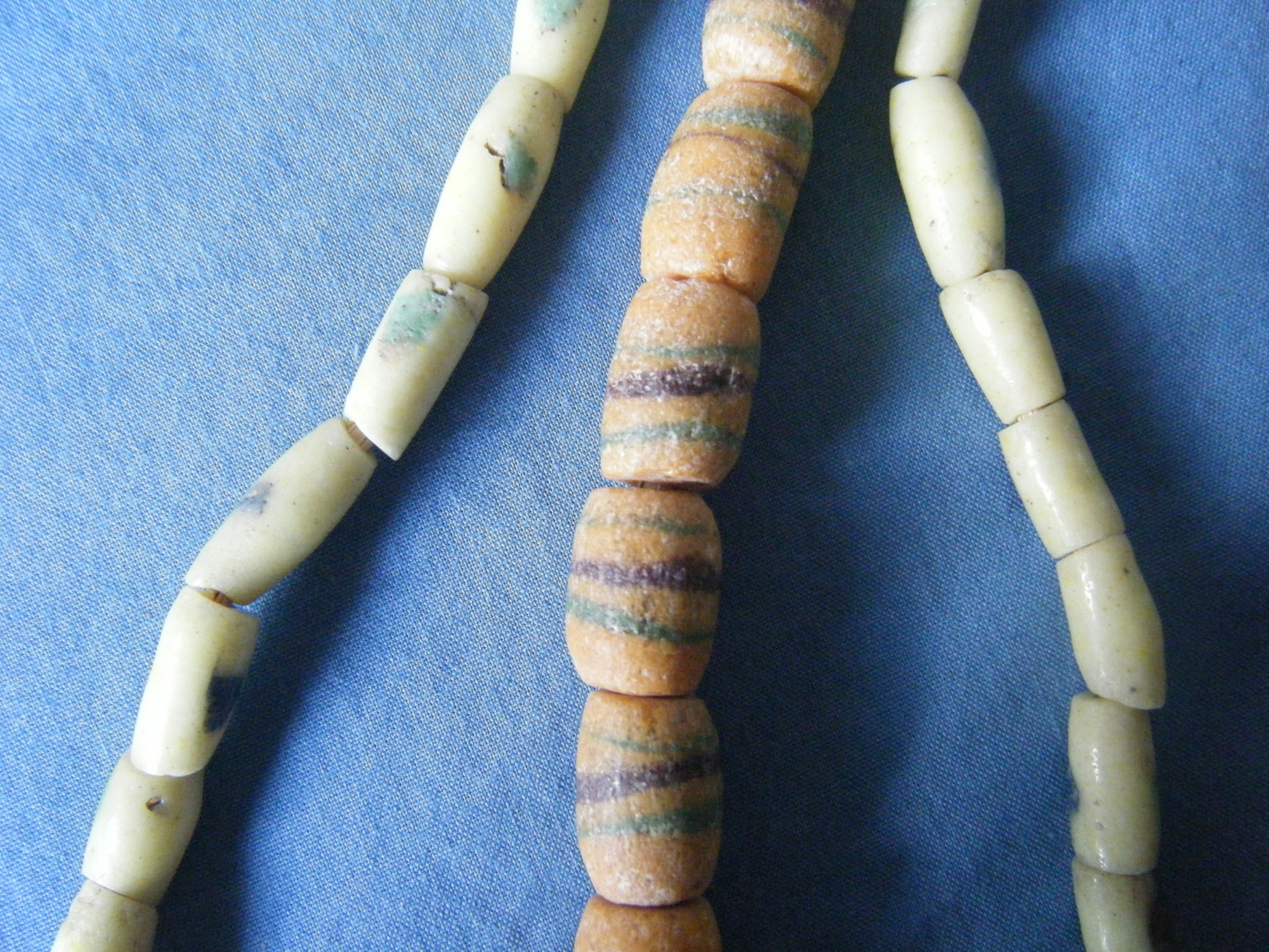 The white/yellow beads are have dots, some with blue and some with grean They are smooth to the touch