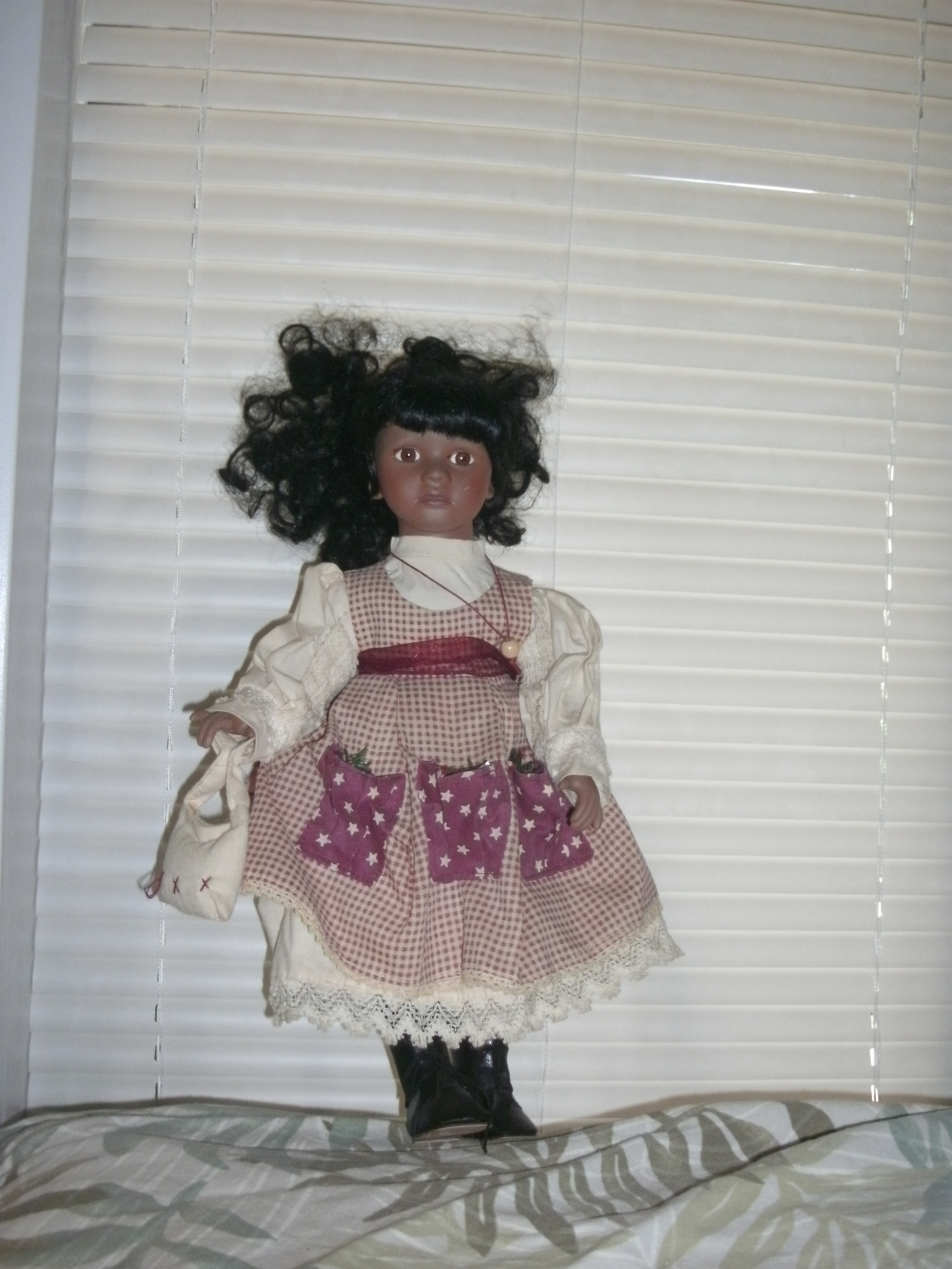 this is and african americas doll, its head and hands are porcelain and the body is cloth