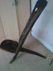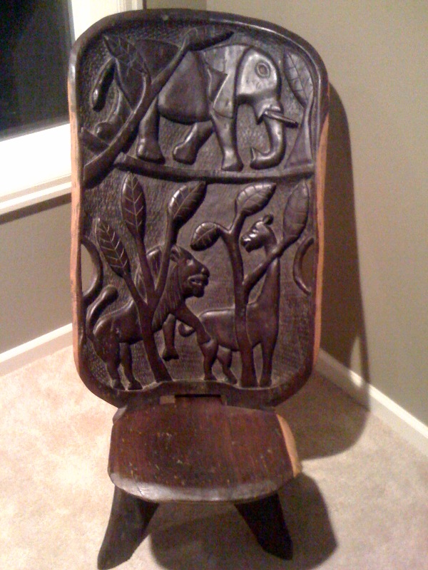 Very heavy carved wood chairs, about three and a half feet tall as shown below. They come in two pieces and you slide the bottom chair into the back rest. I don't know much else I can say beyond what the pictures show. I don't know how old other than the person I bought them from said his parents had them for forty years plus and that they obtained them from a friend in the Navy who travelled all over the world. Any information would be tremedously appreciated.