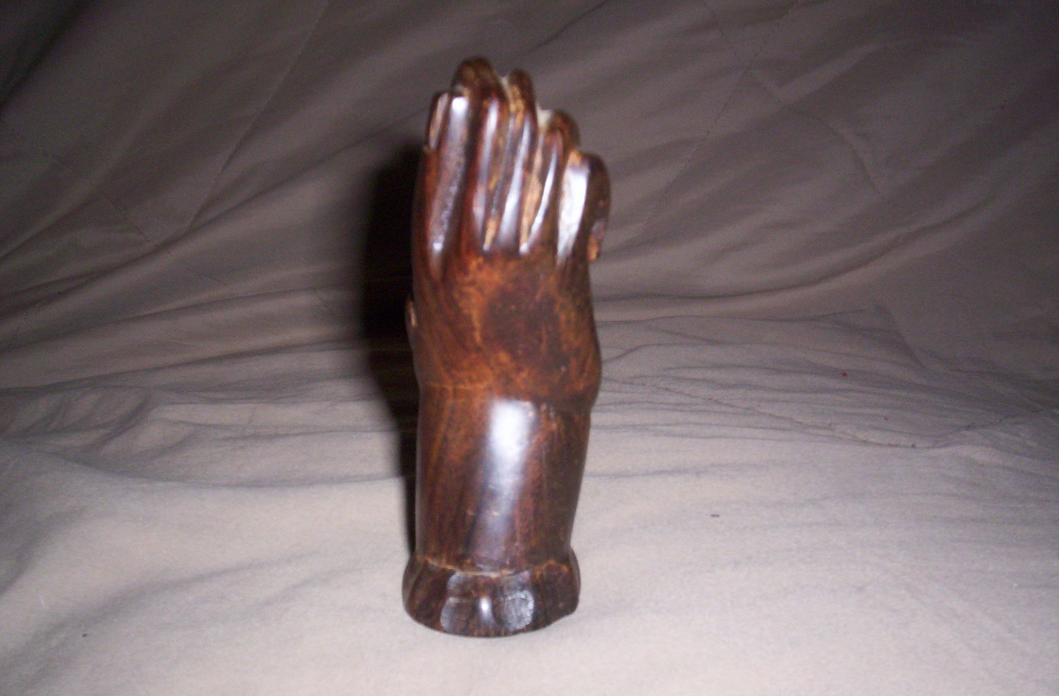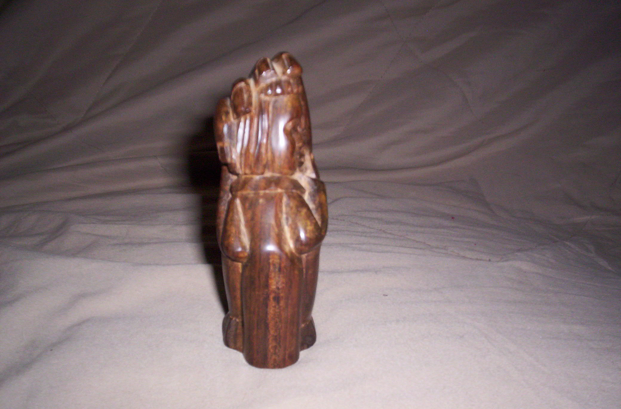 African hand carved fiqurine, small child inside of a hand. Given to a doctor for his missionary work. Belived to be 80 to 100 years old. Given from a leper colony.