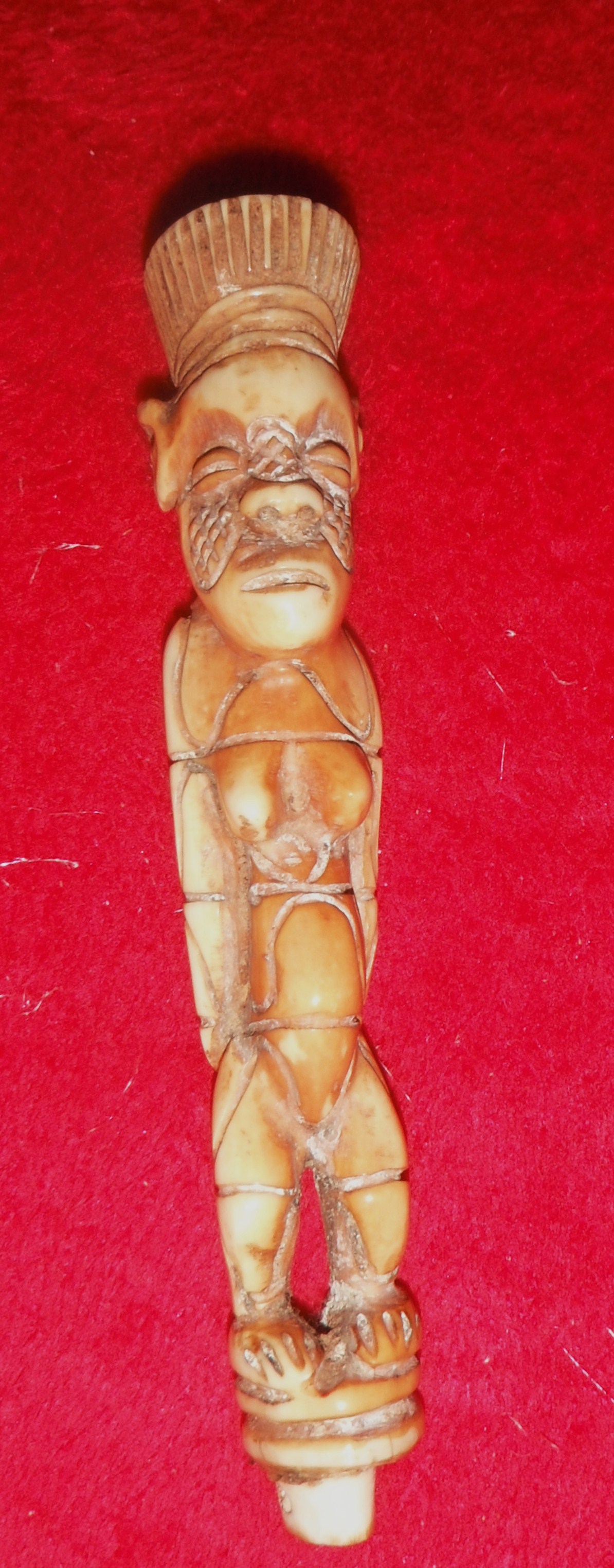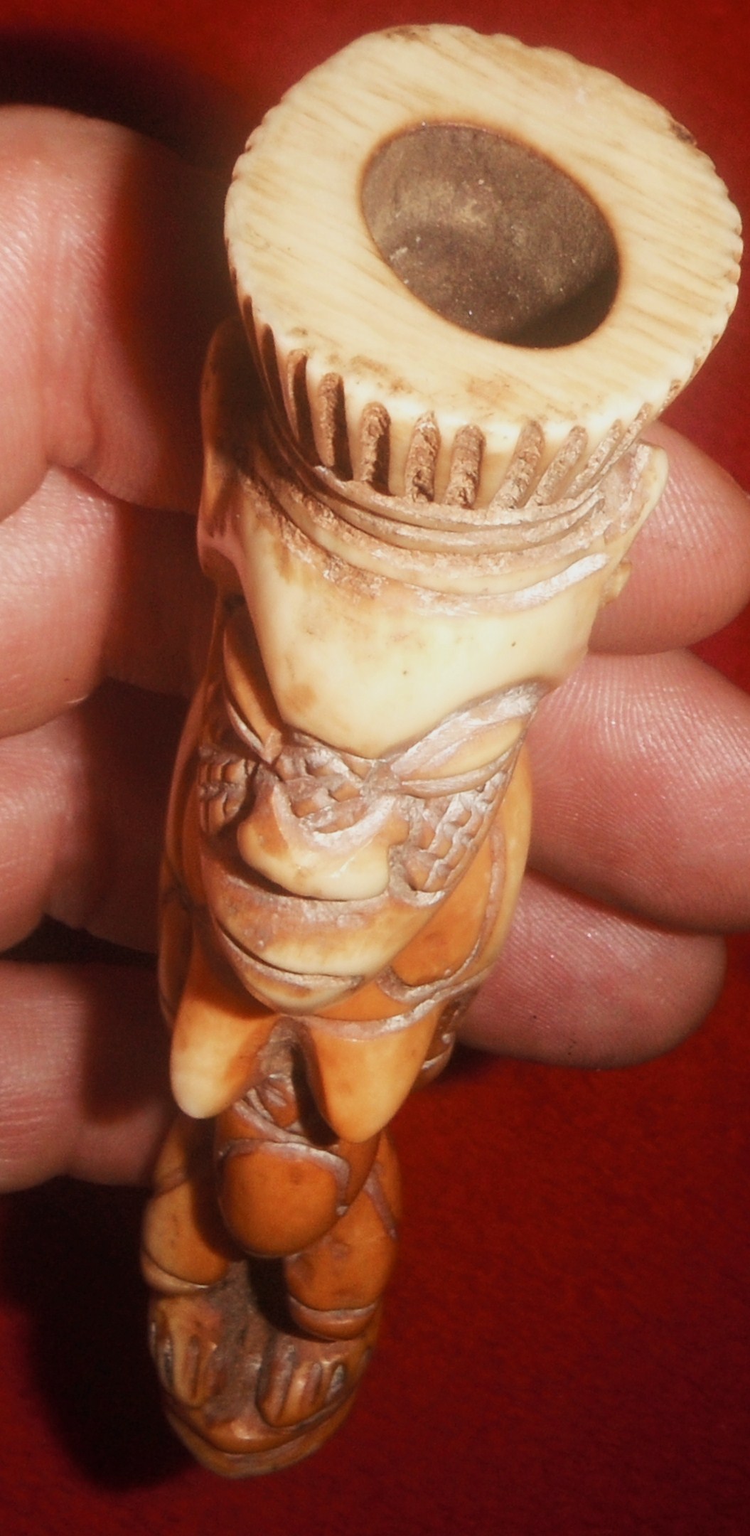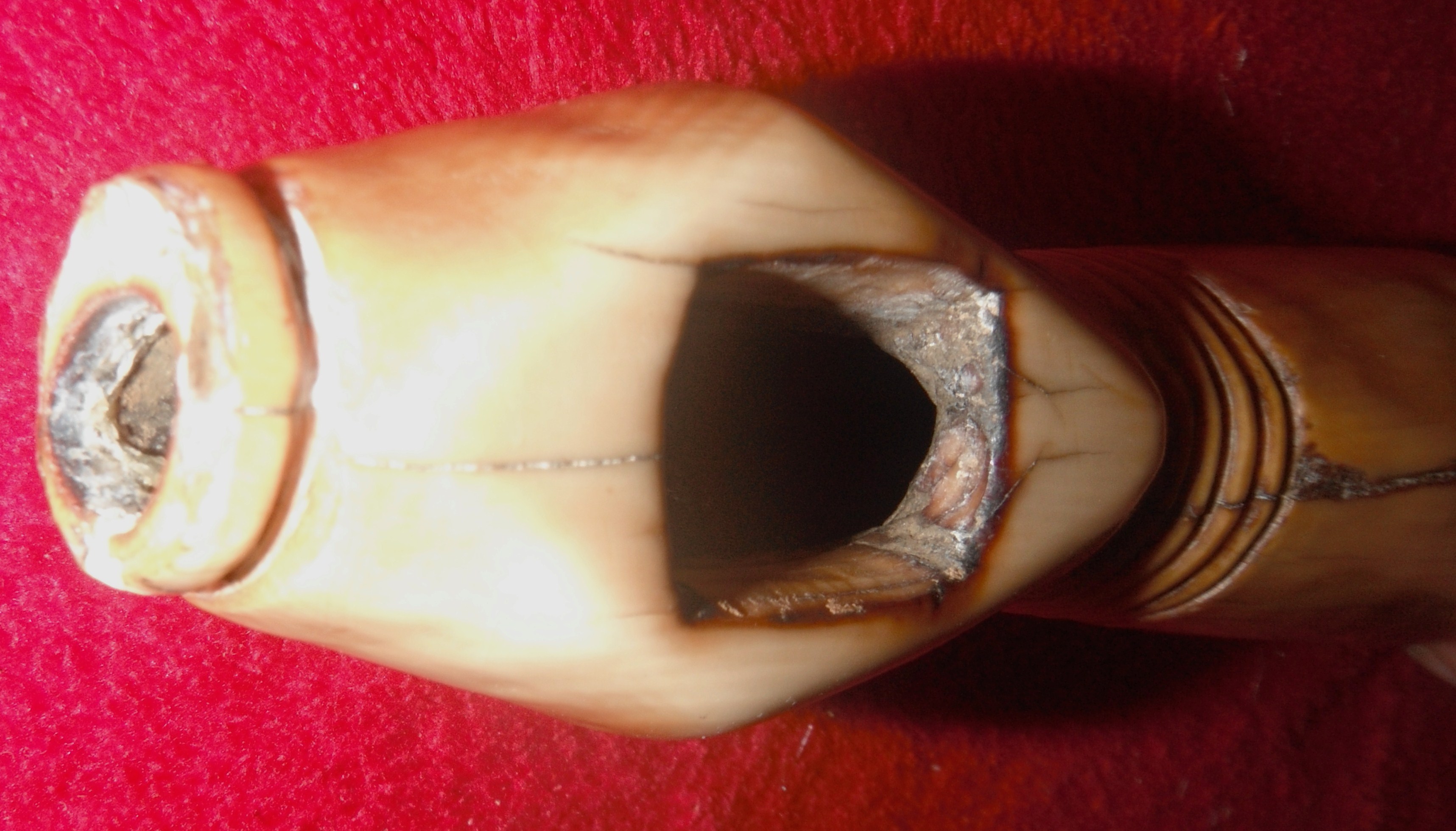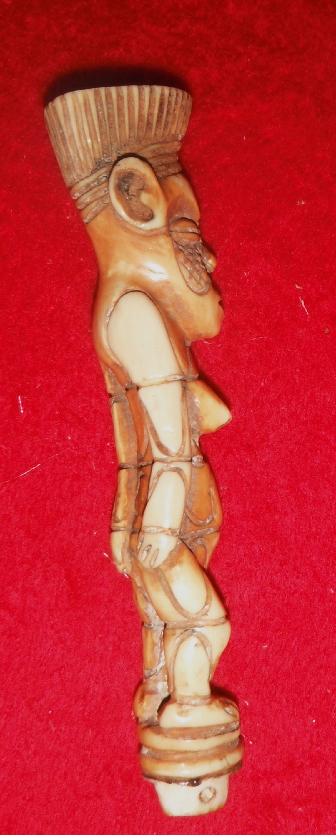 I am not sure what the tusk was used for , possibly a horn or pipe. I will need help with Identification. It has a deep orange patina most likly resulting in repeated applications of palm oil and years of handling. Looks like Congo (Yombe subgroup) but again I'm unsure, and could use help in identification of what culture may have created it. It looks like ivory , but correct me if I,m wrong.