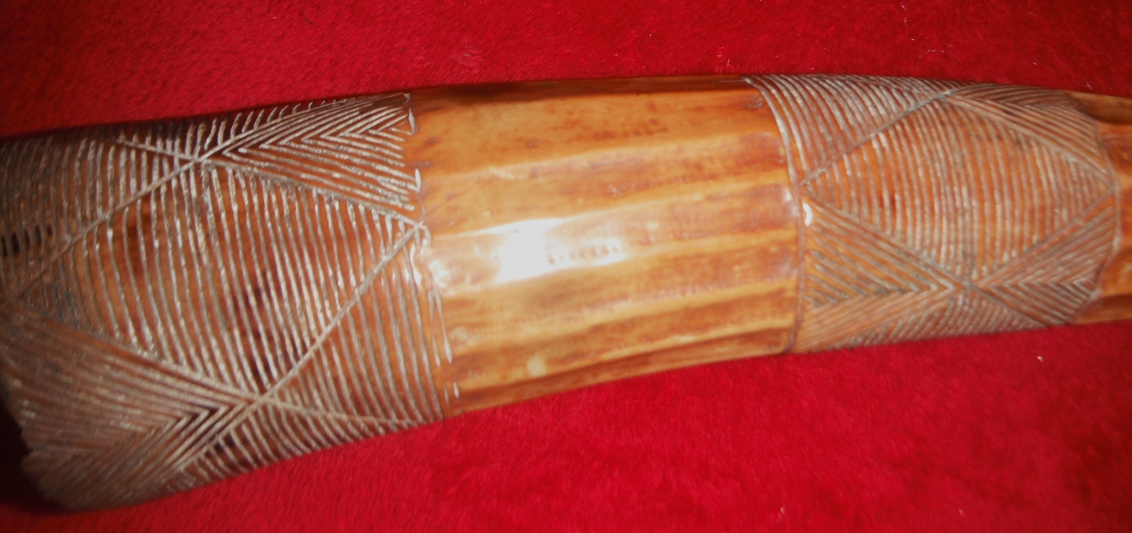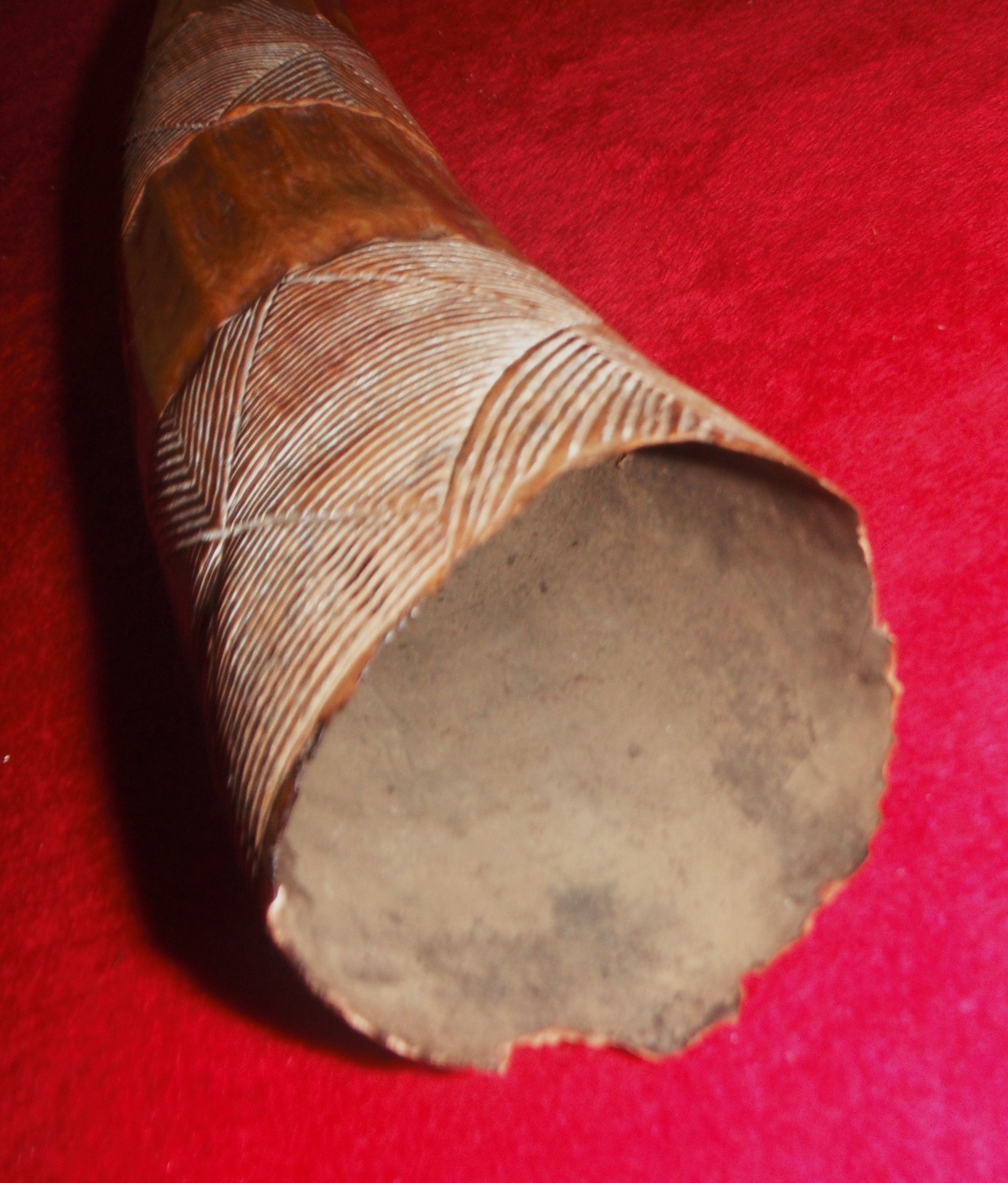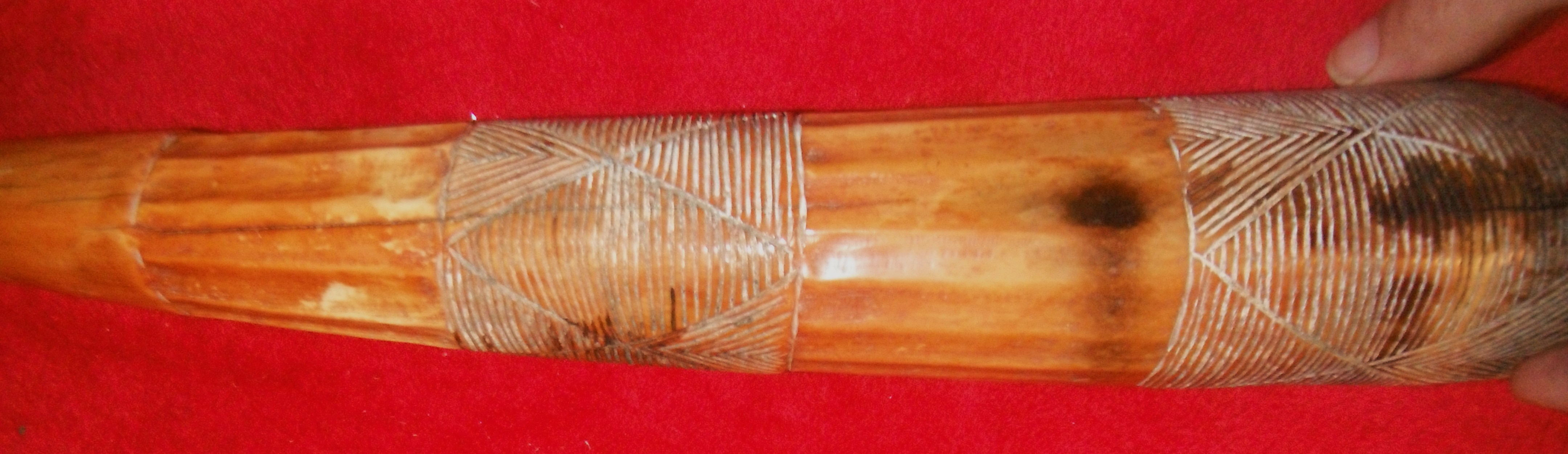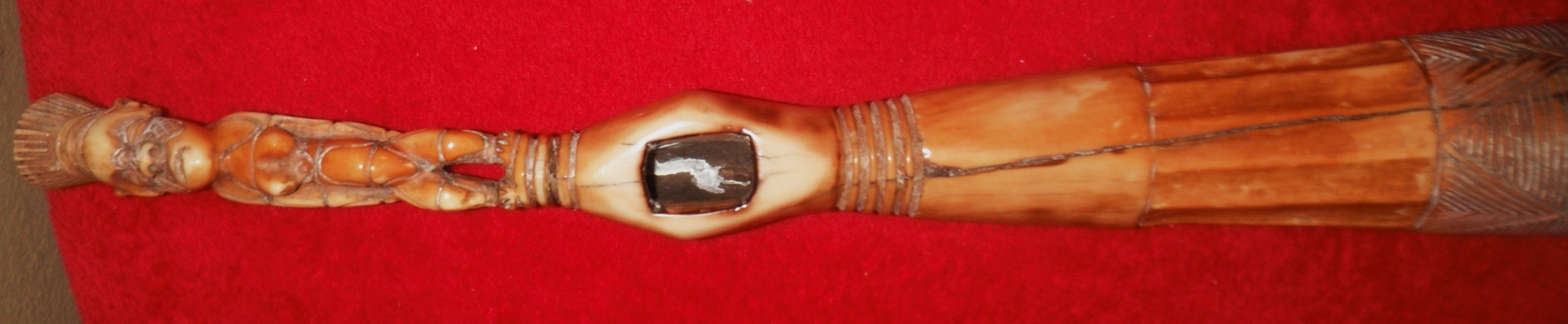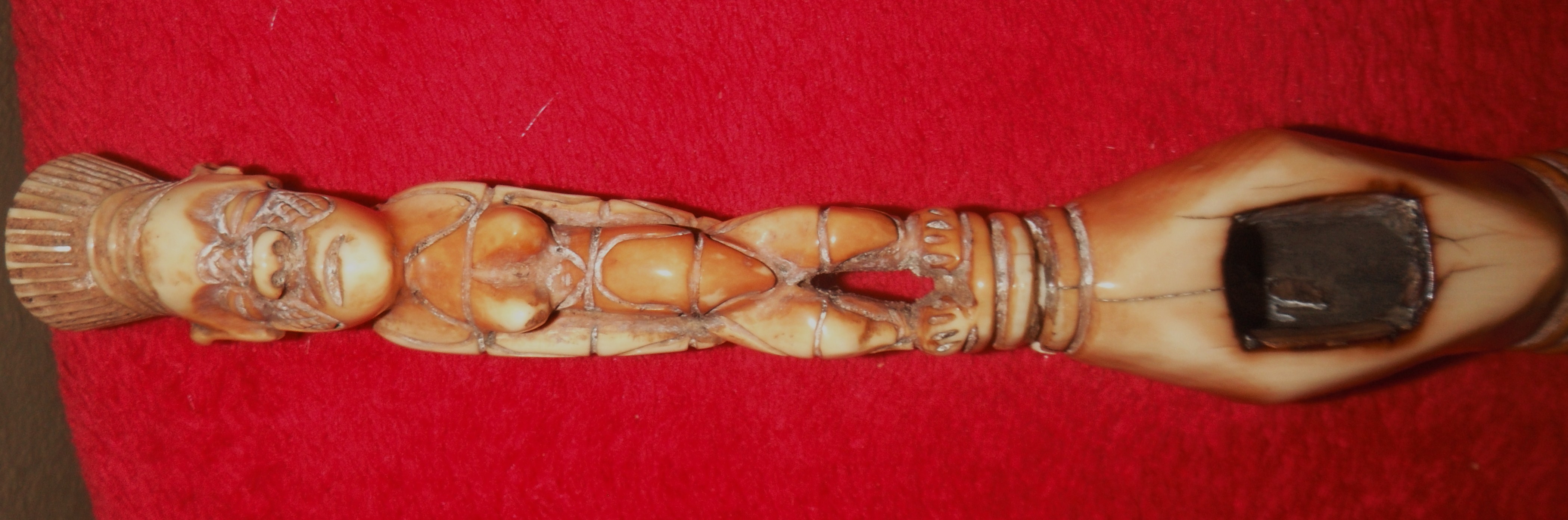 I am not sure what the tusk was used for , possibly a horn or pipe. I will need help with Identification. It has a deep orange patina most likly resulting in repeated applications of palm oil and years of handling. Looks like Congo (Yombe subgroup) but again I'm unsure, and could use help in identification of what culture may have created it. It looks like ivory , but correct me if I,m wrong.