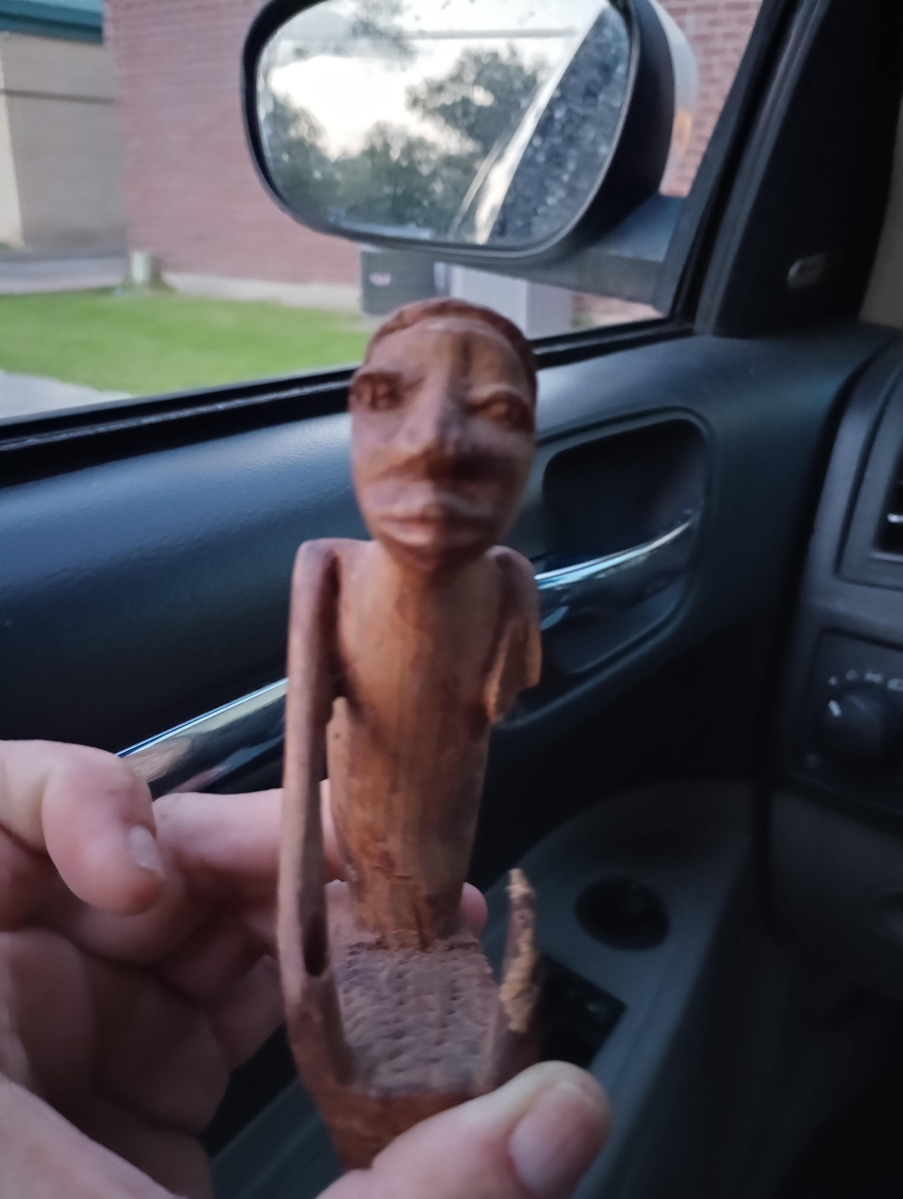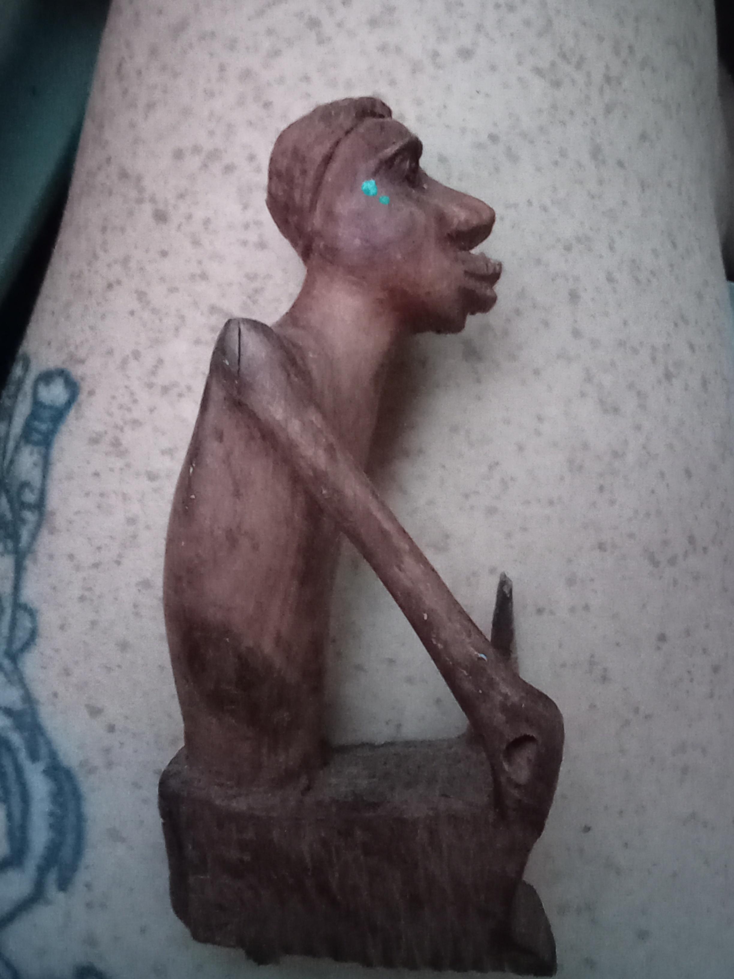 I cannot find anything remotely resembling this piece unless I look at prehistoric African art it's an African man in a boat and on the bottom of the boat is a swiveling fish
