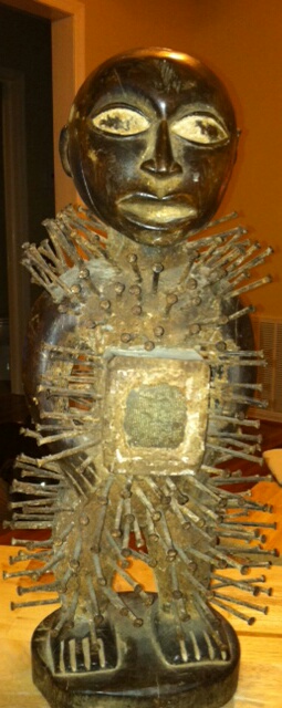 there are nails driven into the fetish from shoulder to toe, as well as a glass box on its stomach.