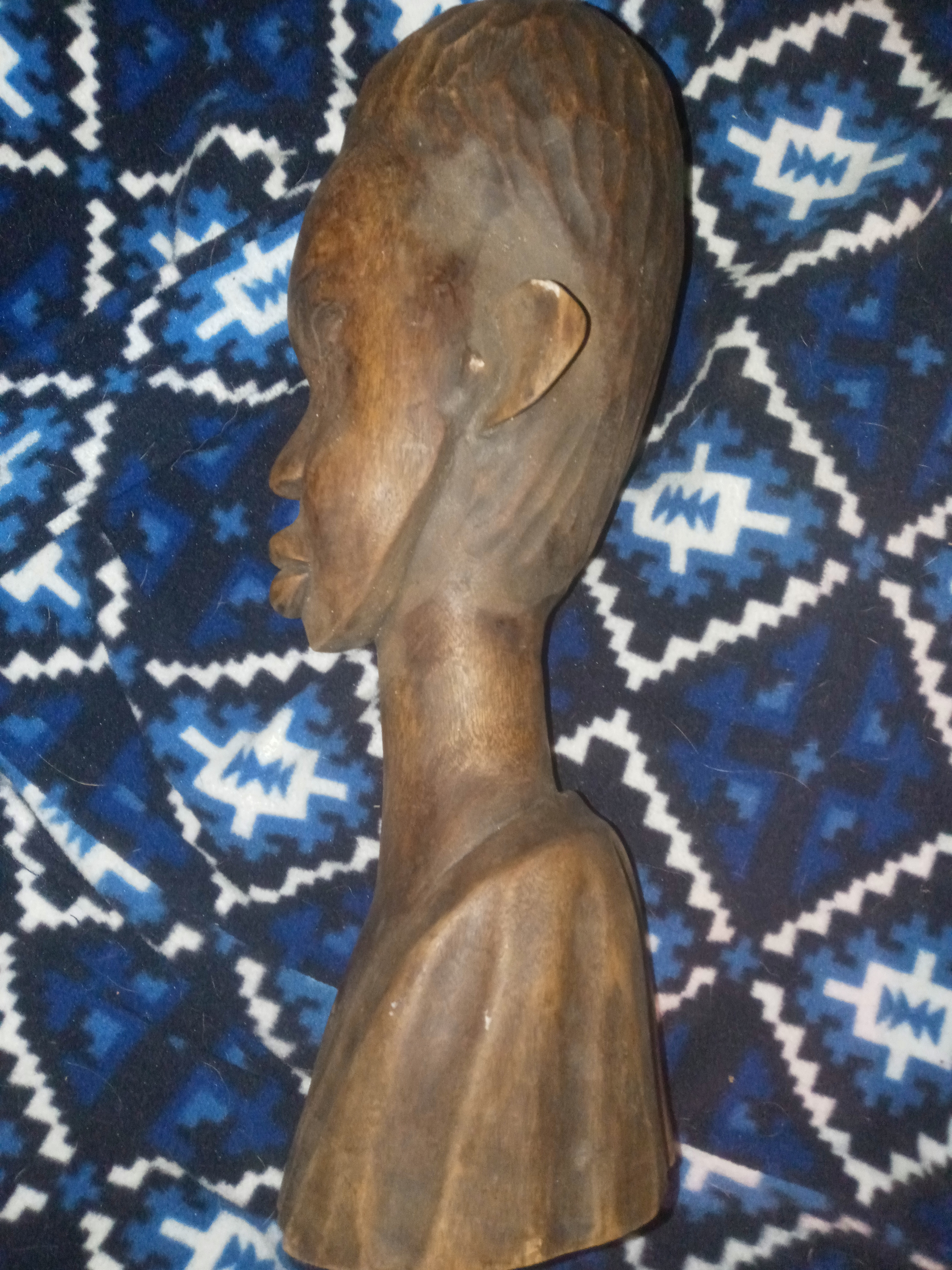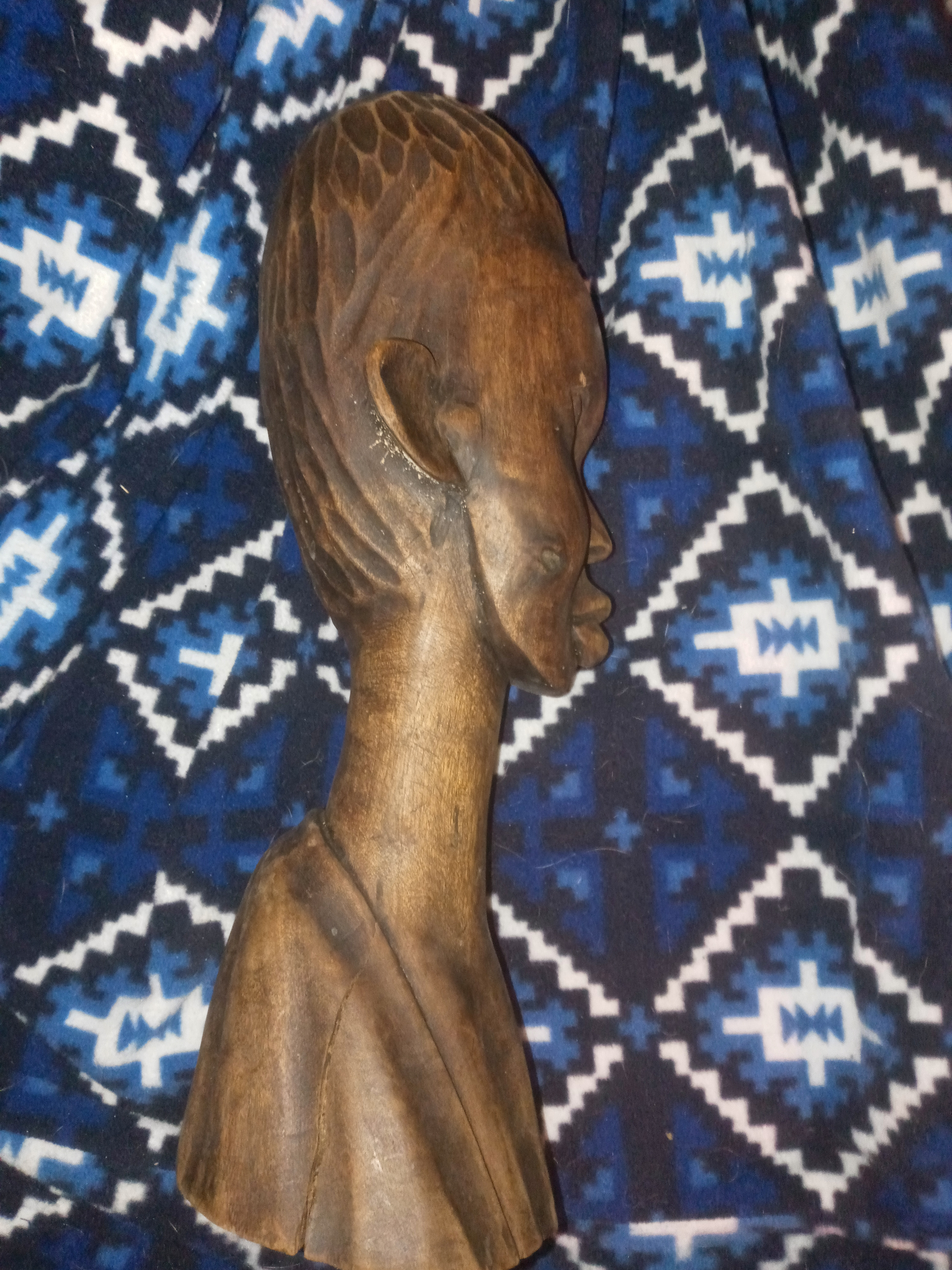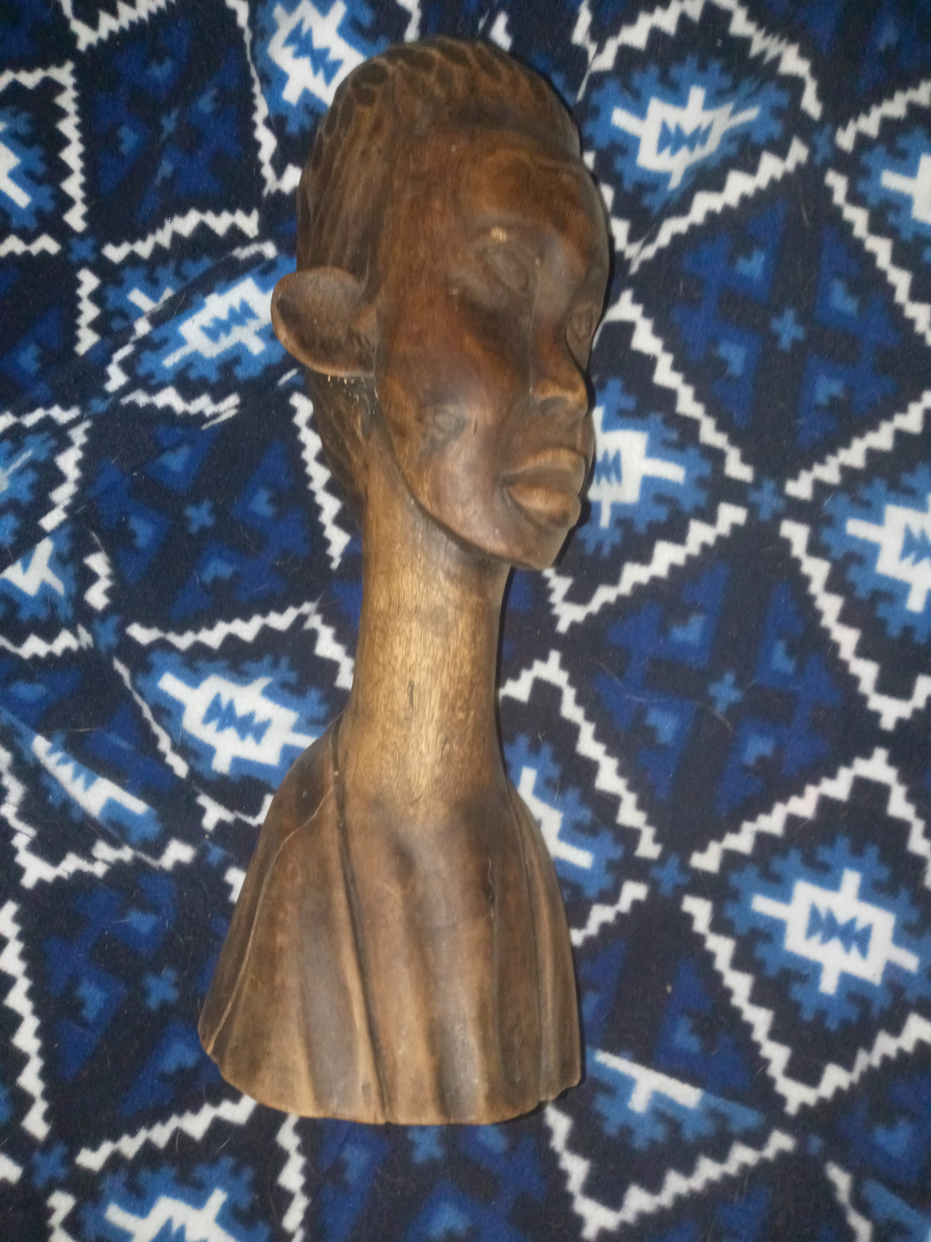 This is a hand-carved African tribal bust, likely originating from West or Central Africa. Such carvings are commonly produced by artisans in regions like Nigeria, Ghana, the Ivory Coast, or the Congo, where woodcarving traditions are deeply rooted in cultural and spiritual practices. The detailed facial features, elongated neck, and intricate head pattern suggest it could be influenced by Makonde (Tanzania & Mozambique), Yoruba (Nigeria), or Baule (Ivory Coast) art styles