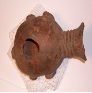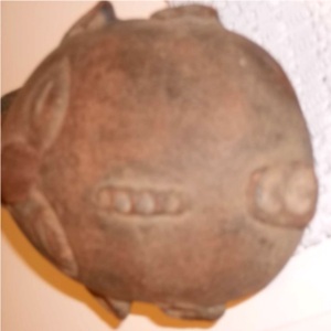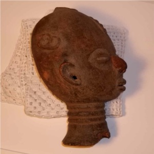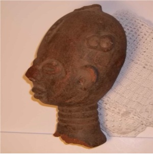 I was told that this head is possibly an Akan terracotta head of the Twifo-Hemang confederacy,15" dia, 7 1/2" overall height, oval form face with tapering chin, thin rectangular mouth and nose, narrow eyes, circular hole in back of head,weathered, not mounted, bottom of neck unevenly broken, nose appears to have been repaired, if piece is 300-400 years old then it would be in pretty good shape considering it is terracotta. Was told that it is important tribal art by an individual. No real appraisal has been done. I have not found anyone who really knew.