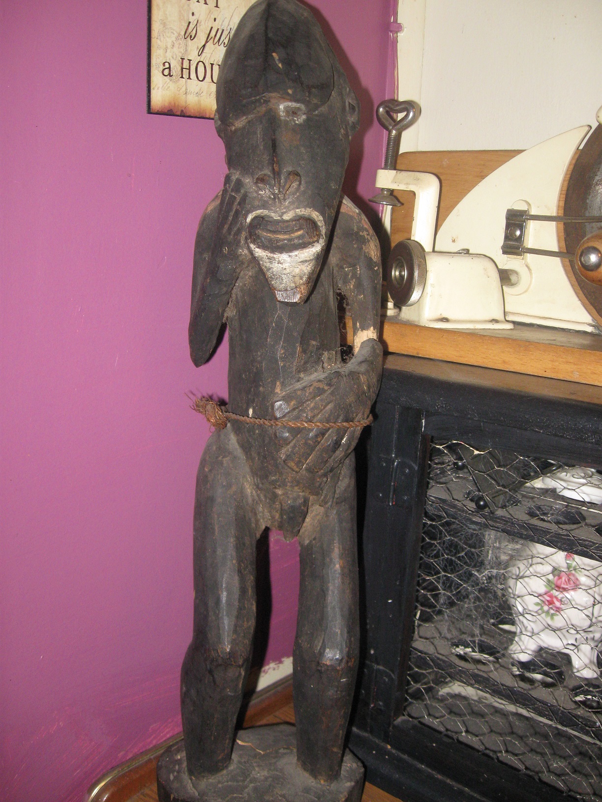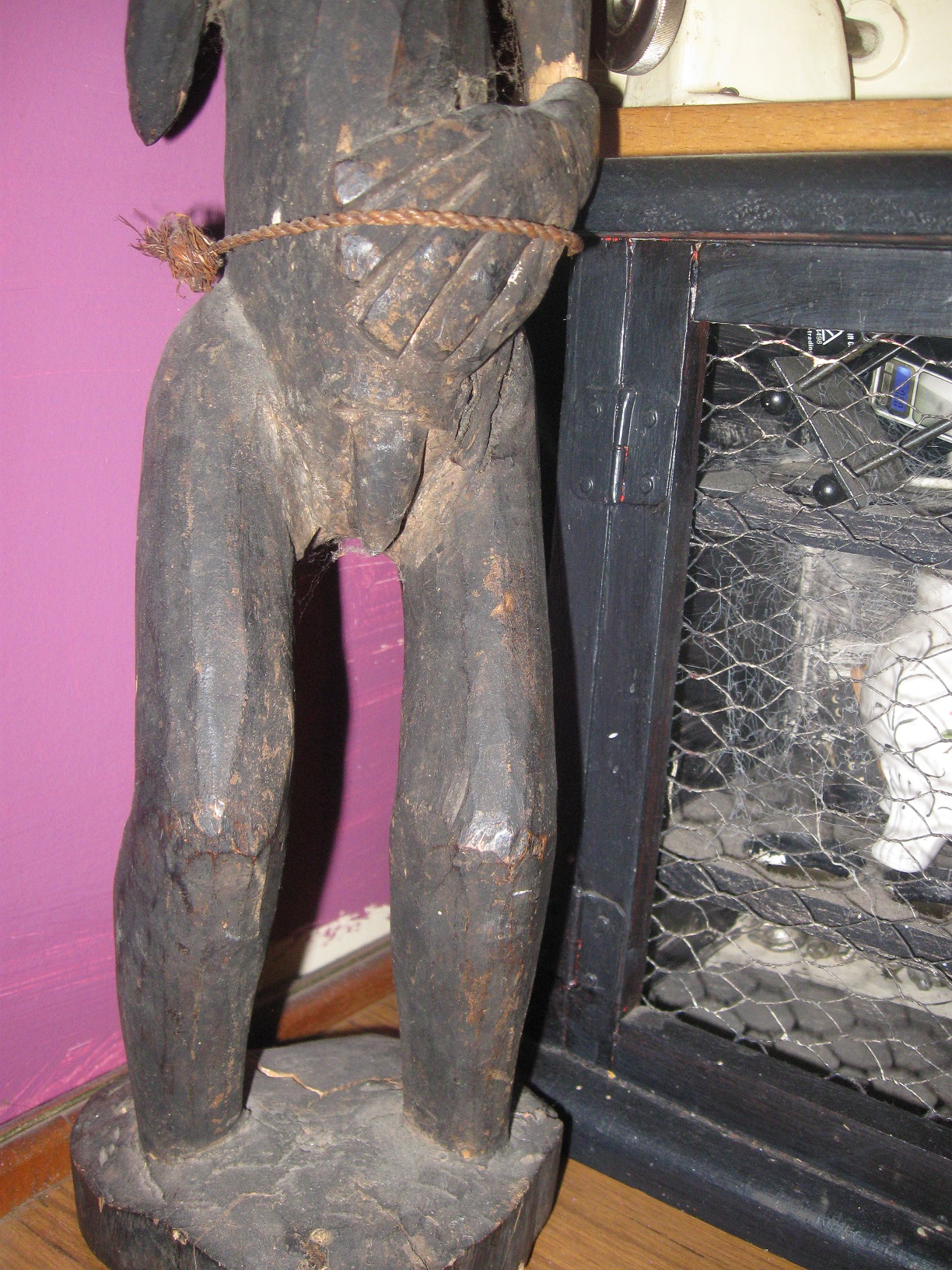This carved chap stands approx 50 cm tall, his lower leg is larger than the top as with his arms, large splayed hands. He has no feet, also has male genitailia.