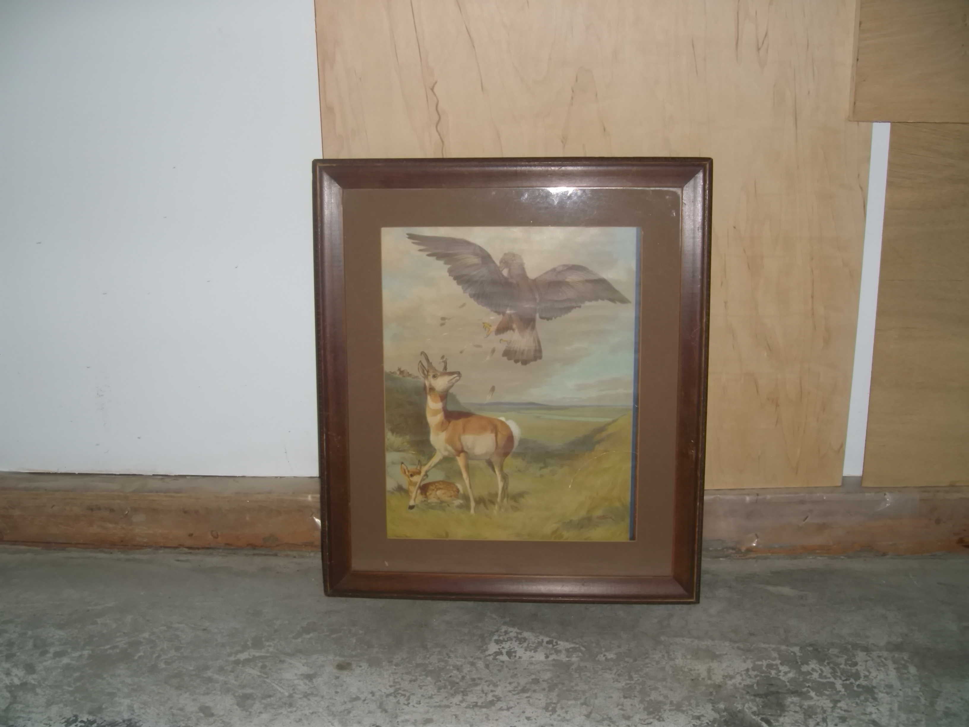 This print is one of 3, the other 2 are of a bear and 2 cubs, and the other is of goose hunters, and then this one of the antelope protecting her fawn from an eagle. The waybills are still attached to the back of the frames. The shipping company was called Dominion Express Co. The dates of shipping are also on the waybills.