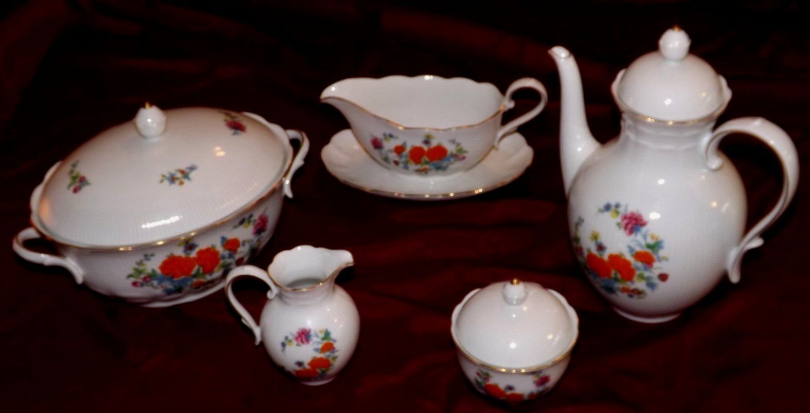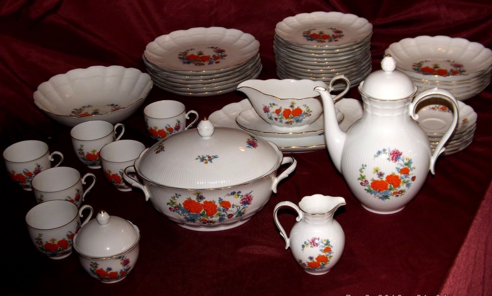 It has a blue crown, AK Kaiser, W Germany and R circled, and Romantica on the bottom. Also on the bottom of each piece is the # 47 or 50 that is inscribed. Complete set of 6 dinner plates, 12 small plates, 6 salad bowls, 6 cups, creamer and sugar bowls, coffee/teapot, large bowl, gravy bowl, 1 covered bowl, 1 platter. Trying to find a price or period on these.