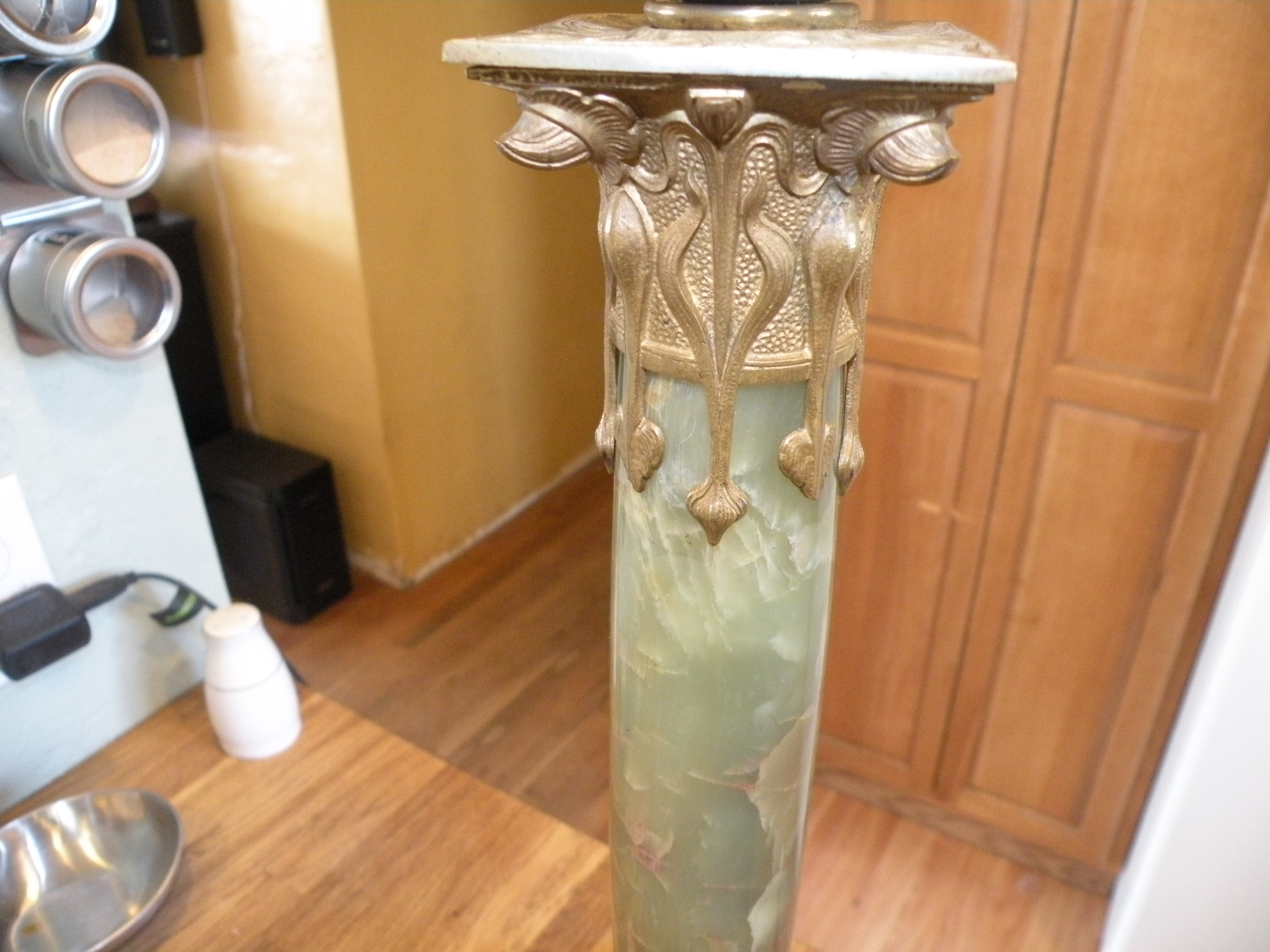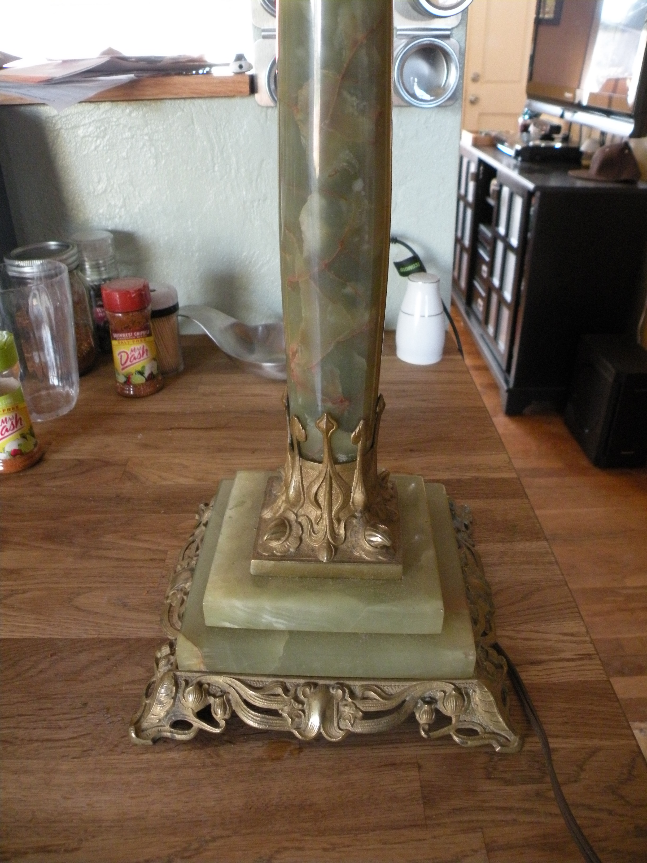 I found an what I believe to be an alabaster and brass lamp. The top section of it is 100% not original. (Not pictured) The base is beautiful though. I was hoping someone would know the who, what, when and wheres of it so I can attempt to find the parts to restore it. It is approximately 17" tall and the base is 8" square. On the bottom of the base it is stamped 119. This lamp is heavy. It weighs approximately 12 pounds.
