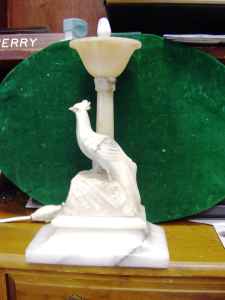 LAMP . THIS LAMP STANDS ABOUT 14" HIGH. I HAVE BEEN TOLD IT IS FROM THE 20'S AND IS HAND CARVED ALABASTER. IT HAS A FEW VERY MINOR CHIPS BUT IS IN GREAT SHAPE FOR ITS AGE.