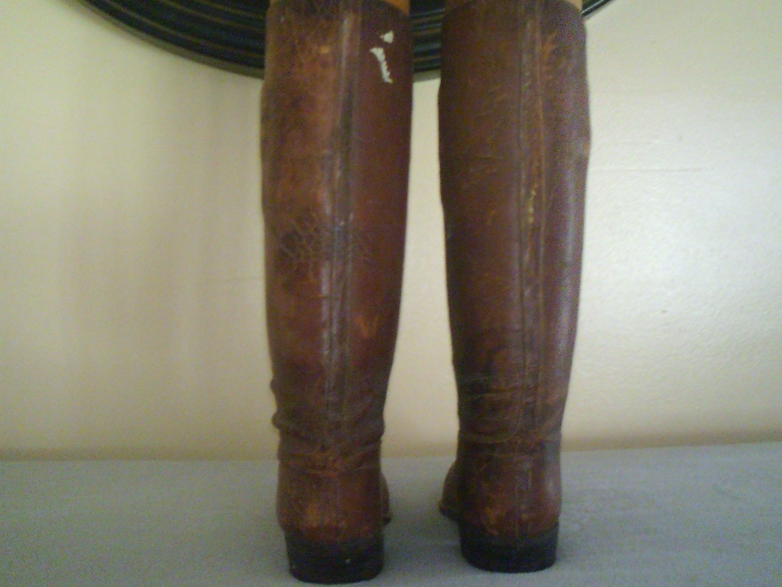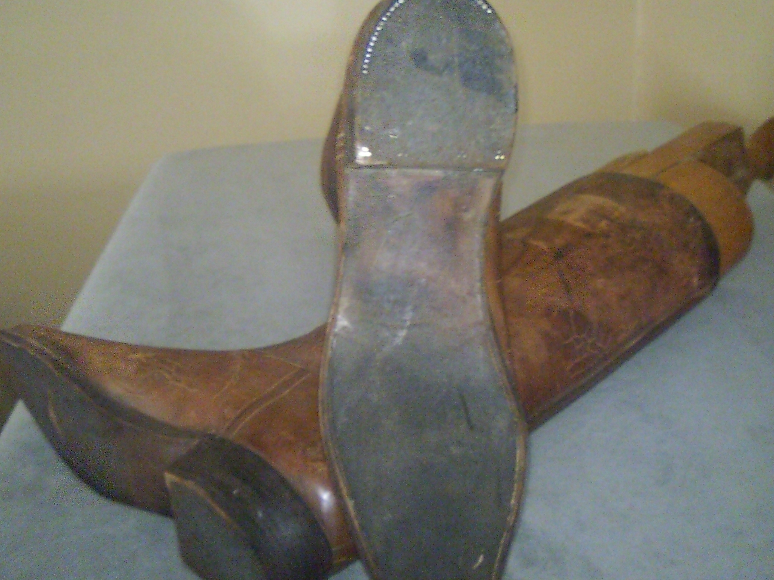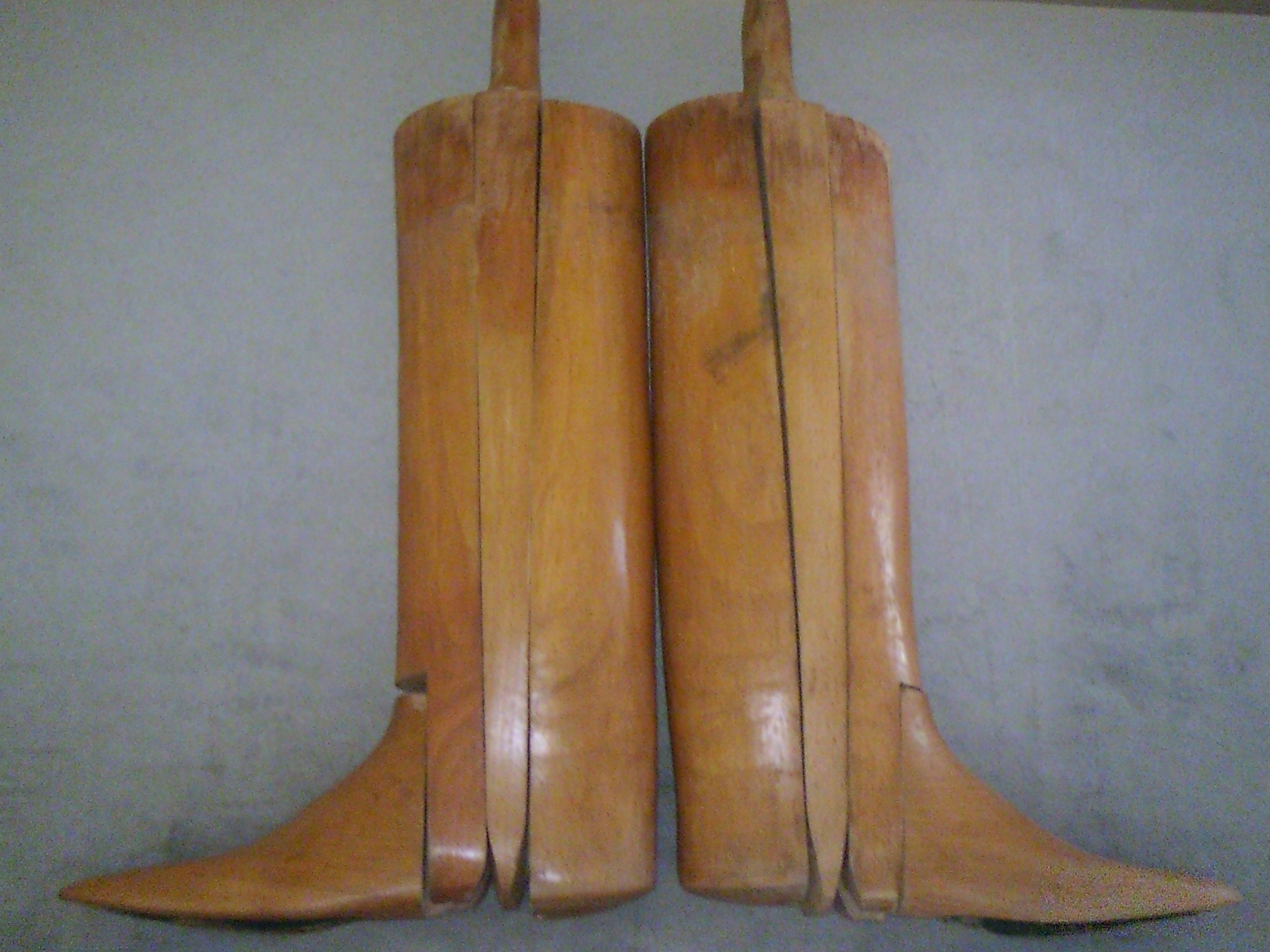 These have been used as a display item for some time now as the leather fairly solid formed. Inside of boots have very good markings. The trees in the boots have no pivots and simply notch together. I have not found much information on the boots and these are the only pair I have ever found that look like this. From what I can find they are somewhere between 1850 and 1900.