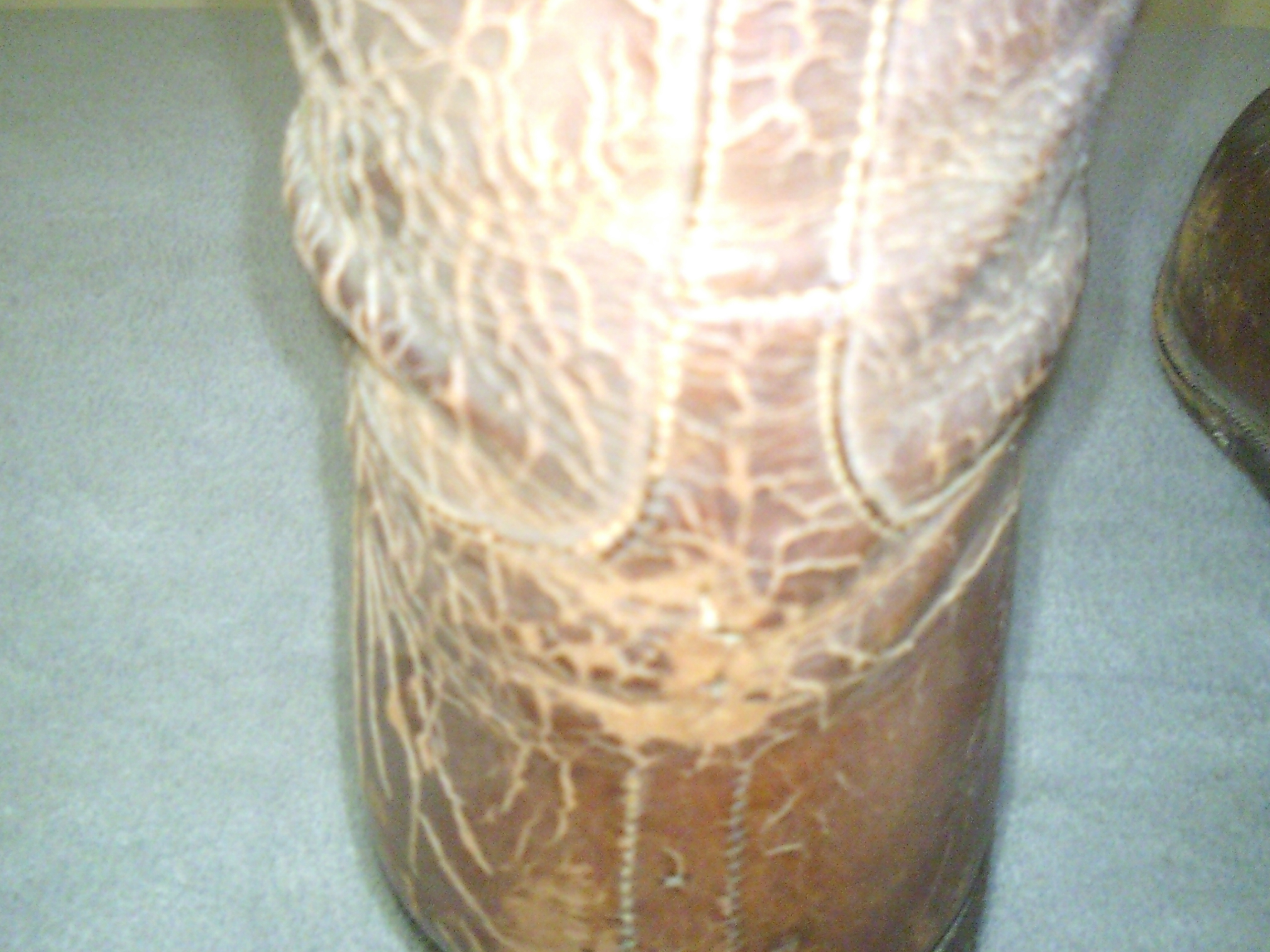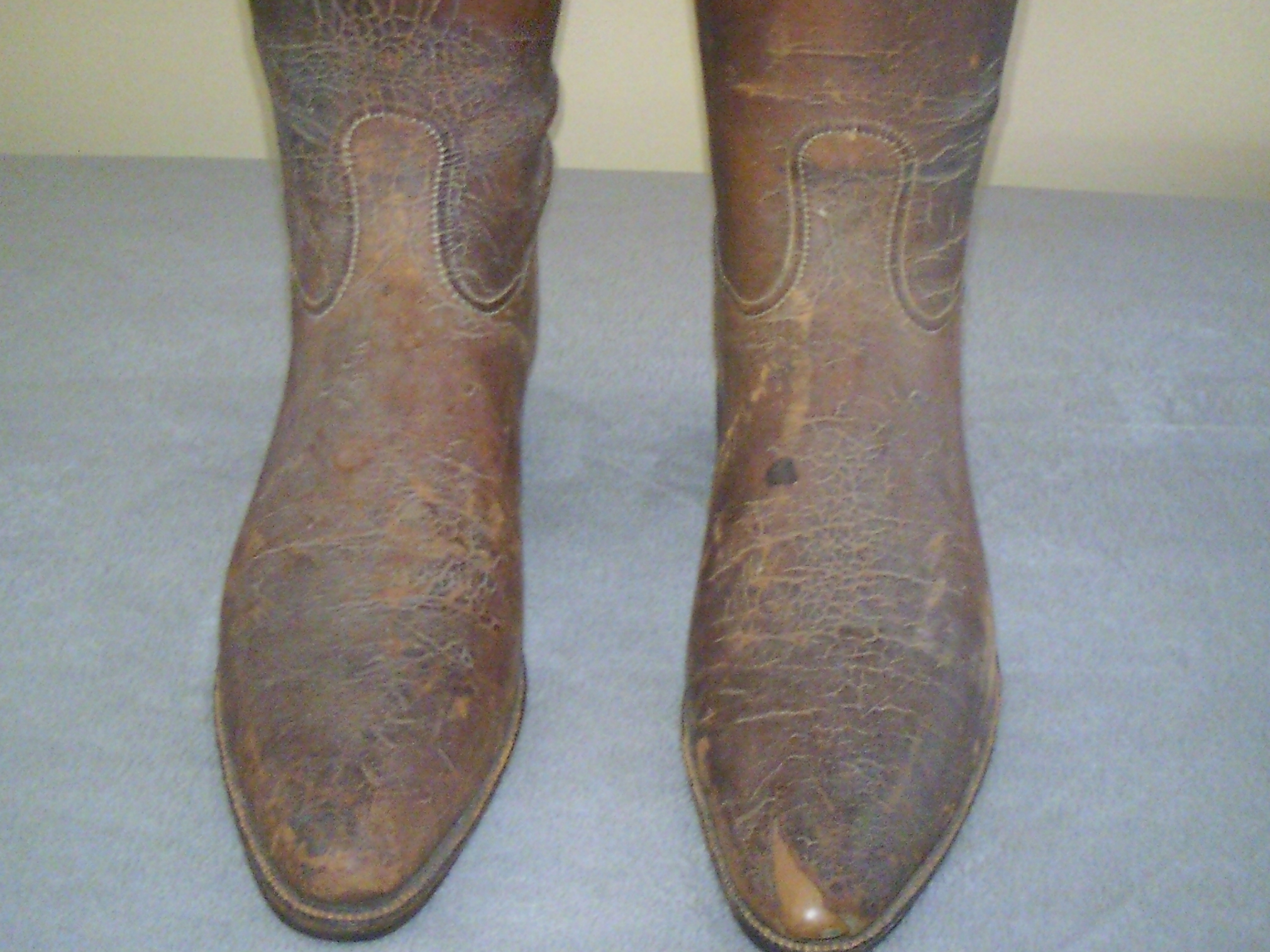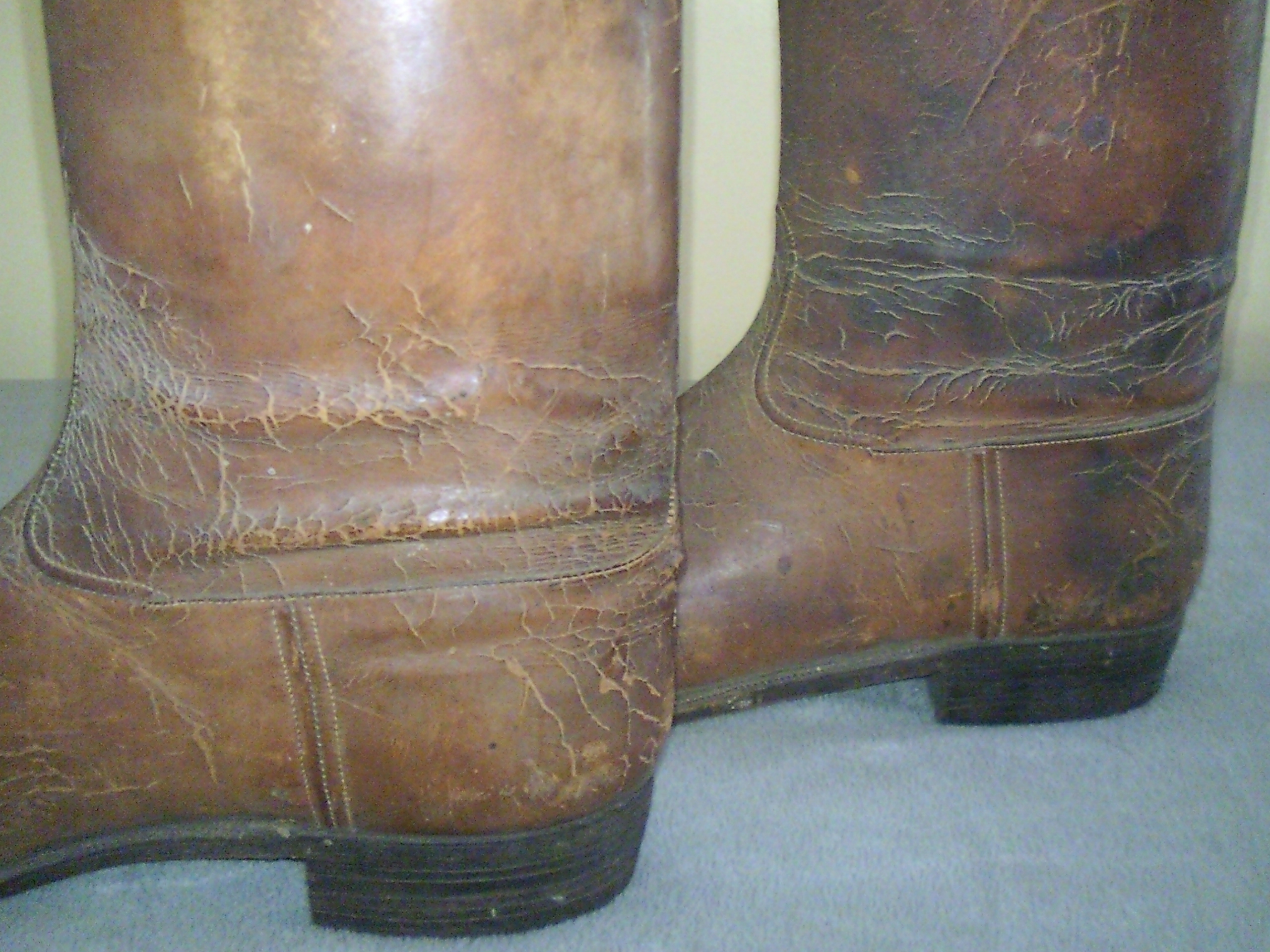 These have been used as a display item for some time now as the leather fairly solid formed. Inside of boots have very good markings. The trees in the boots have no pivots and simply notch together. I have not found much information on the boots and these are the only pair I have ever found that look like this. From what I can find they are somewhere between 1850 and 1900.
