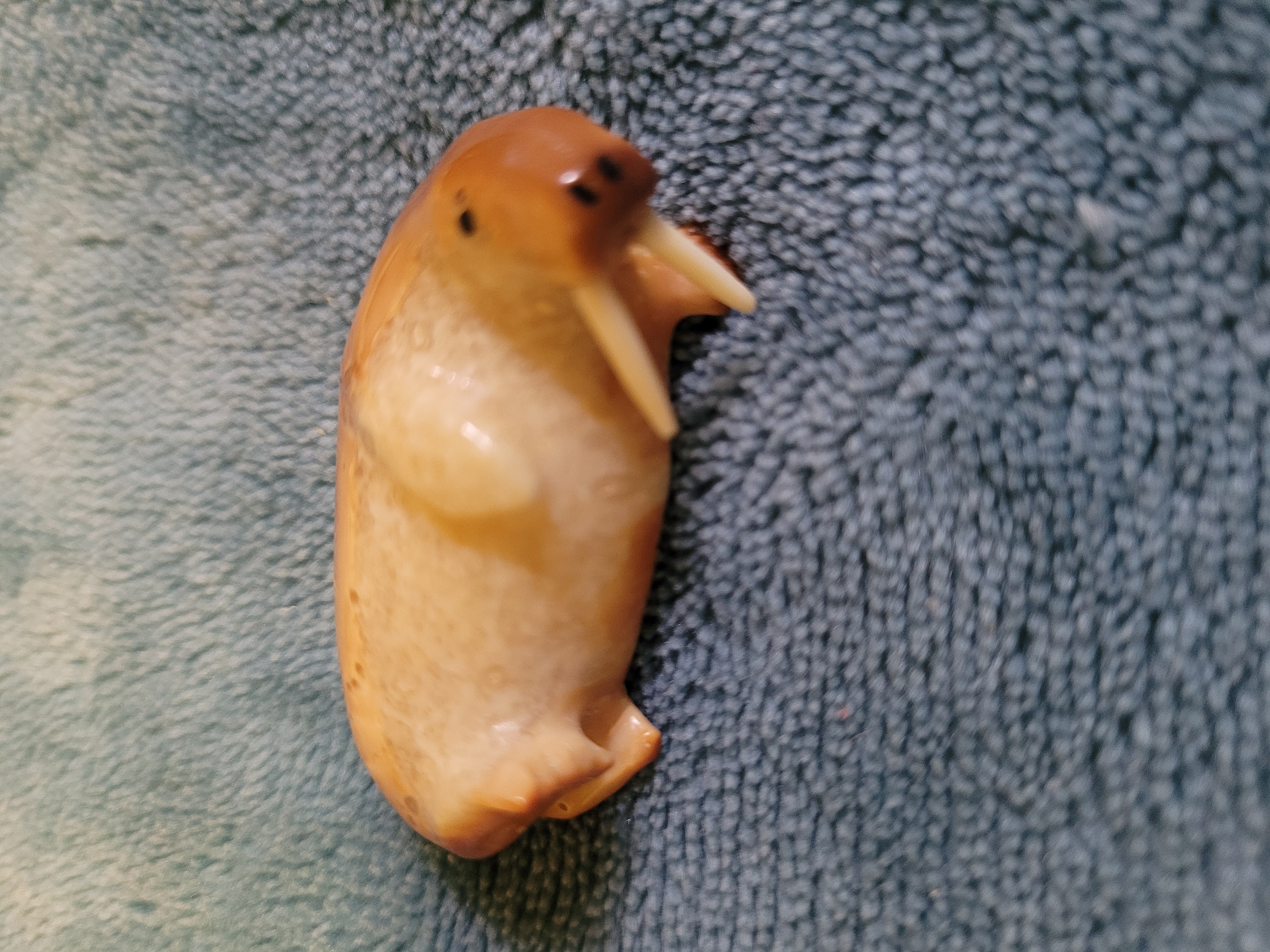 Physical Description: This collection features three intricately carved figures made from walrus tusk, a traditional medium among Alaska Natives. The figures include one seal, one walrus, and a happy lucky charm. The dimensions of the carvings are as follows: two pieces measure slightly over 1 inch in length, while the third piece measures approximately 2 inches long. The carvings exhibit a natural color palette characteristic of walrus tusk, with subtle variations in hue and texture.