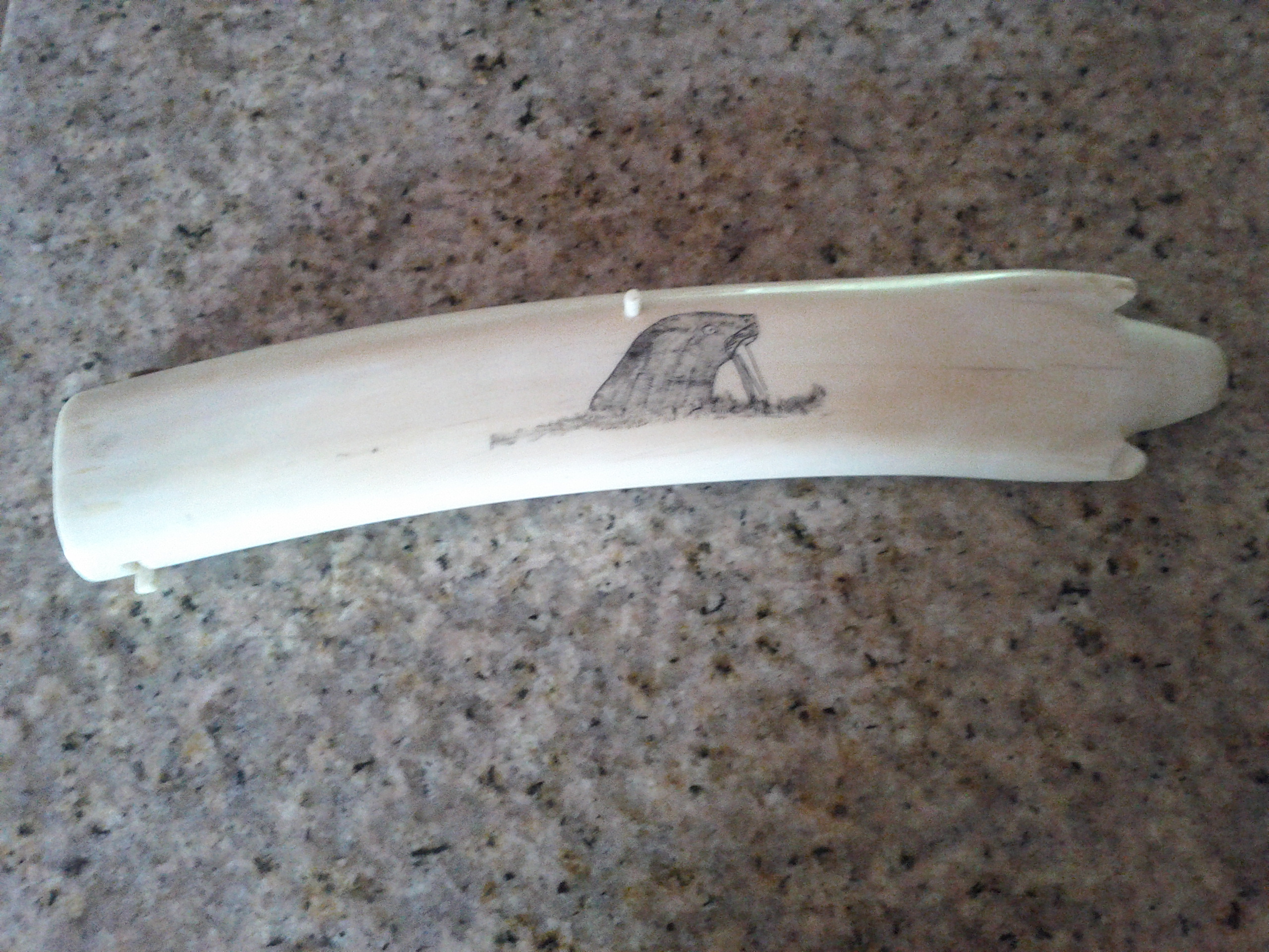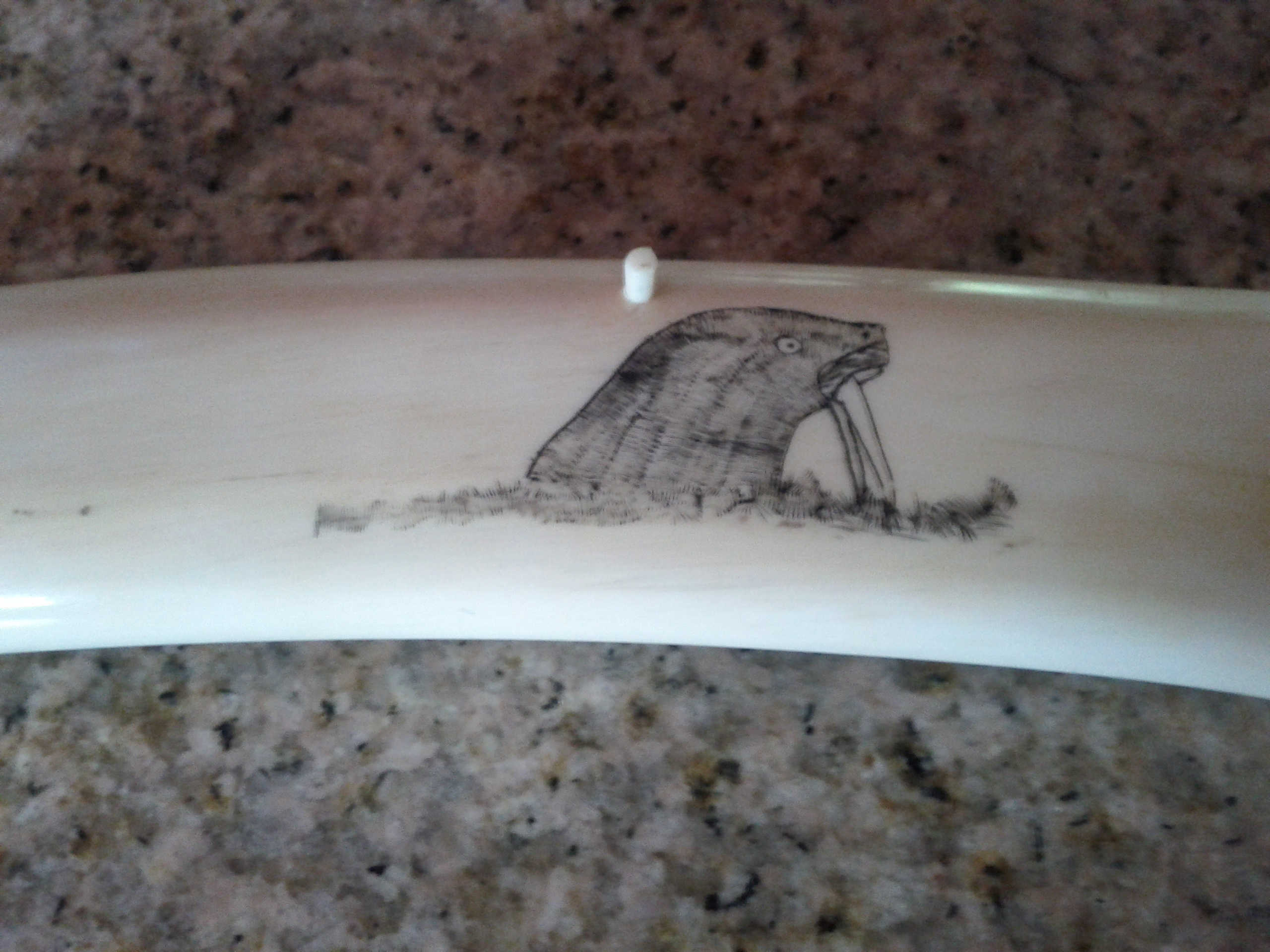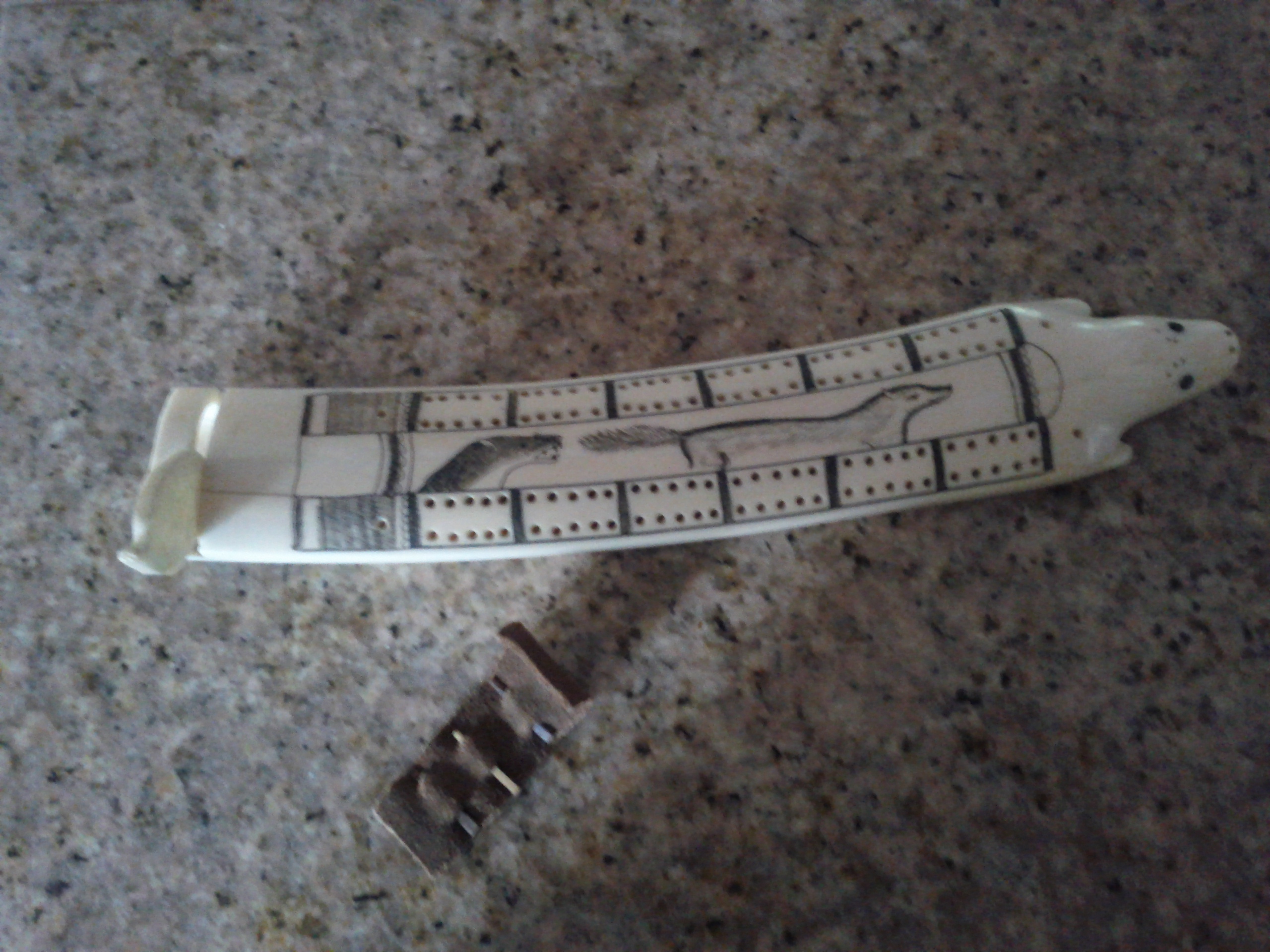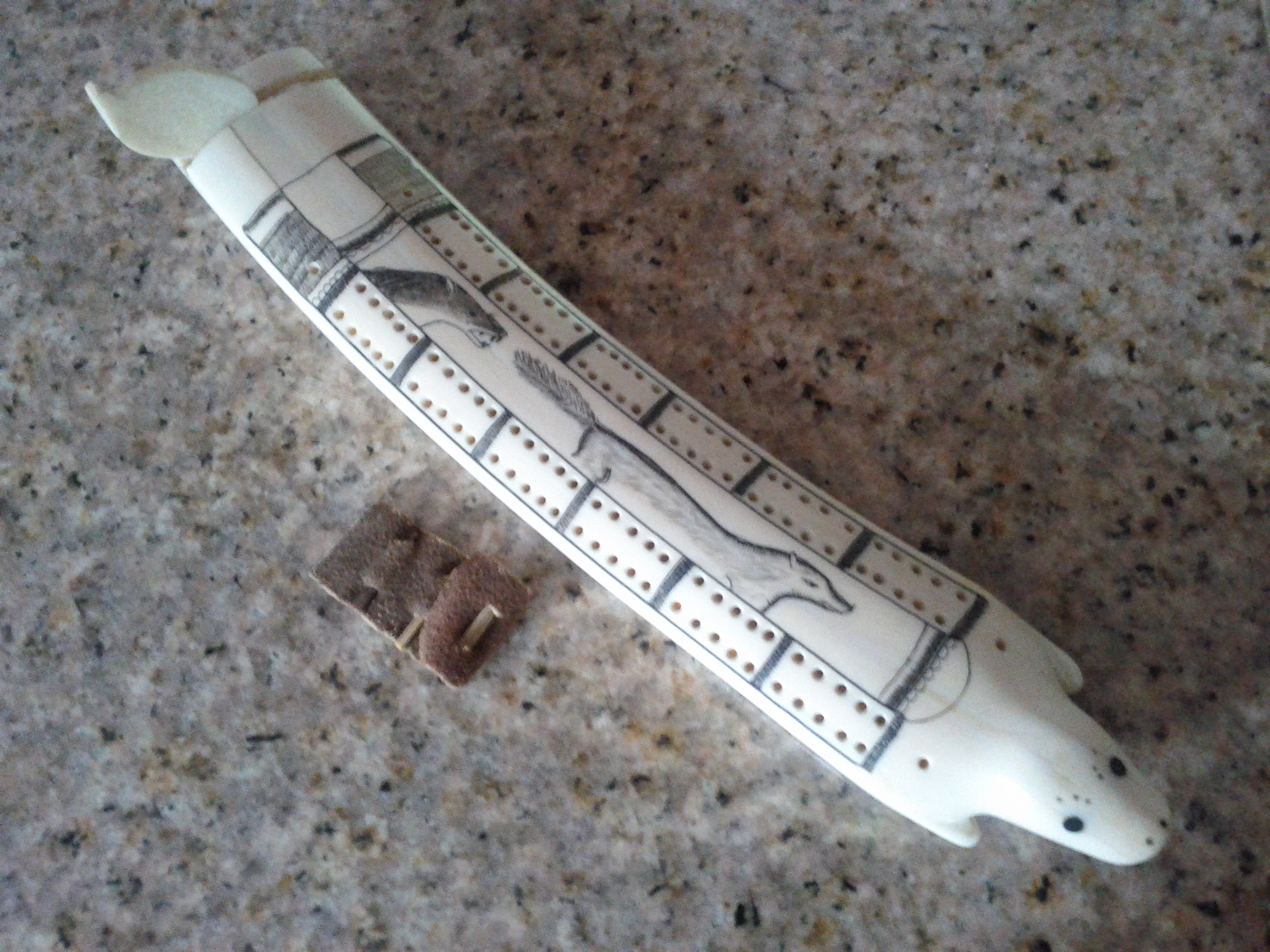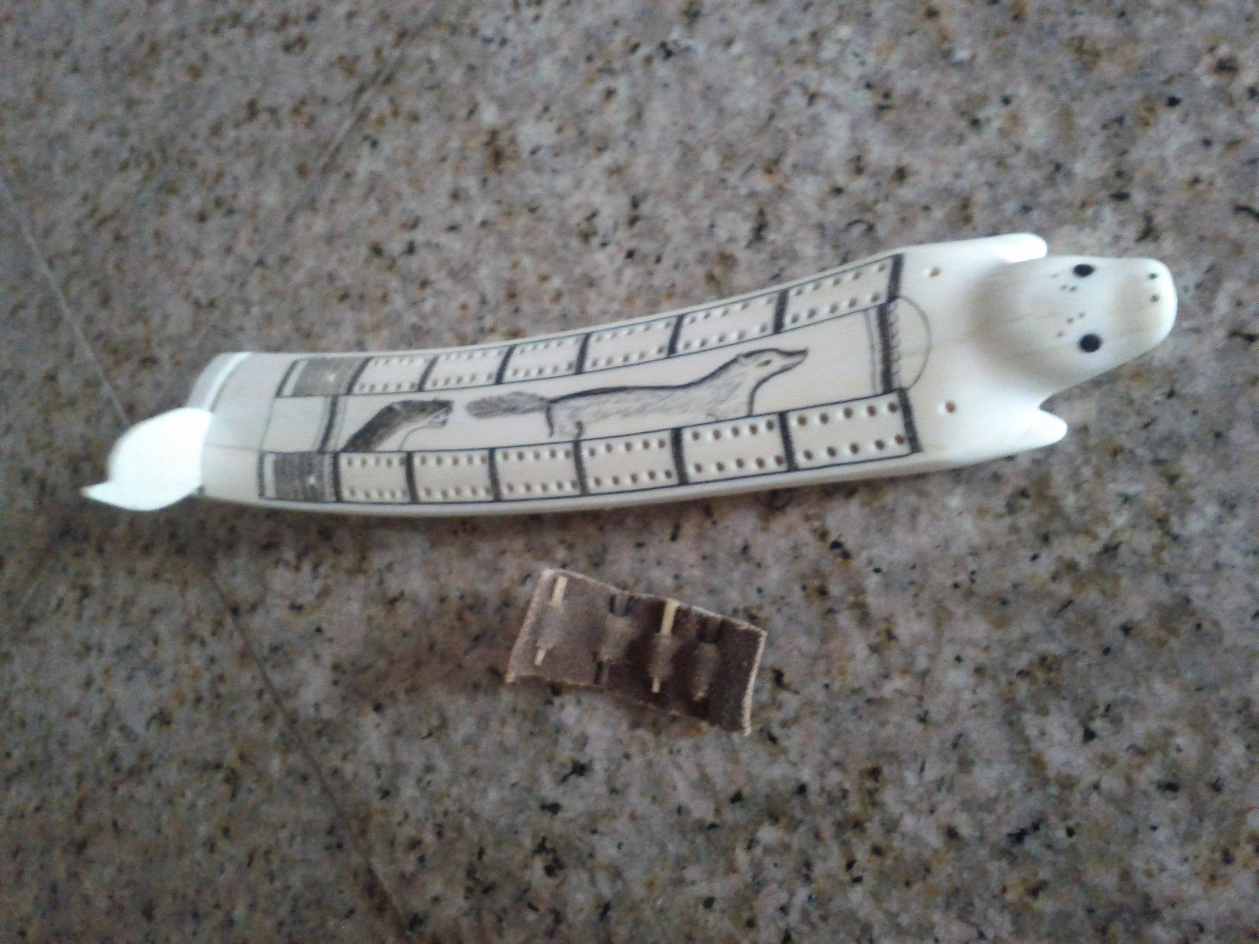 Alaskan artist created this carving out of a single piece of Walrus tusk ivory. He made it during an alaskan "long night". He gave it to Earnie Bohier as a friendship gift. According to Eskimo tradition a friendship gift obligates the reciever to be responsible for the safety and well being of the giver. Earnie left the gift in his will to my father George Austin now 94 years old. It has beautiful scrimshaw on both the top and bottom and has a compartment to hold the pegs.