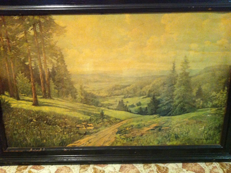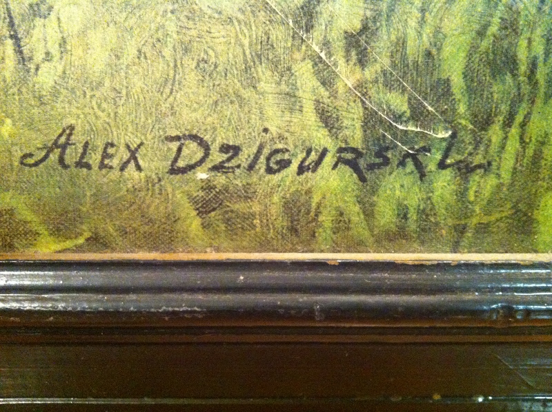 my mom had this for at least 40 years don't know when it was painted. It is painted on something hard not canvas I don't think. It does back a paperback covering signed in right corner by alex dzigurski has some some water spots and fading thanks