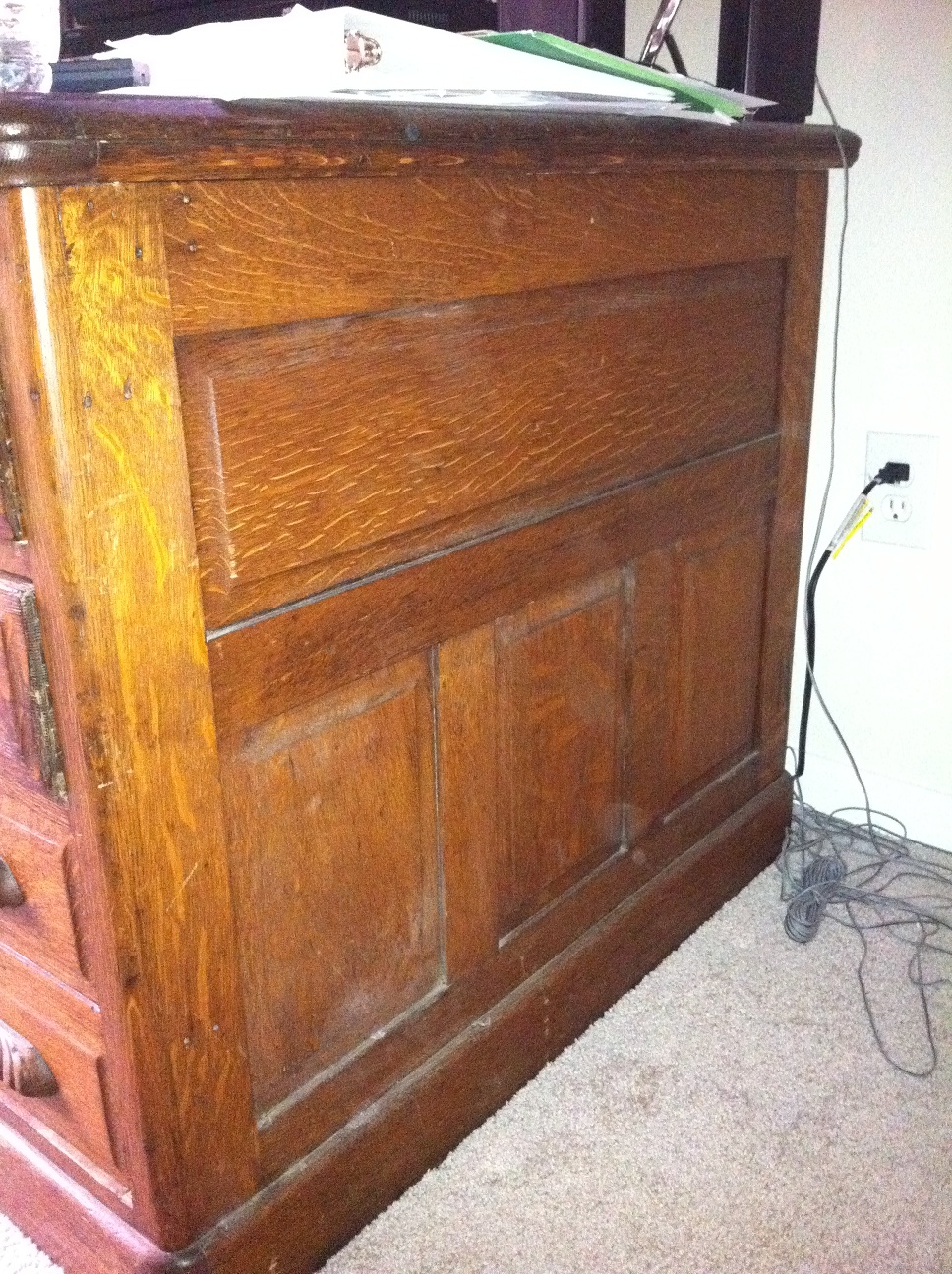 Hi, Dale, I just got a similar desk that had been in my grandpa's basement, although I believe mine is a different wood and it does have an open back rather than the panel that yours has. I'm wondering - what does the top of yours look like? Mine is currently covered with vinyl, and while I started to peek under I haven't pulled it all off yet. The wood around the edge is the same as the rest of the desk, but most of the top is slightly inlaid and looks vaguely like particle board, but there's no evidence of that from below.