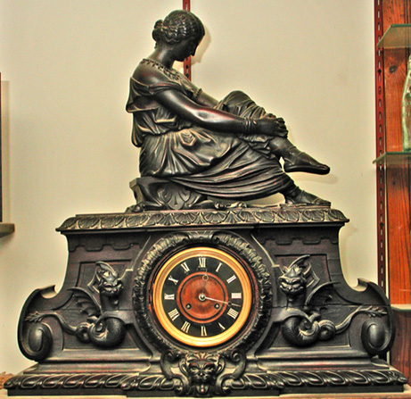 A large mantle clock with A. Roux / Paris, New York on clock face. In good condition, has crack it wood.