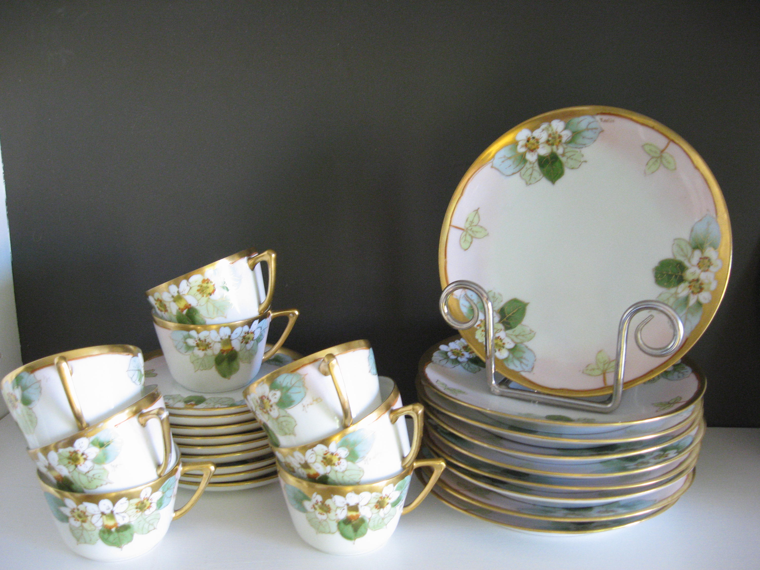 I have a dessert set and several other pieces that match. Alfred Keates painted these, and signed the 9 dessert plates (7 1/2" plates), and the 8 cups, as well as the coffee pot. The other pieces match but are not signed. They are painted with orange blossoms and heavy gold trim and some outlines. They also have a wide rosey blush tint painted nesrest the gold edges that blends into white. I know Keates was famous for his florals. He painted for the Pickard Studios from 1903-1910 and went out on his own after until 1934 when he retired. The cups and saucers are on J & S Jsolde blanks. The dessert plates are Thomas Sevres. The other pieces, with the exception of the sugar basket are all done on Rosenthal. I can't read the markings on the bottom of the sugar basket, as it's too faded. But it looks like it was originally a reddish brown shield with writing below in a curve.