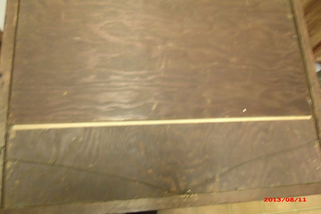 It is still in the frame it was when I bought it. Simple wood frame, put together with nails at the corners. The back is two pieces of plywood, top piece not as tall as bottom. The plywood is held in place by small, triangular shaped razors, stuck into the frame board.