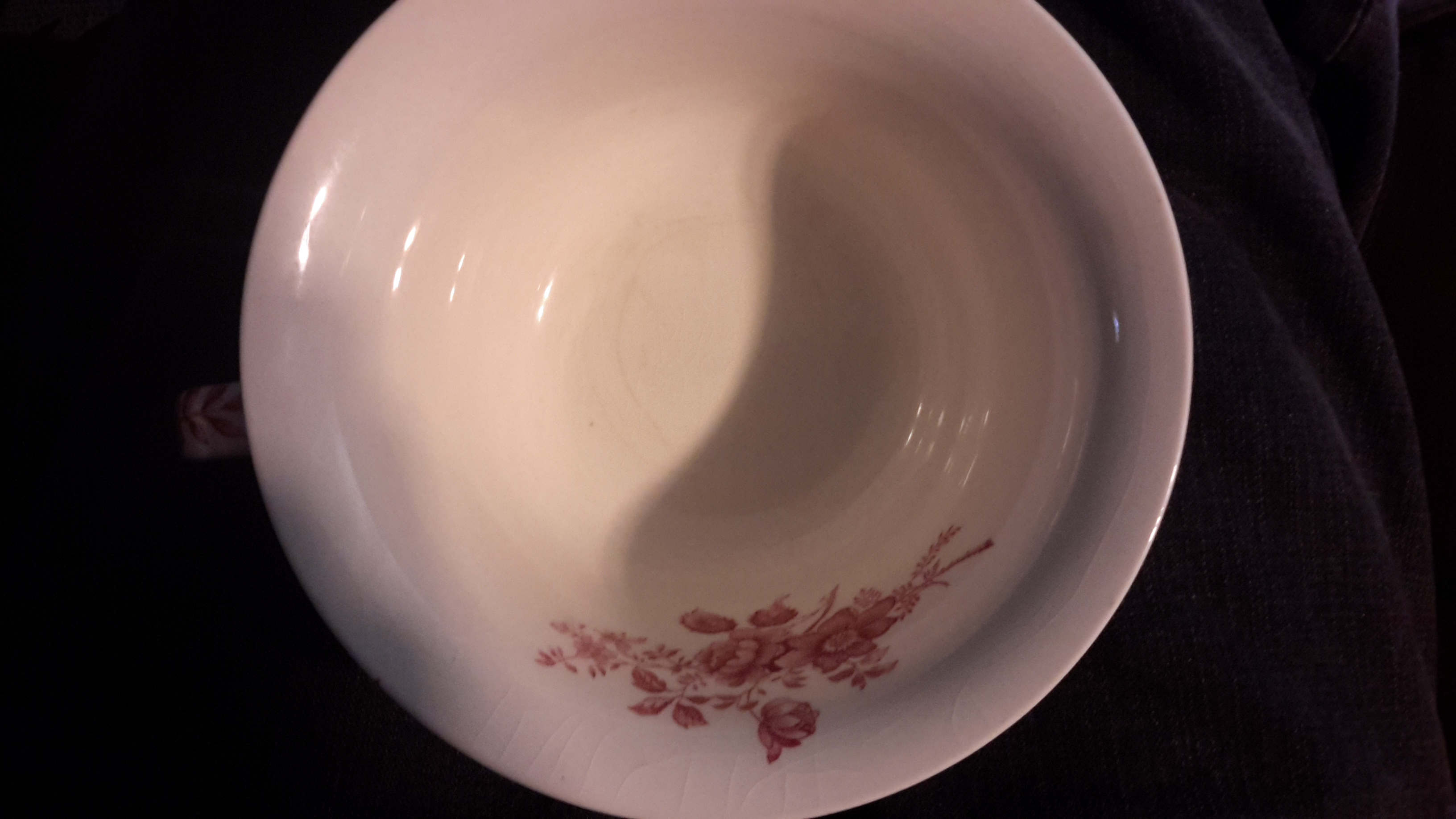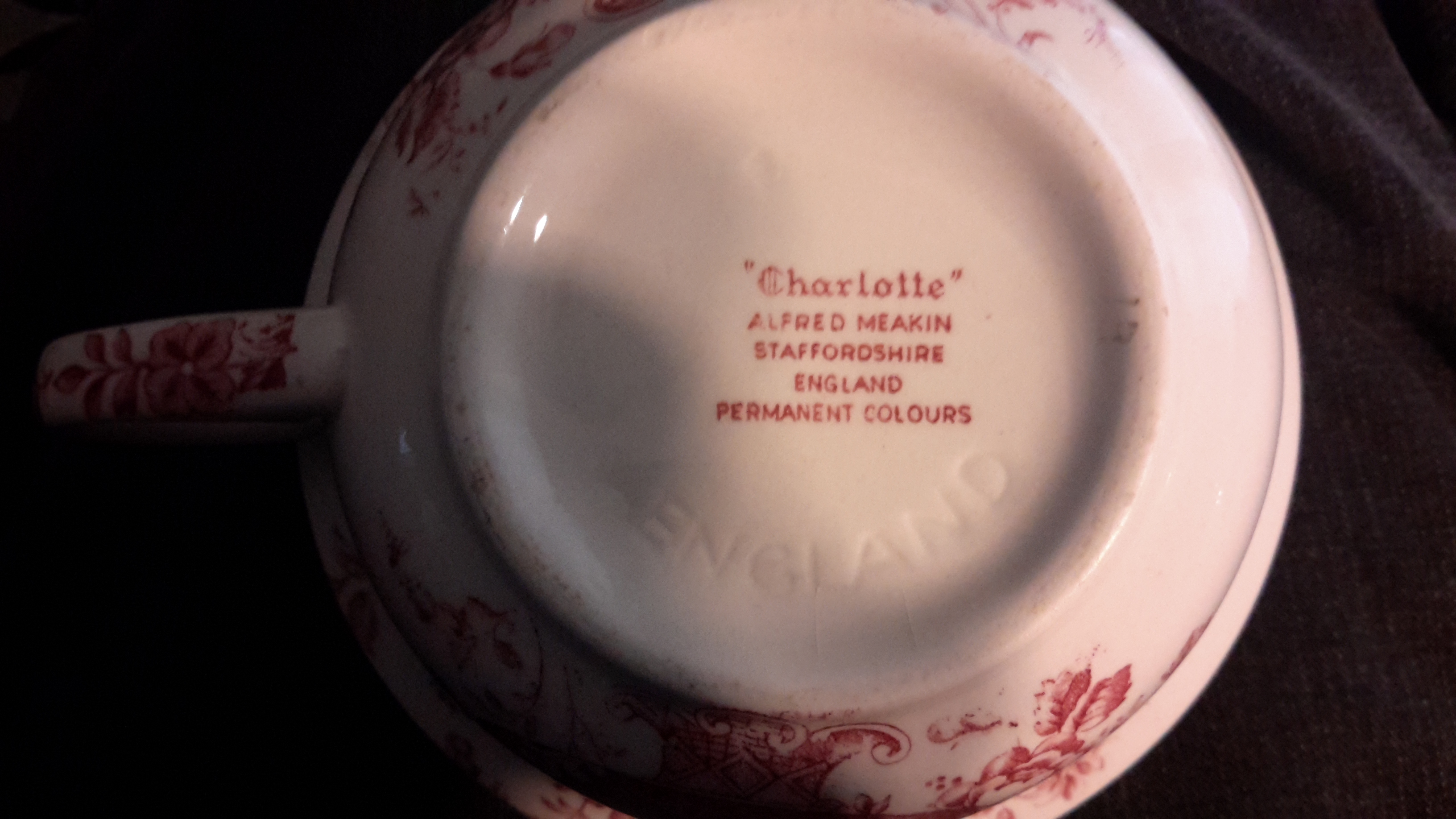 Bowl underside reads: "Charlotte" ALFRED MEAKIN STAFFORDSHIRE ENGLAND PERMANENT COURS. "England" is engraved under the description. Approx 6 inches in diameter. Visible lines in the glaze.