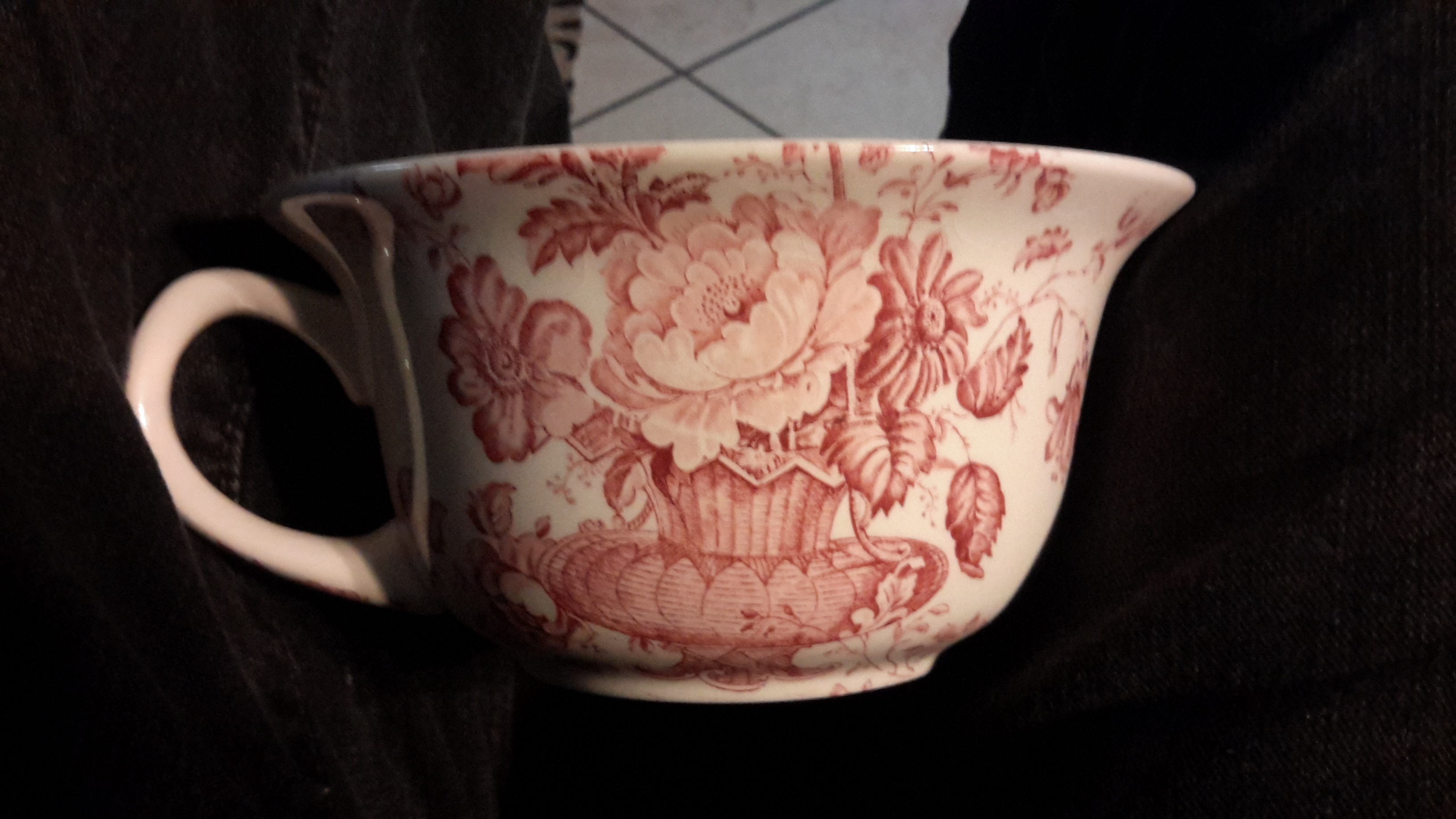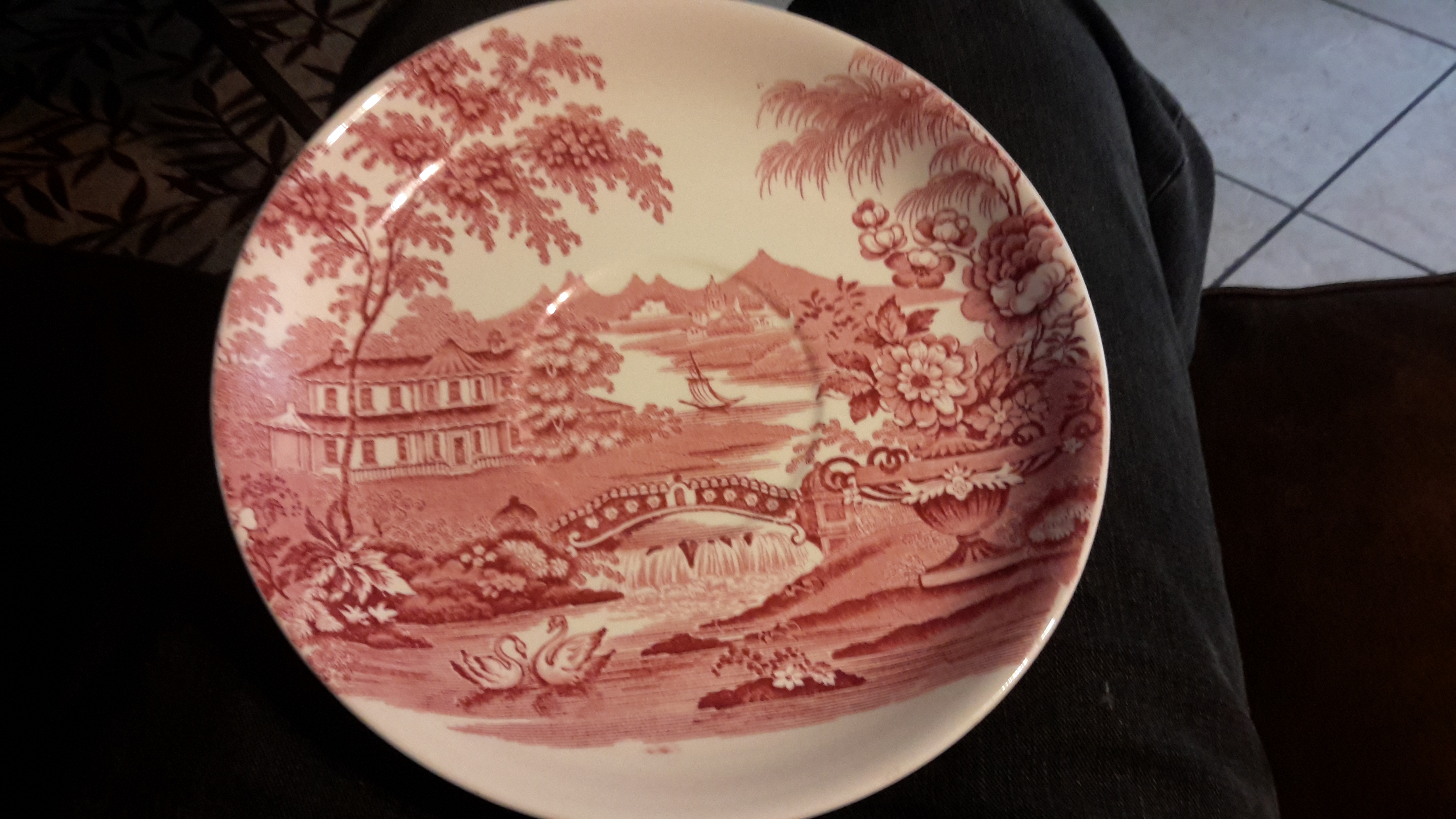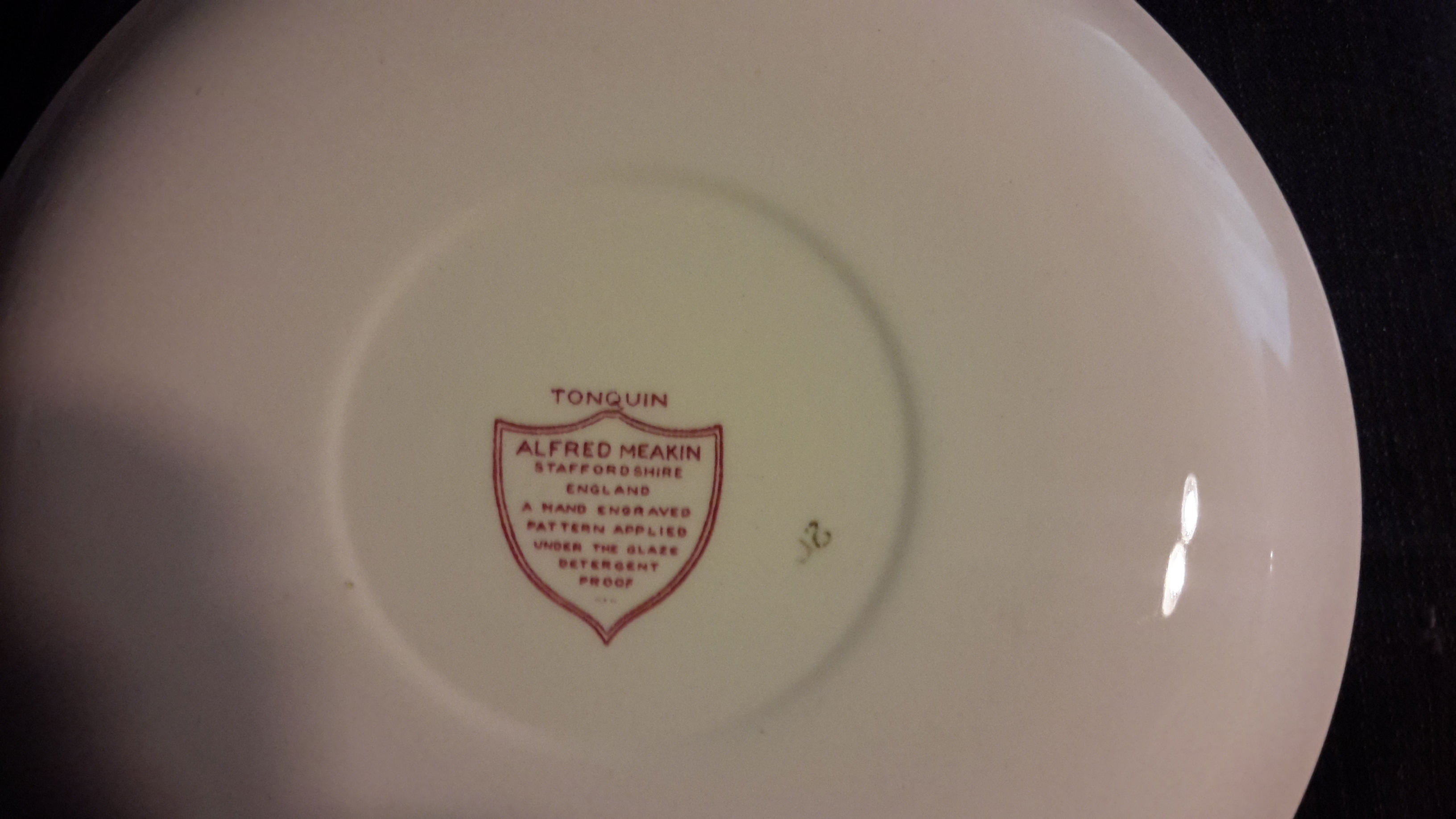 Saucer underside reads: ALFRED MEAKIN STAFFORDSHIRE ENGLAND A HAND ENGRAVED PATTERN APPLIED UNDER THE GLAZE DETERGENT PROOF. Approx 9 inches in diameter.