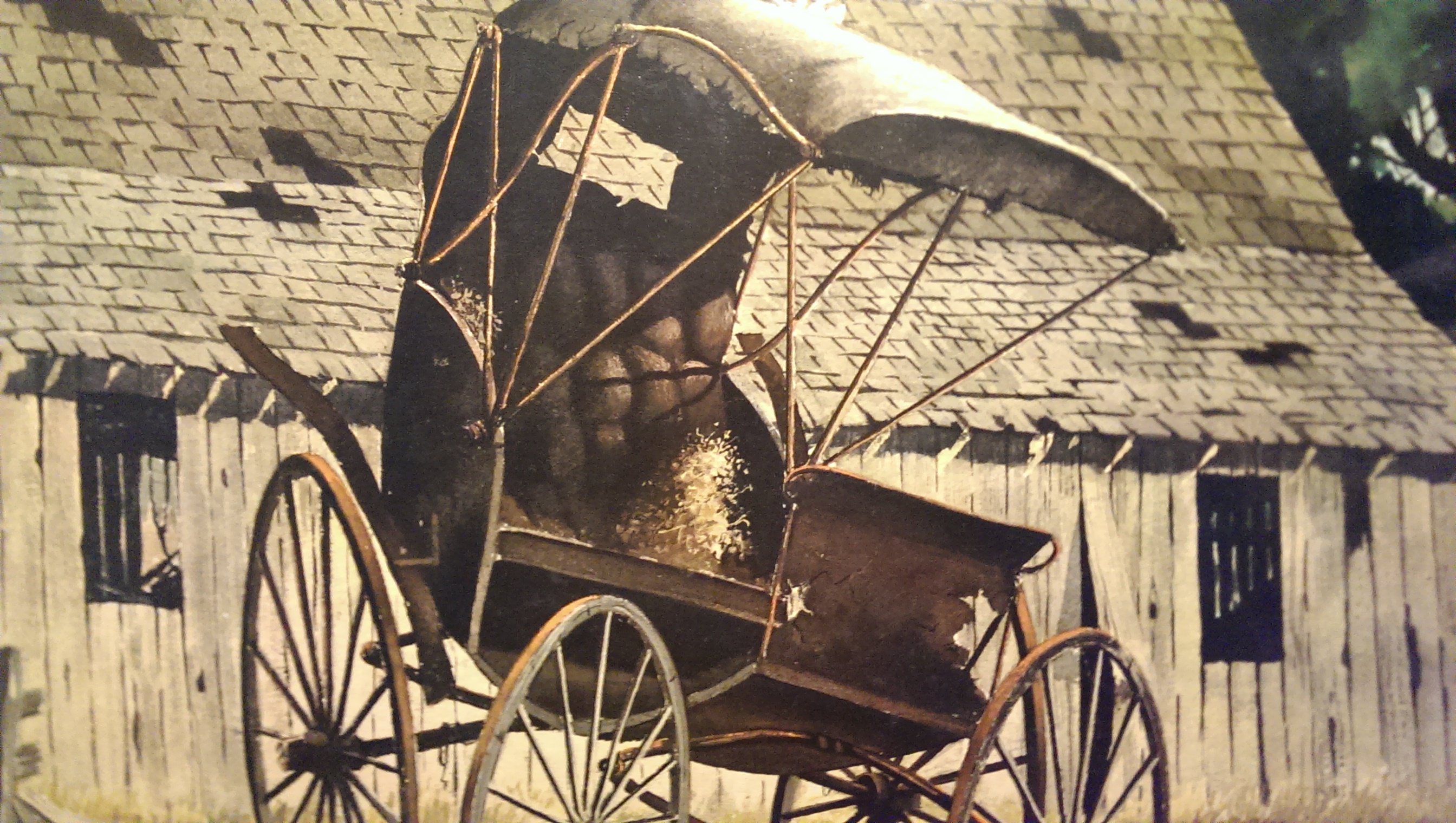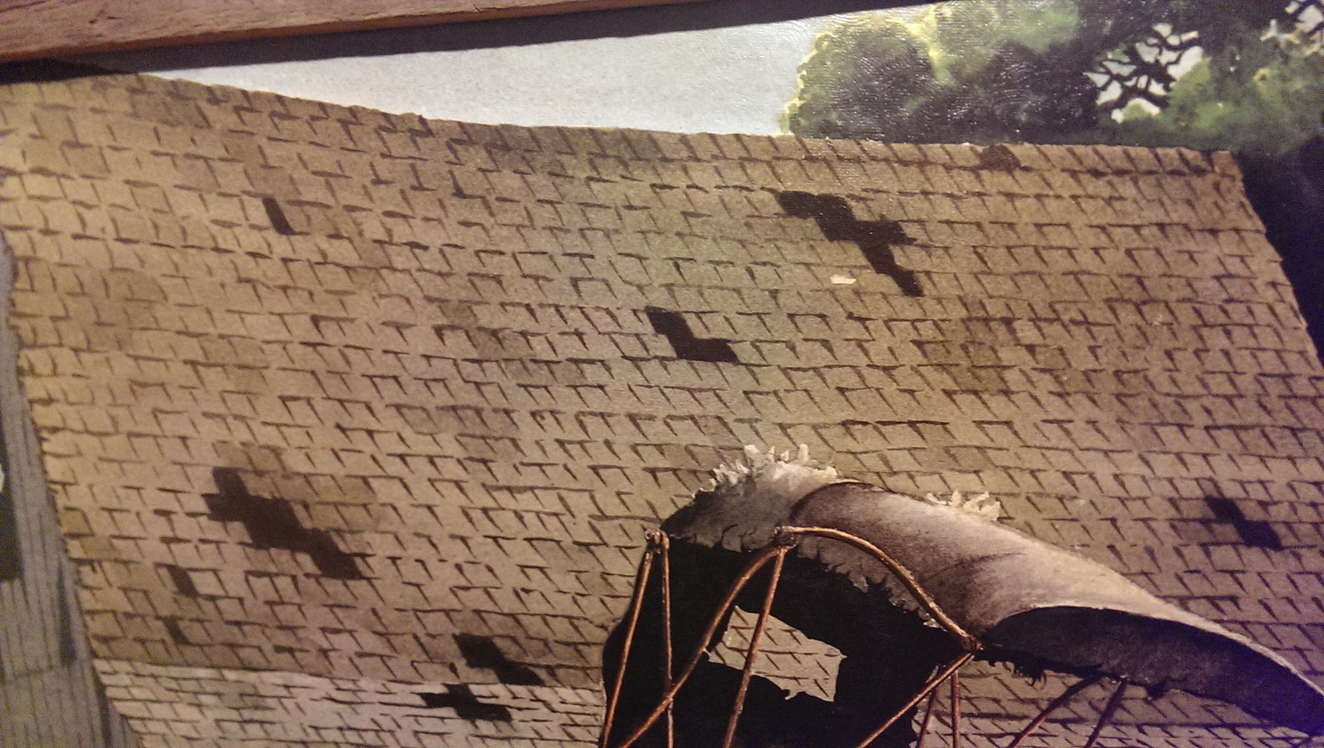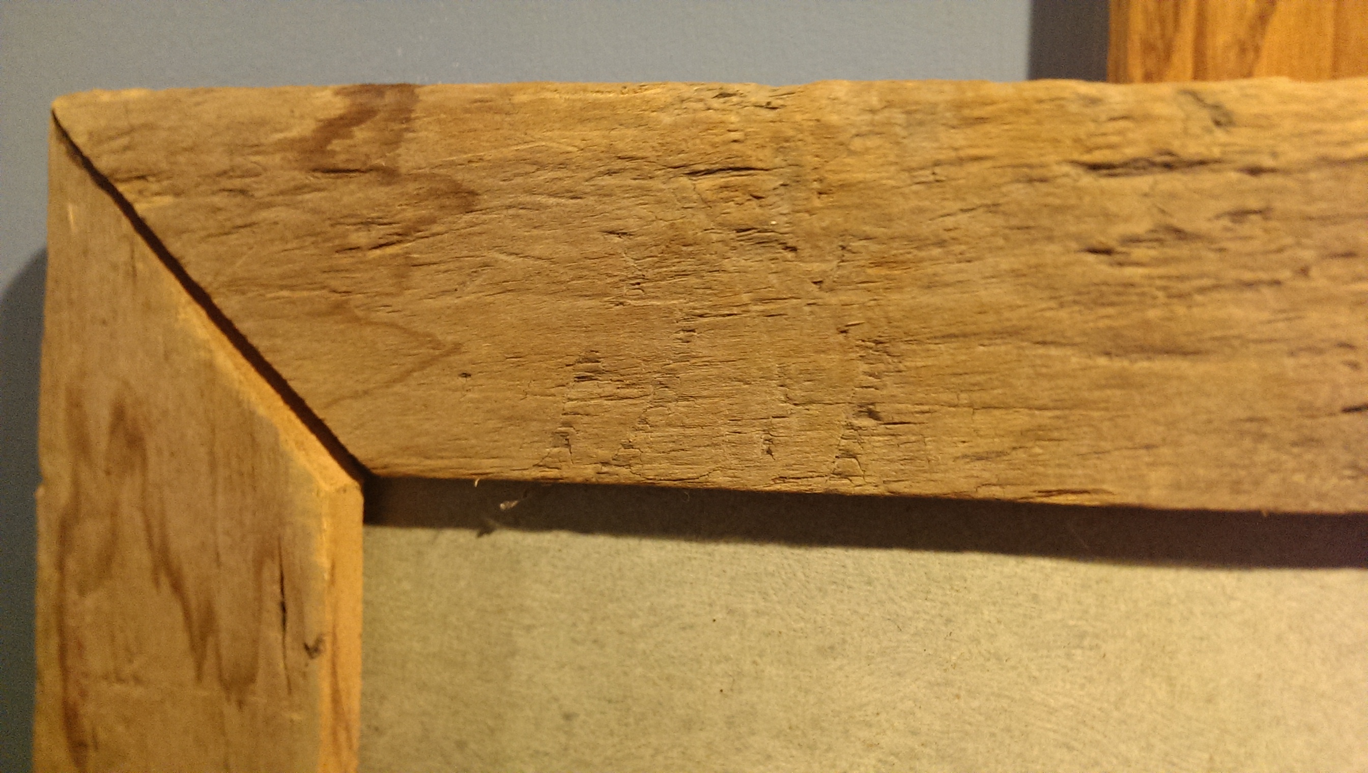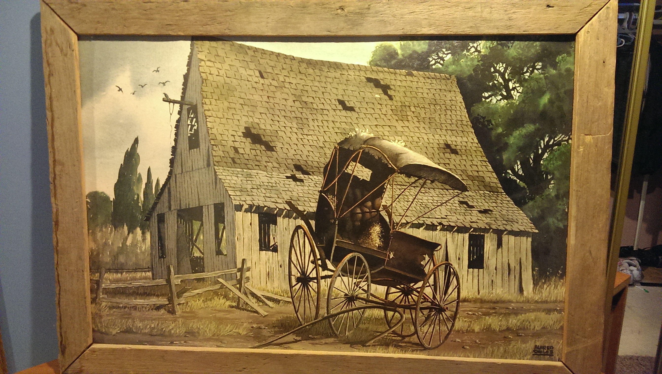 Description It's 34 by 24 and a half size. I purchased at a local resale store in Rockford IL. It's frame is old barn wood it's in great condition.