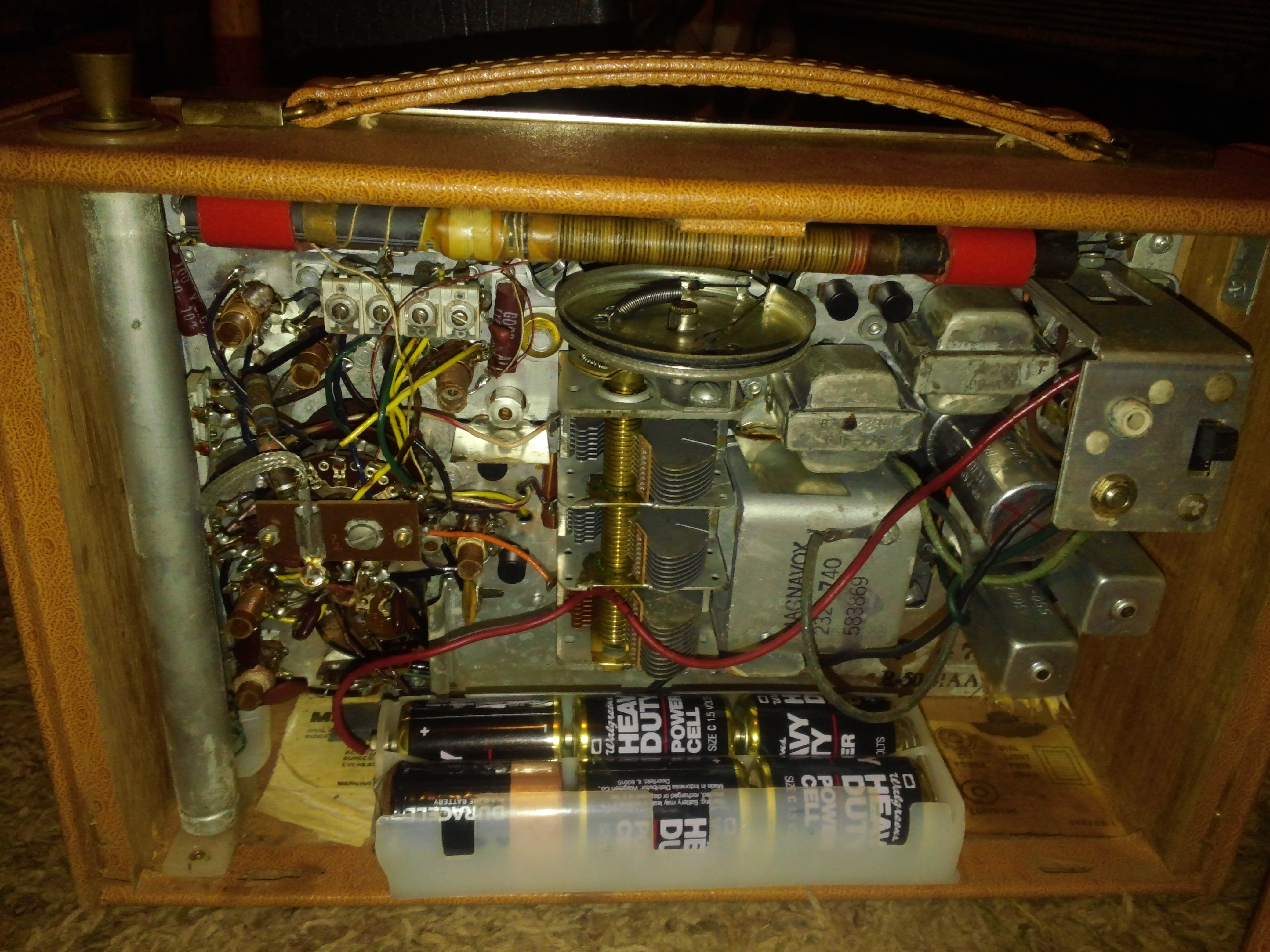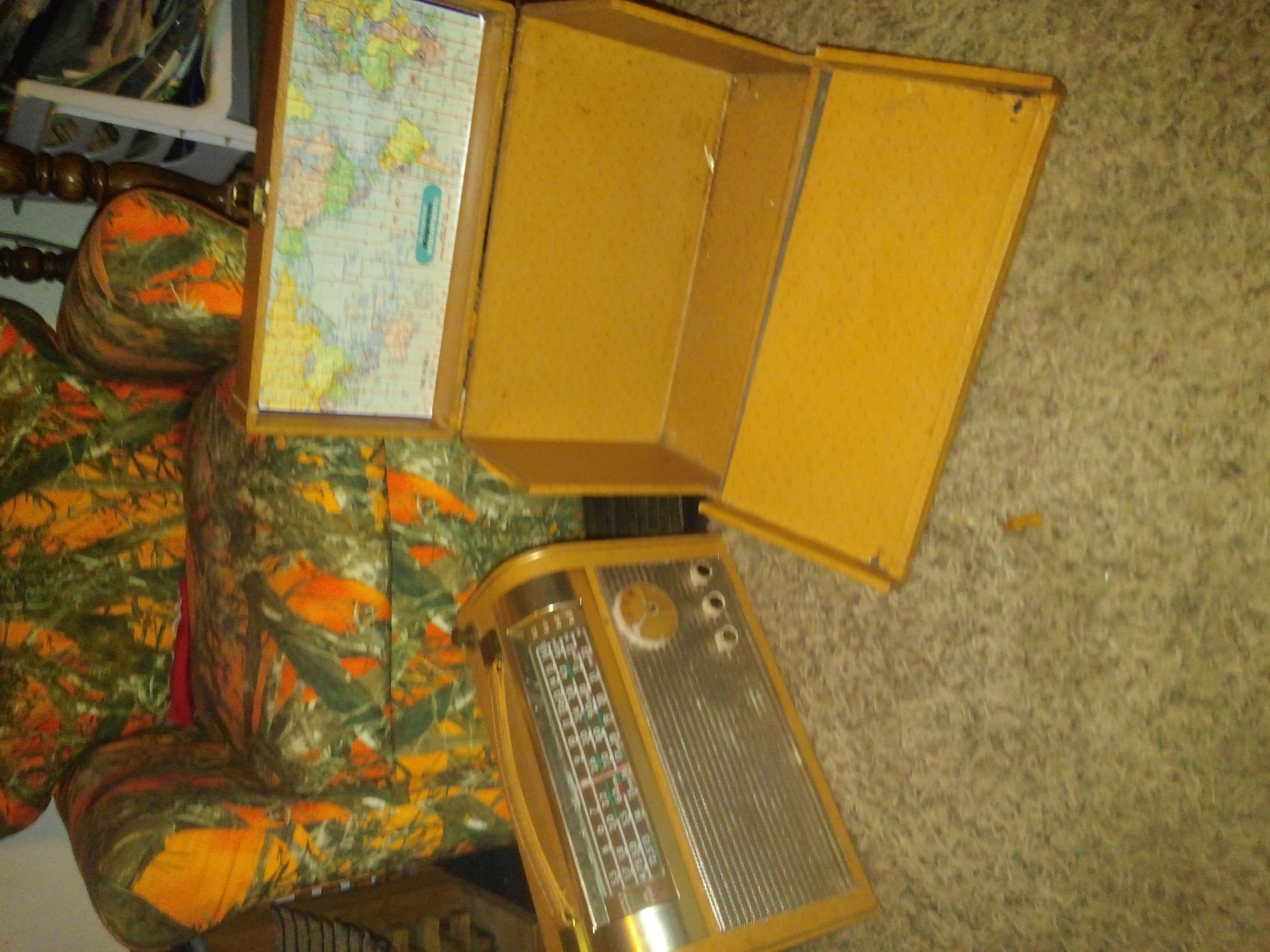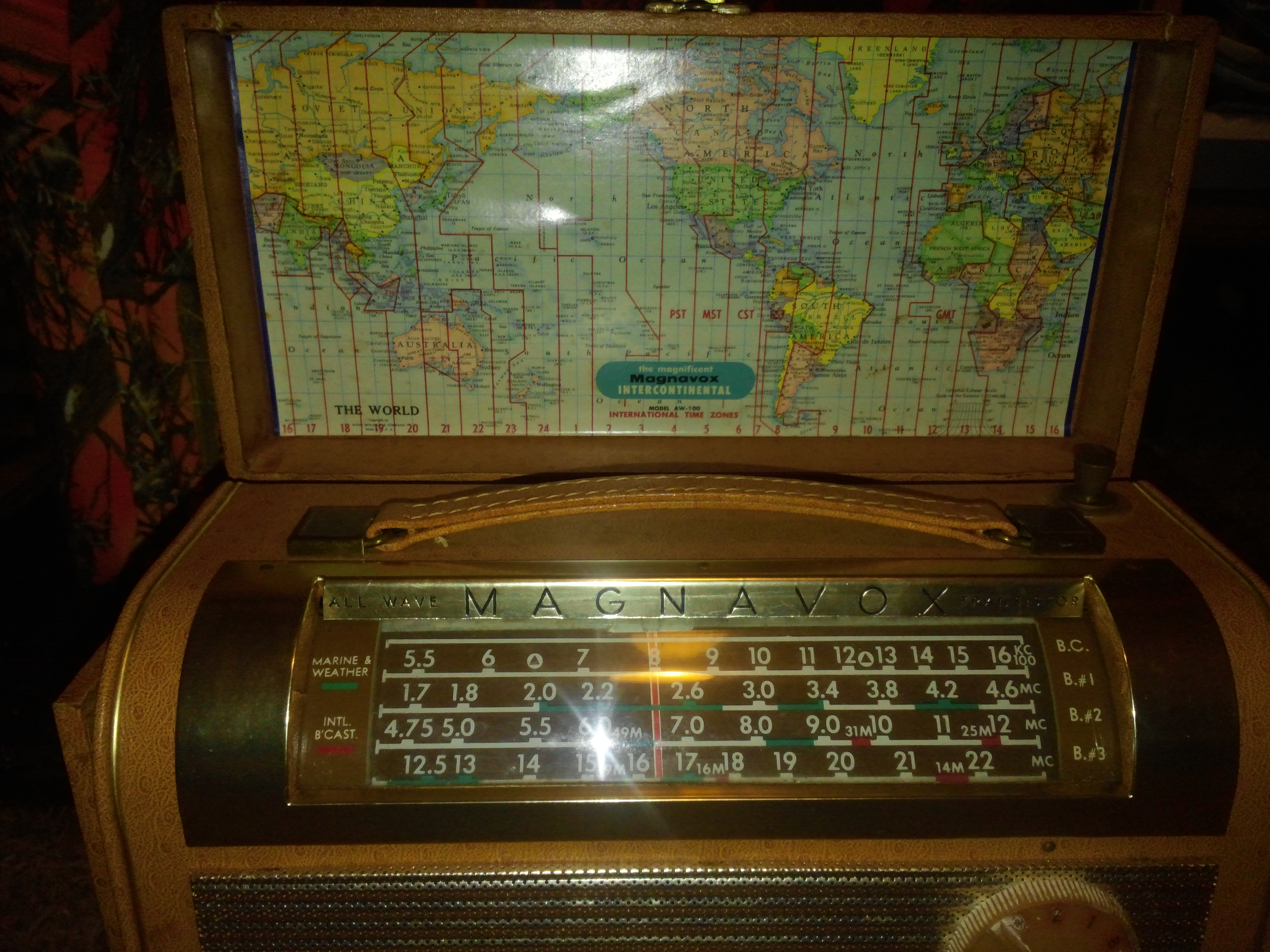This is a working magnavox all wave radio transistor in the carrying case. I dont know anything really about it ,i was told that they were the first all wave transistors to be sold to the public, the first of their kind and that the case ment it was used by a traveling salesman as a display that he used to show people how the radio worked while traveling selling the Magnavox all wave radio transistors .