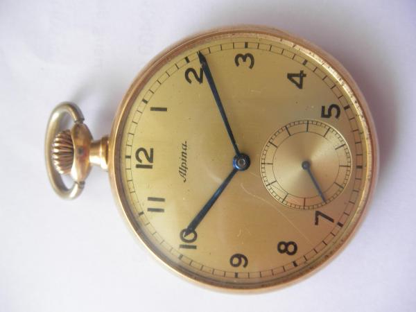 Case is dented on one side, two scratches on face. Inside markings: a crown, the word "Alpina", 0.585 and the numbers 103, 816482, 24. In good working order.