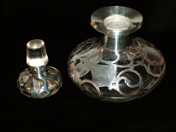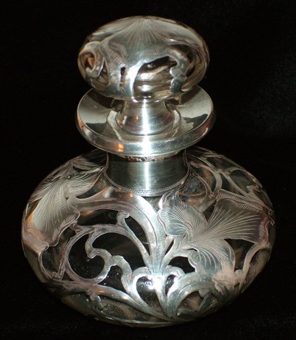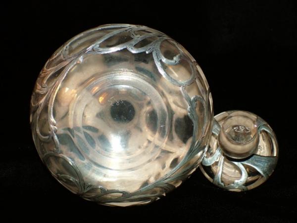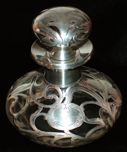 I have a perfume bottle made by the Alvin Manufacturing Company. It has thick Silver overlay that has been tooled. There is a blank cartouche that a monogram could be engraved on. It has two large flowers and lots of vines in the overlay. It is in very good condition...perhaps excellent condition. The stopper and the bottle are marked 285 and so are a matched set. The stopper has a very small chip on the bottom and you can see it inone of the photos I think. The makers mark is really small at just over an 1/8th inch long. The silversmith stuttered when appling the crescent and sword punch. The glass is pretty clear and could be improved by cleaning the inside of the bottle.