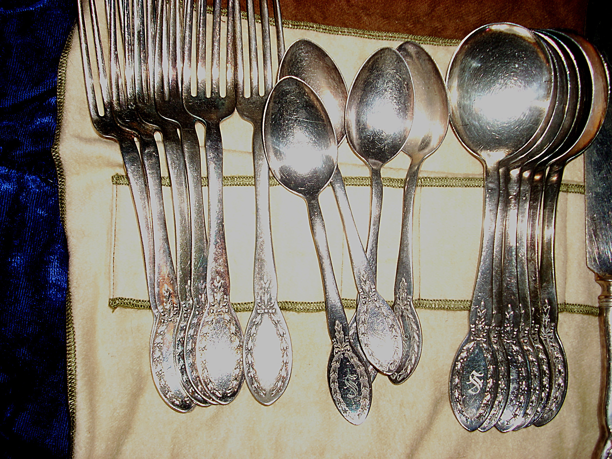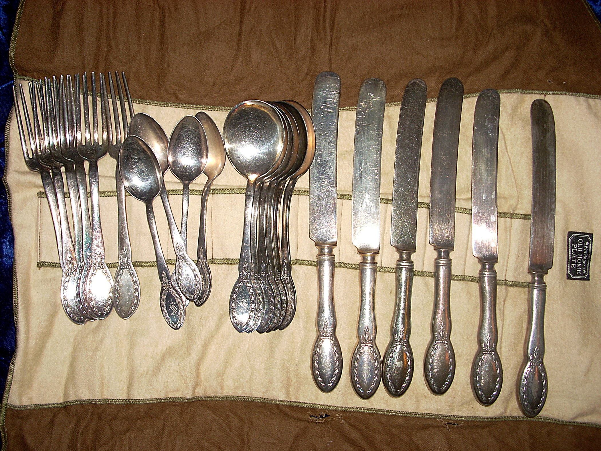 Alvin silverplate place setting for 6. 6 forks, 6 knives, 6 soup spoons, 4 teaspoons. Some, but not all have an "S" monogram. In very good condition, just tarnished. I believe it's the "Diana" pattern of 1910. The set is in a cloth wrapper labeled "Wm Rogers Old Home Plate". This may not be the original wrap since I also have a set of "Old Company" silverplate in a wrapper labeled "John Wanamaker". They could have been switched at some time.