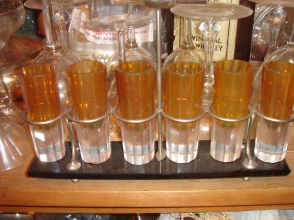 These are 6 crystal shot glasses sitting a metal plastic? base. There are no visible marking neither on the base or on the glasses themselves. The shot glasses themselves are quite heavy for their size. The bottoms are extremely flat and well 'cut'.