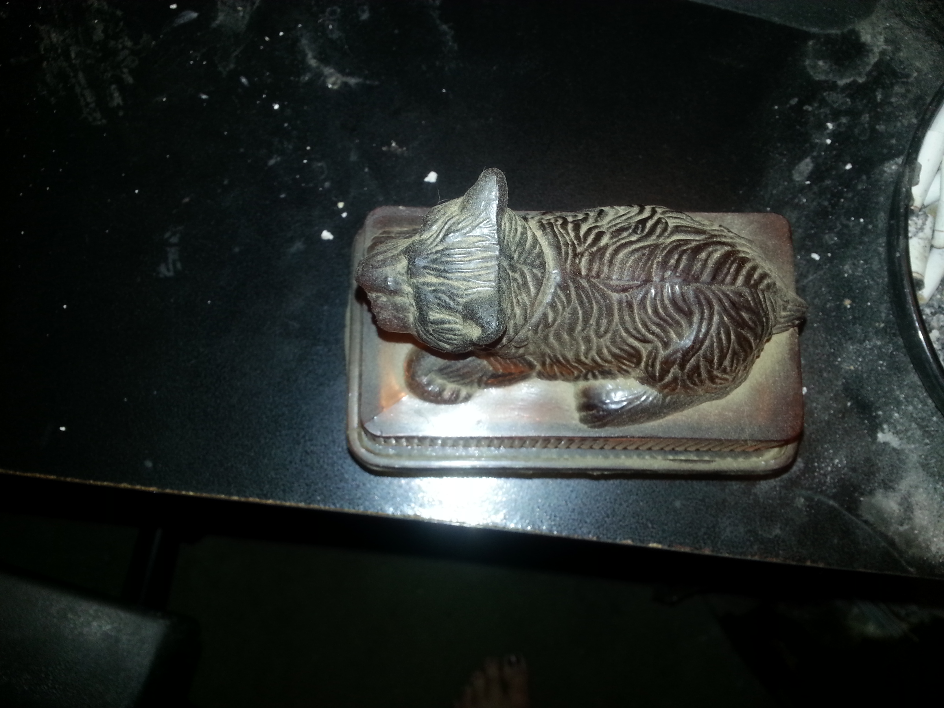 Have had this in the family since the 1930's, it does not have any markings on it as to who, what ,where an when. It is a depression era amber glass box. About 5 or 6 inches long. There is a small dog on top, not placed there but a part of the top. Sorry it is dusty.