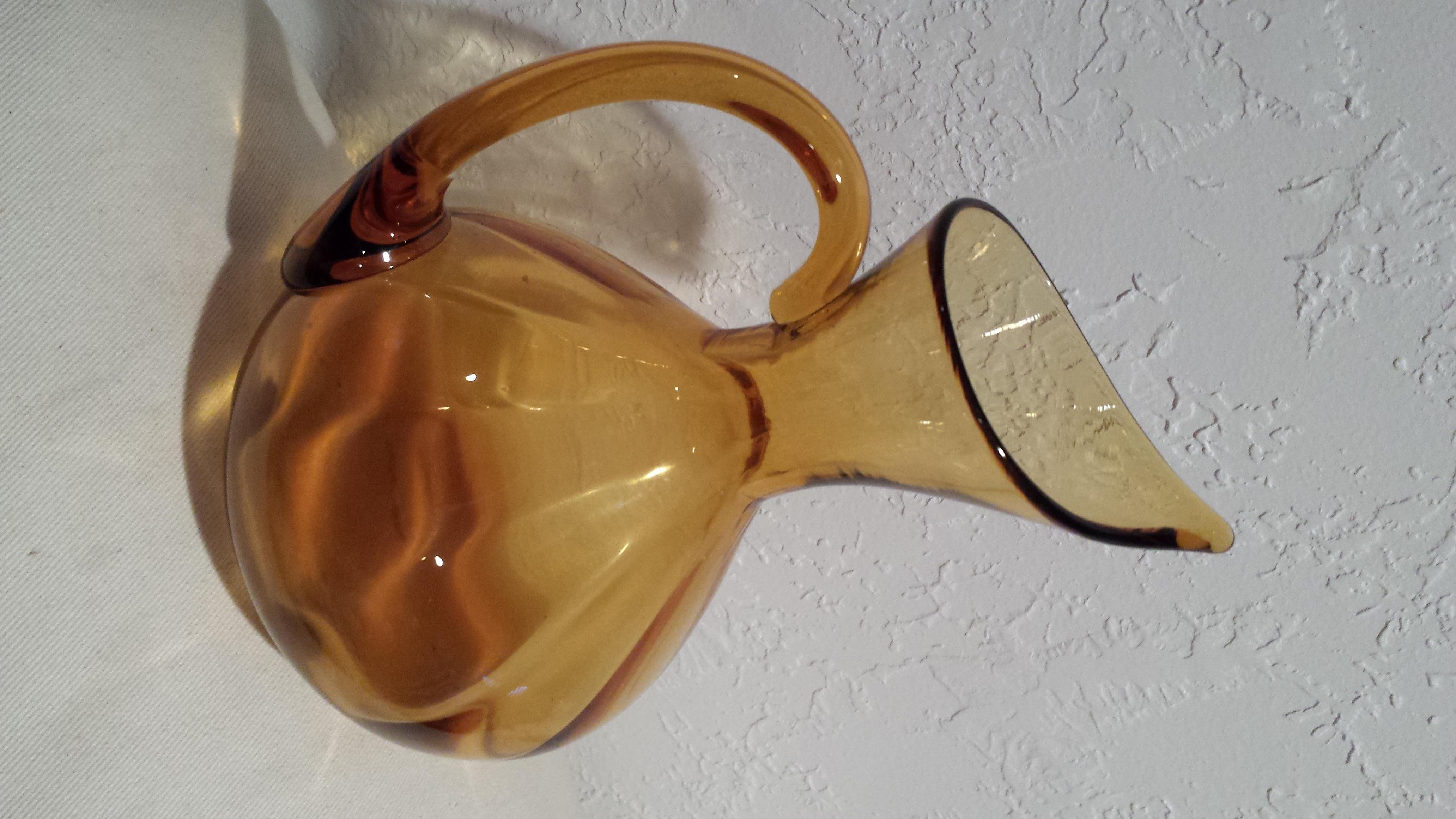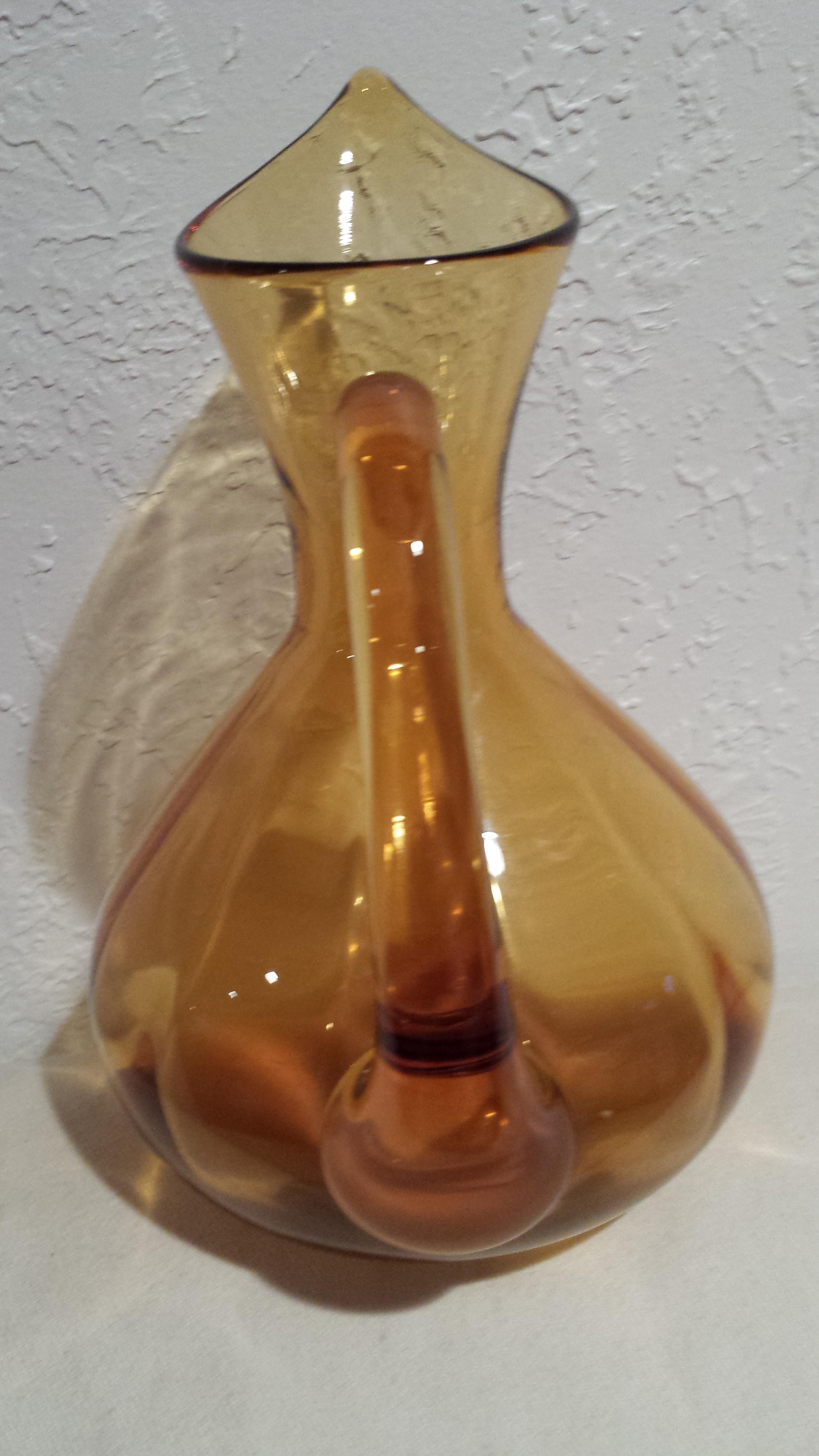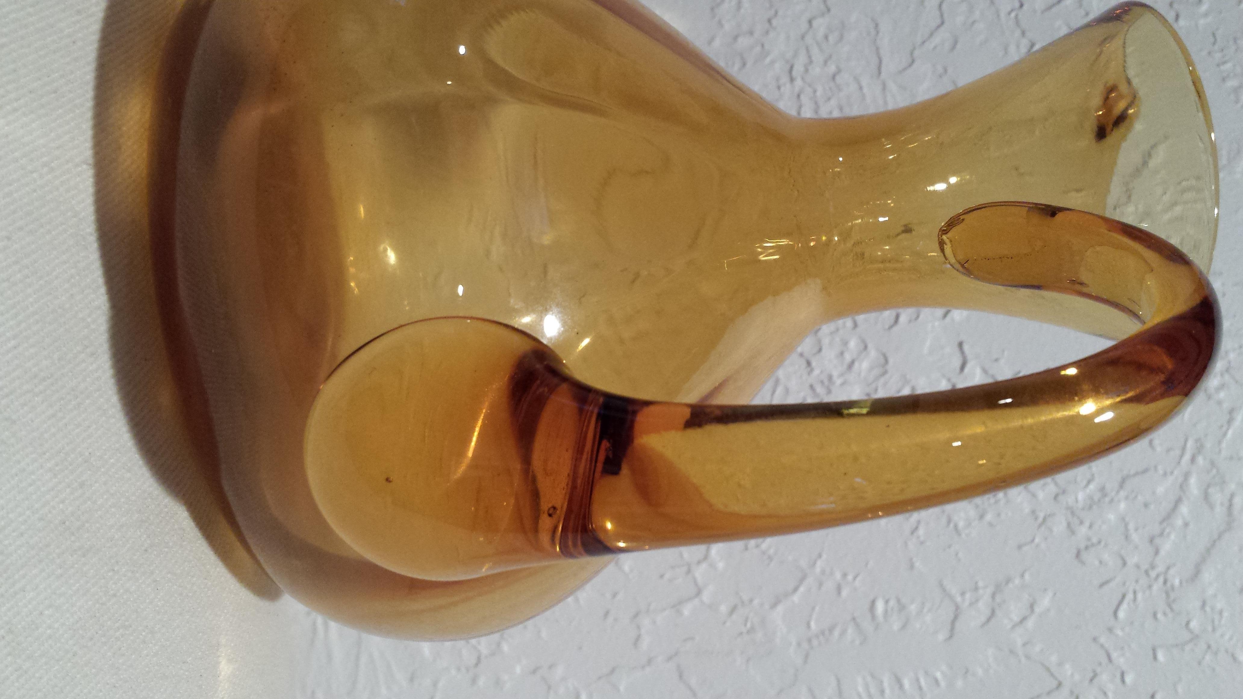 Amber Glass pitcher/vase. Perfect shape. I don't know anything about it. The only marking that I could fine were two small lines side by side on the front of it and something that looks like a acorn or a head?? I tried to get a picture of it (last pic). Thank you.