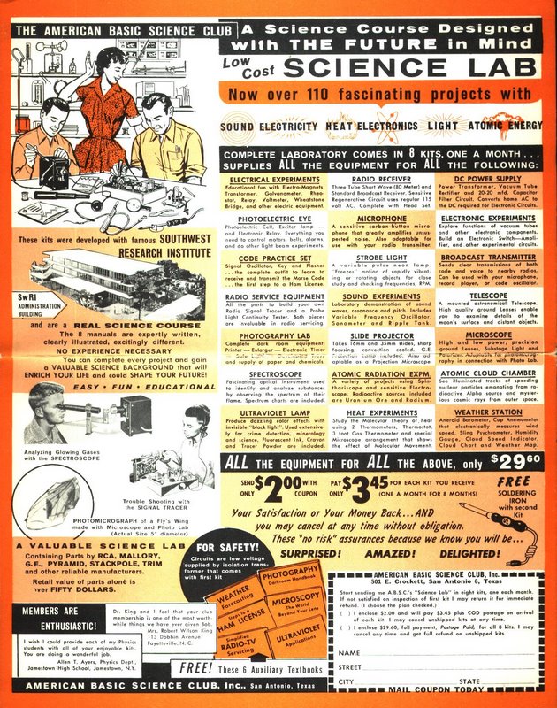 I have all 1-10 of the original "American basic science club" kits, unused, complete, , all in great condition. original packaging.