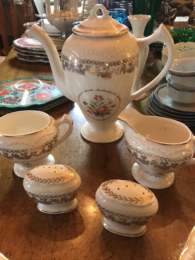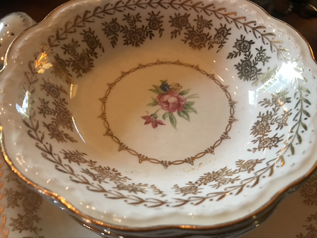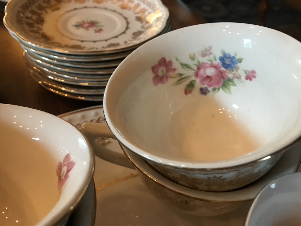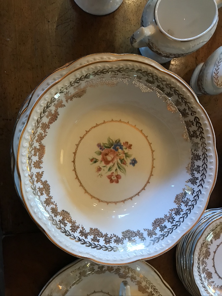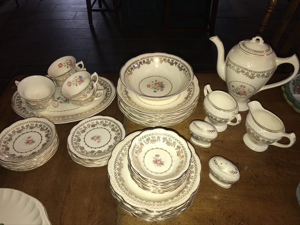 I acquired these from a neighbor who had the items stored from her mother and/or grandmother's estate. All in very nice condition, no chips or cracks. 8 - dinner plates 8 - small plates 8 - large bowls 8 - small bowls 6 - tea cups 8 - saucers 1 - serving bowl 1 - serving plater 1 - salt & pepper shaker set 1 - tea pitcher 1 - creamer boat 1 - sugar bowl