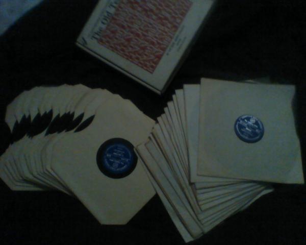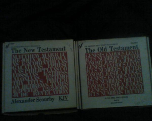 They are all in great condition. They are the new and old testament read by Alexander Scourby. Alexander Scourby was the first person to make a complete recording of the Bible. He originally narrated the King James Version for The American Foundation For The Blind over four years, finishing in 1944. Their original goal was to produce a clean, clear recording for visually impaired listeners. The American Bible Society distributed it as The Talking Bible, a set of 169 records with a running time of 84.5 hours. This recording was eventually released to the general public in 1966 and became a best-seller. It is now part of the Library of Congress' National Recording Registry. This was all I was able to find about the history of these records. The records have brail on the back and writing in the midle on the front. They are in their origonal boxes and sleves. They are meant to be played at 16 and 2/3 RPM.